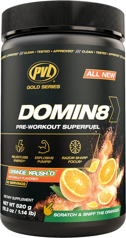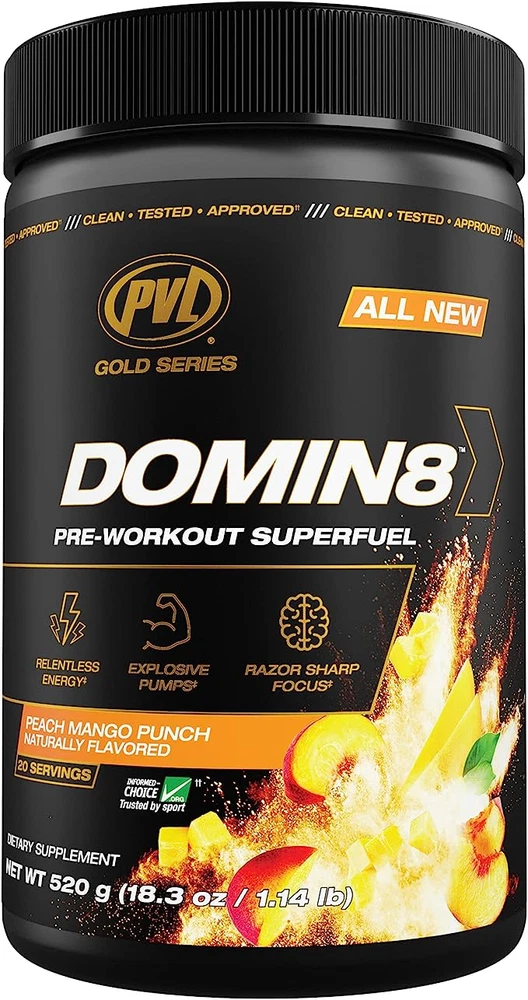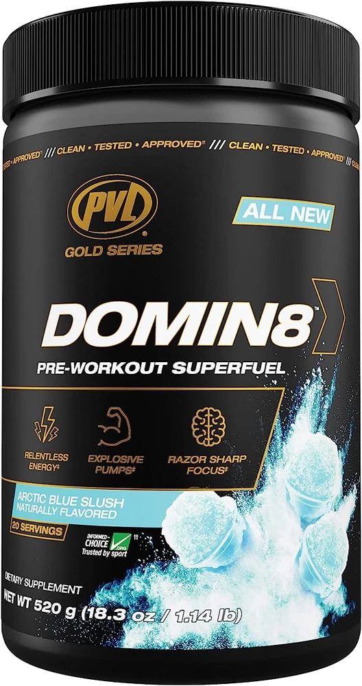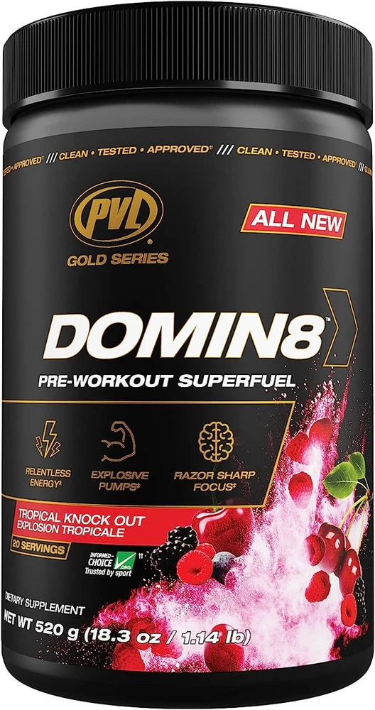 PRE-WORKOUT SUPER FUEL Dominate by definition: “To be in total control. Hold the power to defeat.” Introducing the hardest working pre-workout in the game DOMIN8. A research driven complex of 8 mission critical ingredients, fully loaded to deliver euphoric energy & focus that sets a new standard. Time to bring it, drive it, energize, lift, push & power through like never before! You’re one scoop away! GREATNESS AWAITS. DOMIN8. Features the “Dynamic Duo” Power Pump Blend. 8g L-Citrulline Malate Boosted by Nitrosigine 8g L-Citrulline Malate Relentless Strength & Energy – 2 Stage Timed Release Caffeine Boosted by Nitrosigine Blend + Beta-Alanine Game Ready Neuro Loaded Complex for Razor Sharp Focus – Lions Mane + Tyrosine Hydration & Pump – Pink Himalayan Salt & Aquamin – Natural Electrolytes Built for the Best! Informed Choice Tested – Safe for Sport