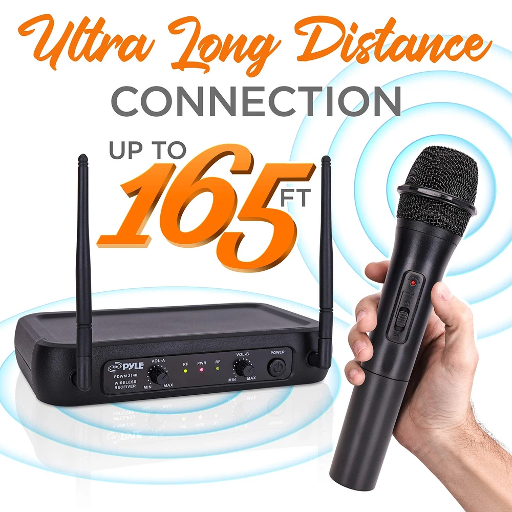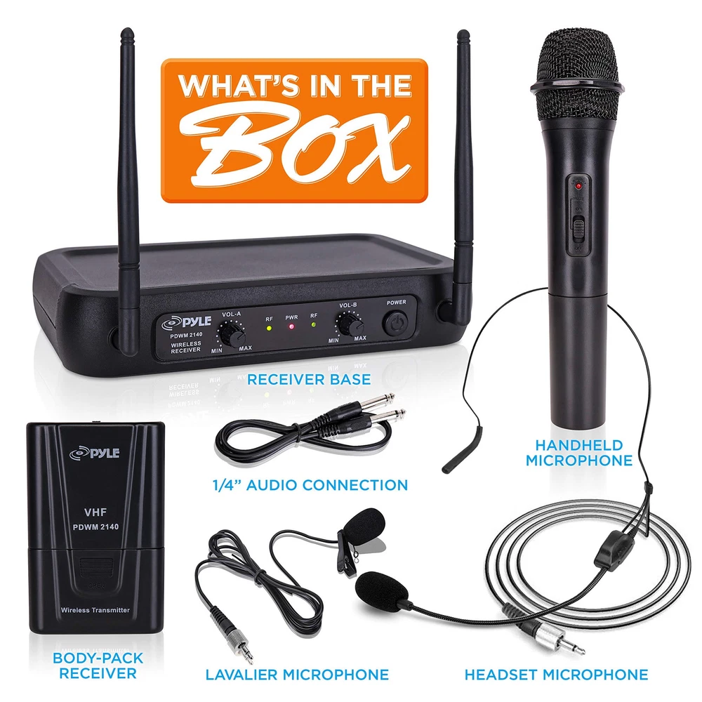 PYLE Lavalier, Headset Mics, Transmitter, Receiver-for PA, Karaoke Dj Party, Black, One Size (PDWM2140) DUAL CHANNEL: This black wireless microphone system by Pyle Pro has dual frequency channel and broad audio response range with low distortion so you can enjoy cordless singing to karaoke music and mobility for energetic on stage performance STABLE SIGNAL & CLEAR SOUND: This professional portable wireless microphone set has a channel frequency range of 174~216MHz and high signal over noise ratio performance for capturing high quality audio. Ideal for professional engagement, conference INDEPENDENT MIC VOLUME CONTROL: Each dynamic or clip lapel lav mic features its own volume control so you can balance the vocals as desired for a karaoke experience that both kids and adults will enjoy. Perfect for PA, Dj party CONVENIENT POWER SWITCH: Both the receiver and the dynamic mic has a power ON / OFF switch and the receiver has LED signal indicator light and dual independent antenna. Plug your unit into your mixer, amplifier, or speaker with a 1/4" mono cable WHAT'S IN THE BOX: The package includes a receiver base, handheld, lavalier and headset microphone, body pack transmitter, 1/4'' audio connection cable. The device can be used outdoor and indoor / personal home use