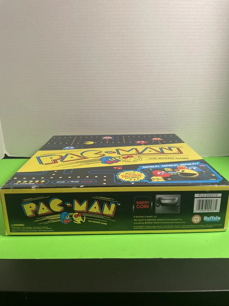 The product is the "Pac-Man The Board Game" by Buffalo Games from 2019. It is a complete board game that includes classic arcade sounds. It is designed for 2 or more players, with an age range of 8 years and older, making it suitable for both kids and adults who enjoy the iconic Pac-Man arcade game.