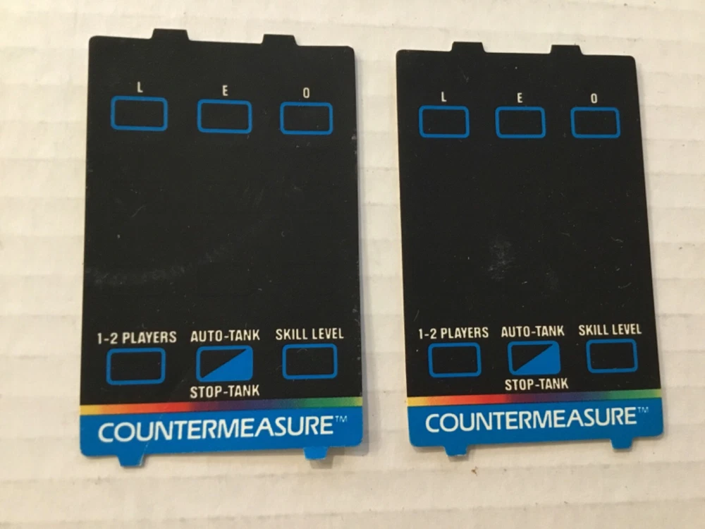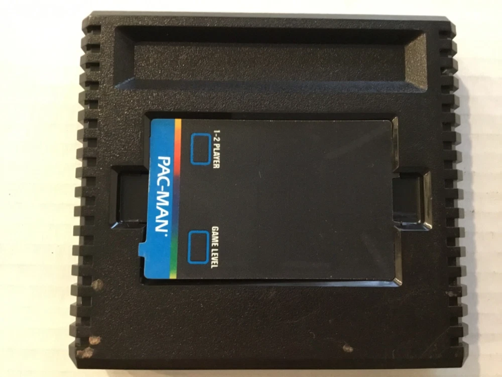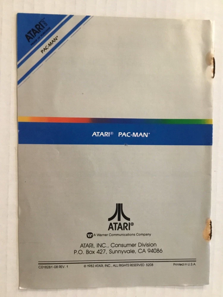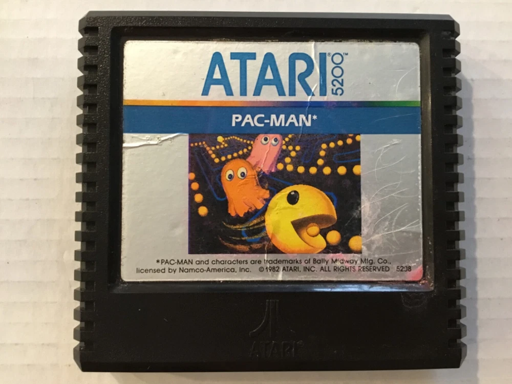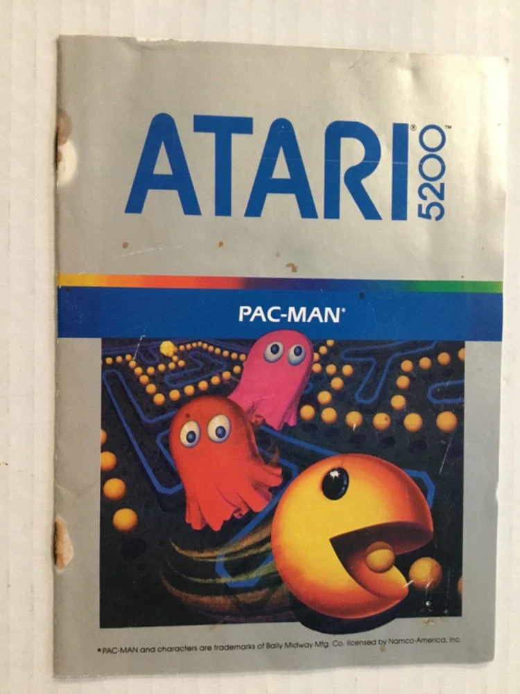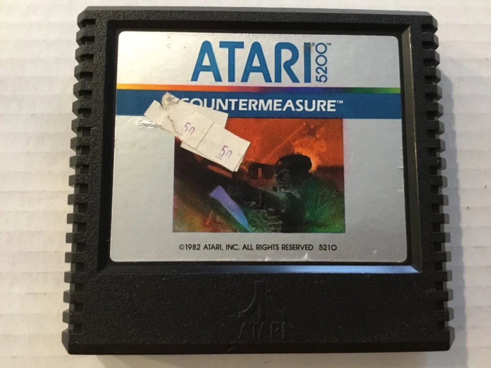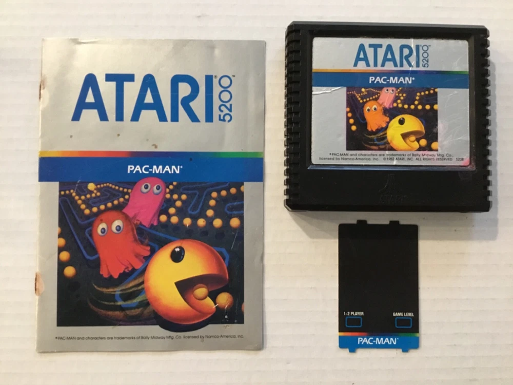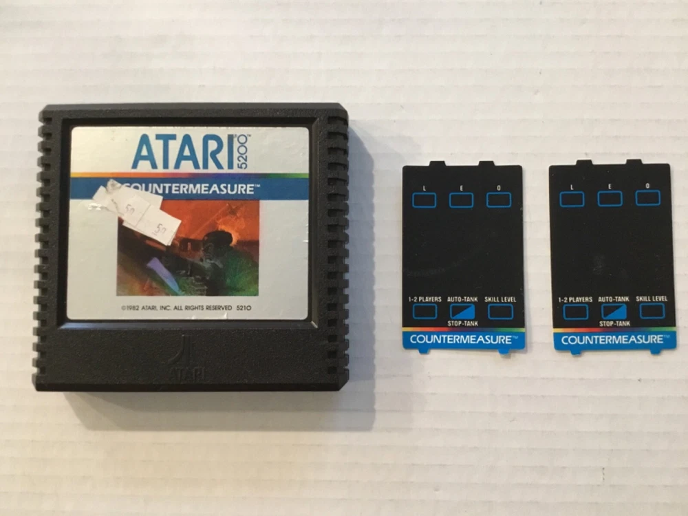 Pac-Man & Countermeasure Atari 5200 Video Game Cartridges, 1982 & 1983. Includes: Two game cartridges and Pac-man instruction manual only (no manual for Countermeasure), and three controller overlays (one for Pac-Man, two for Countermeasure). The game cartridges have not been tested. The Pac-Man cartridge has creases, stains, and scratches on the front label. There are stains on the back lower corner, and there is dust in some areas. There is one Pac-Man game controller overlay which has some scuffs and scratches. The Pac-Man instruction manual has scuffs and scratches on the front and back, with stains on the spine and front and back covers. The Countermeasure cartridge has some scuffs, scratches, small creases, stains, and old retail stickers on the front label. The two controller overlays have some scuffs and scratches, too. See photos. Sold “As Is”.