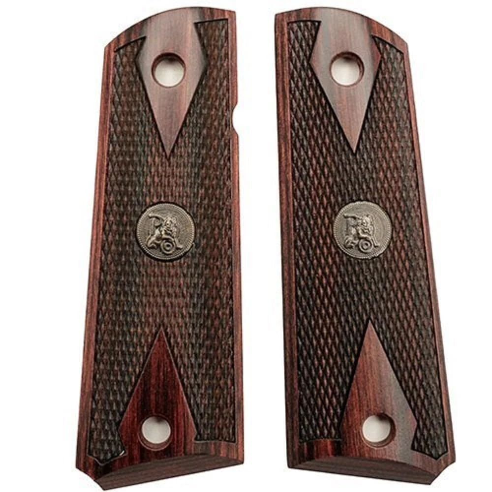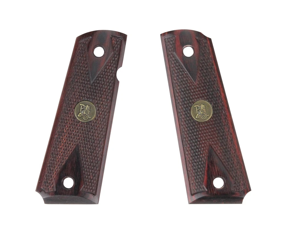 Pachmayr rosewood grip panels are hand matched to improve the style of any full-sized 1911. They are laser cut with precise checkering to improve the handling as well. Crafted in tough Dymondwood laminate, they carry tasteful Pachmayr medallions on both sides and are offered in double-diamond or half-checkered patterns. Pachmayr has also crafted-in important additional features like notches for ambidextrous safeties and a beveled grip bottom with a cut-out for the mainspring housing pin. Specifications: - Fits: Colt 1911 - Color: Double Diamond Rosewood - Weight: 3oz Highly polished rosewood laminate grips that provide a timeless look and perfectly accent blued and stainless handguns Superior Fit- Pachmayr Renegade wood grips are machined to exact specifications and will not wobble or shift on the handgun's frame Grip Texture- Double diamond checkering provides enhanced traction offering the user more control when drawing, and while firing Fits- 1911 Govt. and Commander sized pistols from manufacturers like: Colt, Kimber, Springfield Armory, Remington, Sig Sauer, Ruger, Rock Island Armory, Smith and Wesson, and more Warranty- We stand behind our high quality gun grips with a Limited Lifetime Warranty