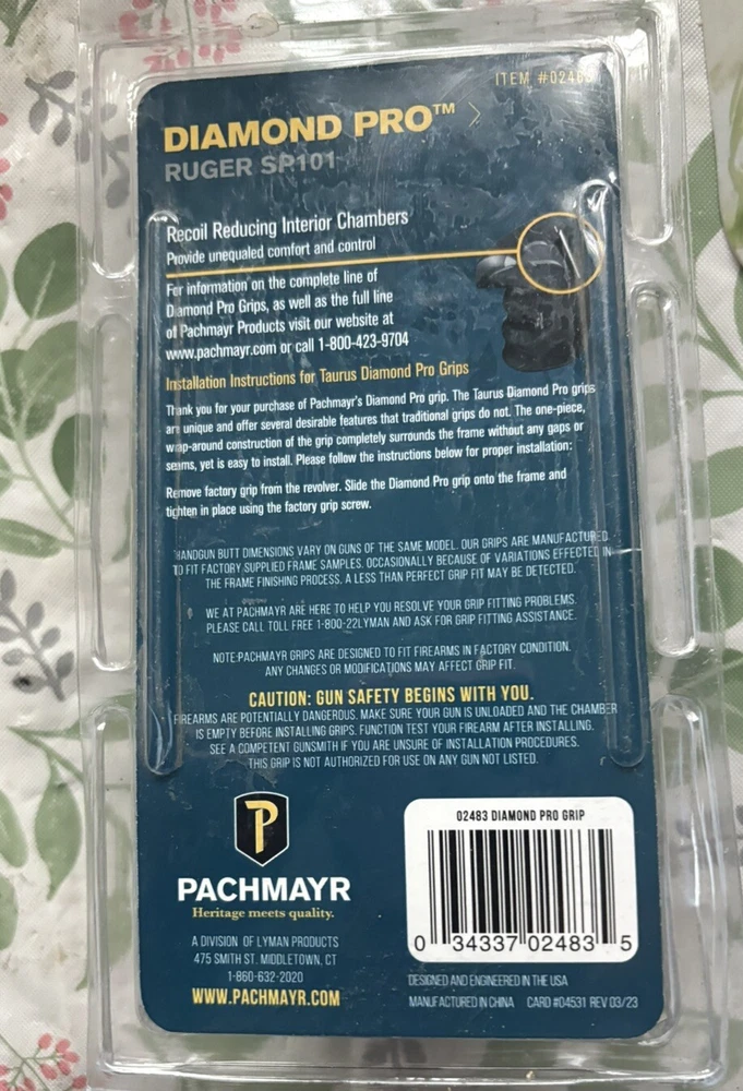 Pachmayr Diamond Pro Ruger SP101 Revolver Grips in Black are made of rubber with features like reduced recoil and shock absorption. These low-profile handgun grips are designed for Ruger SP101 revolvers, offering improved handling and comfort during shooting. Made in China, these grips provide a secure hold and enhance the shooting experience. Open box