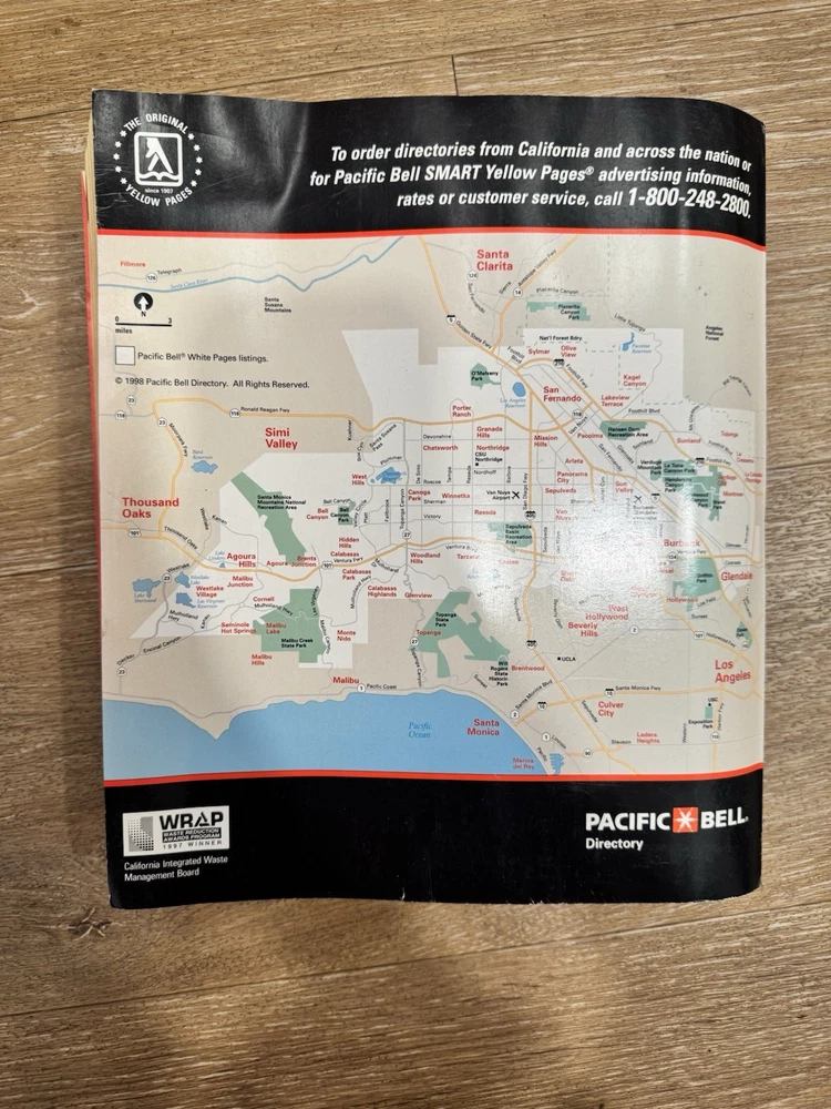 Original Pacific Bell White Pages directory for San Fernando Valley, including Glendale and Burbank (Area Code 818, 1998 edition). A vintage phone book from the pre-internet era featuring residential listings, names, addresses, and phone numbers. Condition is used – cover shows wear, creases, and some bending, pages are intact and readable. Great as a retro collectible, decor piece, or prop. Sold as-is, no returns.