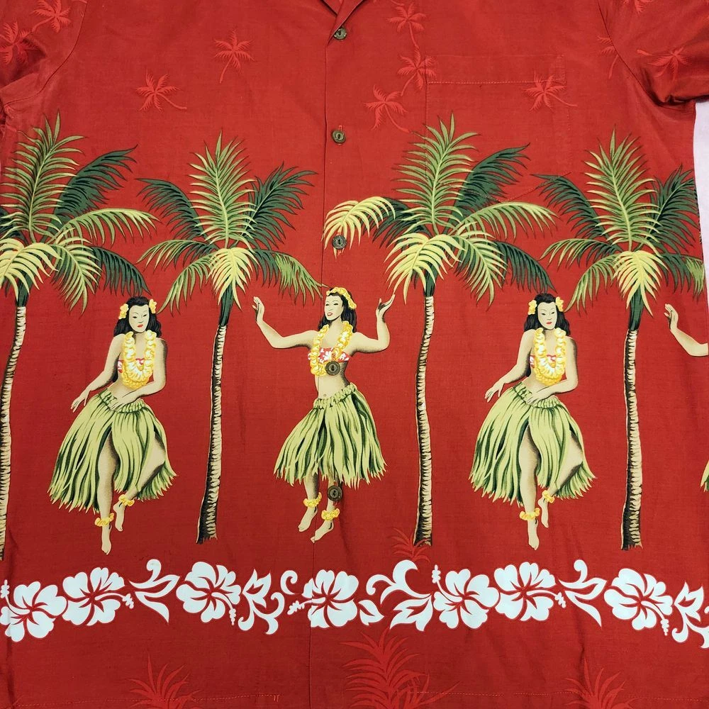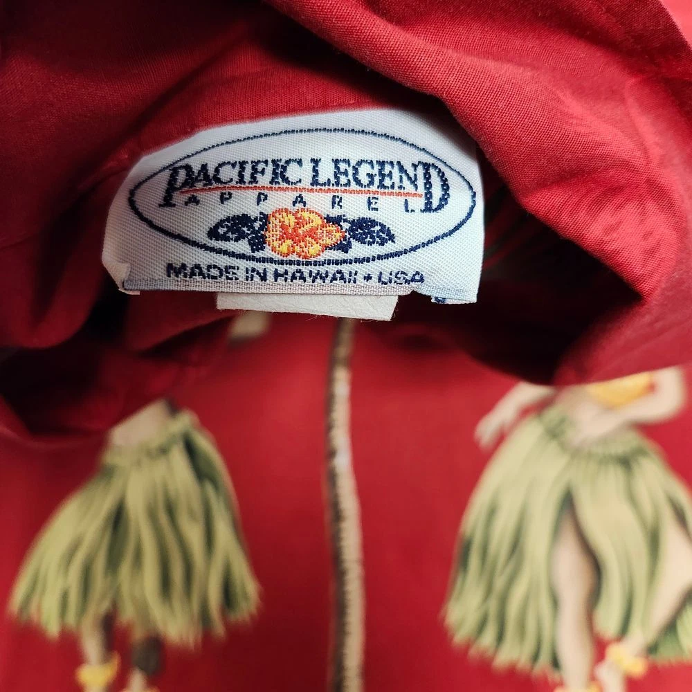 Transport yourself to a tropical paradise with this vibrant Pacific Legend Hawaiian shirt. Featuring a stunning red backdrop adorned with graceful hula dancers, swaying palm trees, and a hibiscus flower border, this shirt embodies the spirit of aloha. Perfect for beach vacations, luaus, or casual Fridays, it's sure to turn heads and spark conversations. Embrace the laid-back island lifestyle and make a bold statement at your next summer gathering or themed party. Sleeve Length: Short Sleeve Color: Red Department: Men Type: Button-Up Pattern: Tropical Fabric Type: Woven Closure: Button Accents: Printed Features: All Seasons, Contrasting Trim Material: Cotton Fit: Regular Character: Hula Dancer, Tropical Figure Collar Style: Spread Neckline: Collared Keywords: Hawaiian shirt, Aloha shirt, Tropical print, Hula dancer, Palm tree, Hibiscus, Beach wear, Vacation attire, Luau, Summer fashion, Pacific Legend, Button-down, Short sleeve, Red shirt, Novelty print
