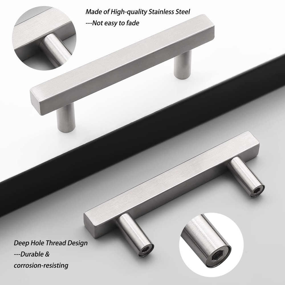 Material:Stainless Steel;Finish:Satin Nickel; Hole Centers:76mm(3inch);Overall Length:127mm(5inch);Width:12mm(1/2");Height:35mm(1.4") Strong & Durable Furniture Hardware: Popular Modern Style T Bar Cabinet Pulls, will fit any cabinet styles.Perfect for kitchen cabinet, furniture door, cupboard, desk drawer, wardrobe drawers, shoe cabinet, chest, bookcase and much more. Easy to Install with Included Screws,2 size screws include:1inch(25mm) 1.8inch(45mm),If your drawer/door is thicker,you can buy longer screws from . Package Includes: Selected Handles, Mounting Screws, Installation Instructions;please check these parts before install,If there is any quality problem with your purchasing, please us. We will the item value or send a .