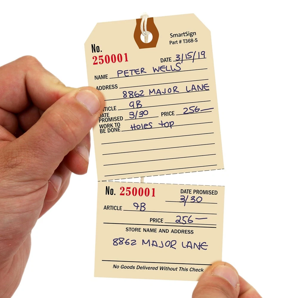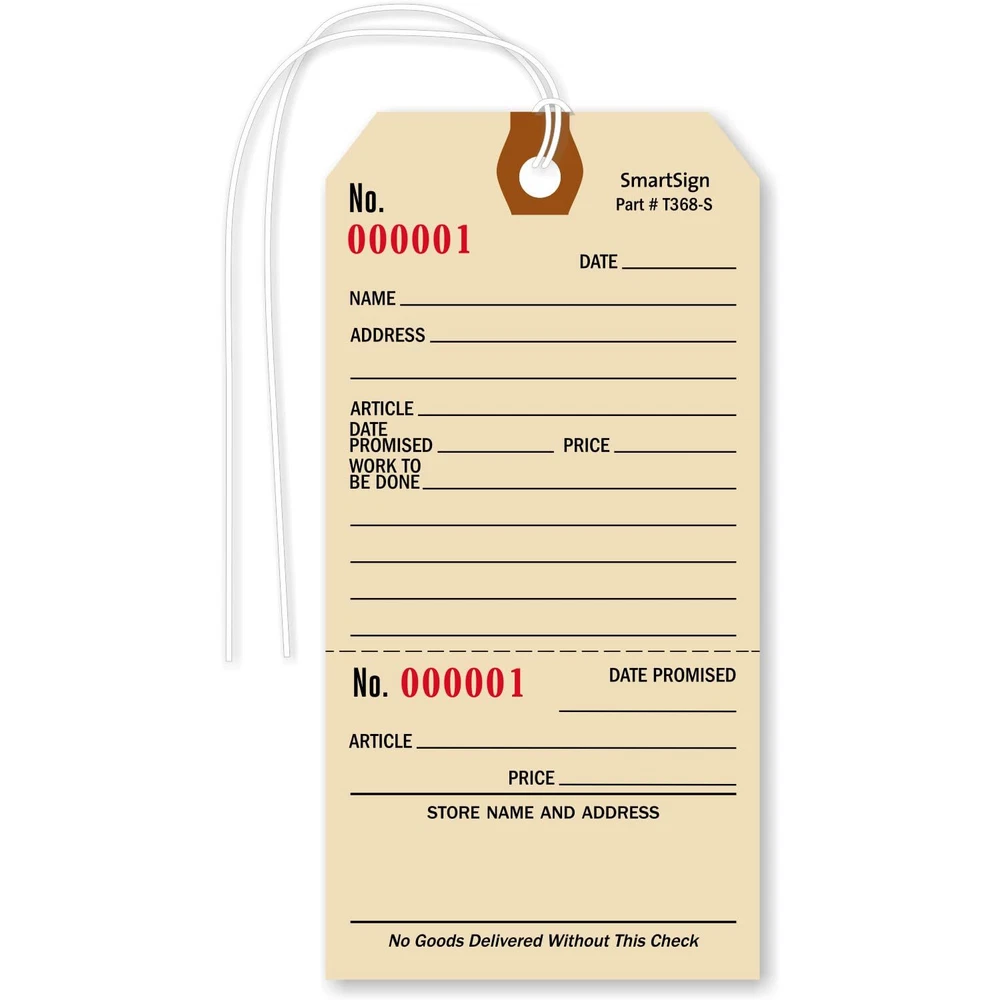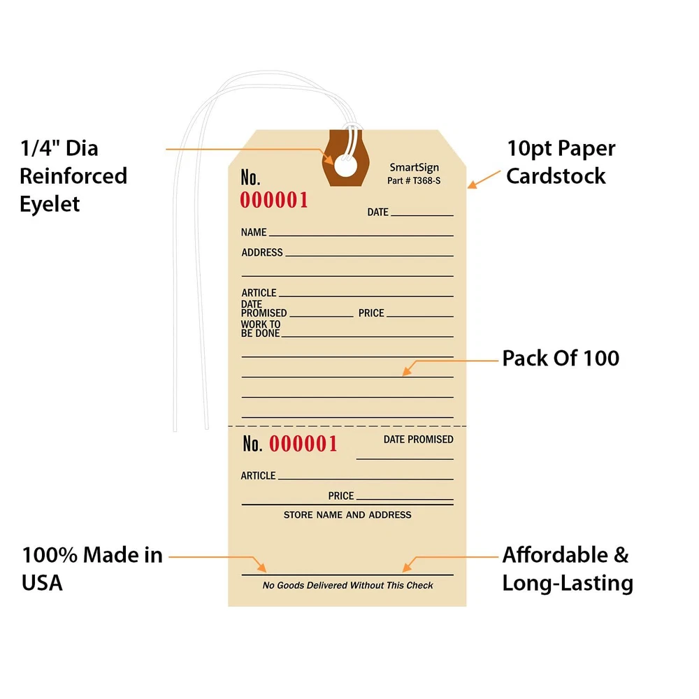 Industry Leading Durability Manila Tags are made of thick 10pt cardstock with a fiber reinforced patch around the 1/4" diameter eyelet for extra pull-strength. Each tag has a corresponding tear-off stub and pre-attached string. Unlike other tags, our Manila Tags with Stub have a writeable surface to note down details of the article. Cardstock is suited for indoor applications. USA's Oldest Tag & Sign Manufacturer Family owned since 1918, we take immense pride in our signage. Being one of the oldest certainly means we know this business in and out. Our South Dakota factory is the oldest manufacturer of outdoor signs in the USA. We have been an integral part of safety and convenience our signs, labels, and tags have provided over the years. Ideal For Recordkeeping Tag helps you write important information regarding the article. Pre Numbered Tag and tear-off stub is pre-numbered with the same serial number. Each tag will have a unique, sequentially arranged number, even if you order several packs. DURABLE: Repair Tags Size-6 are made of 10 point cardstock, an industry standard for durability. CONVENIENT USE: Manila Repair tag comes with a sturdy reinforced eyelet and a pre-attached string. Not recommended for outdoors. TEAR-OFF STUB: Organize your repair tag work with serialized tag with a handy tear-off stub. Tear-off stub has the same serial number as the tag - to make it easy to track and find the item. MADE IN USA: All components are made in the USA and offer superior quality. PACK CONTENTS: Pack of 100 - 5.25 x 2.625 inch manila cardstock tags with pre-attached wires.