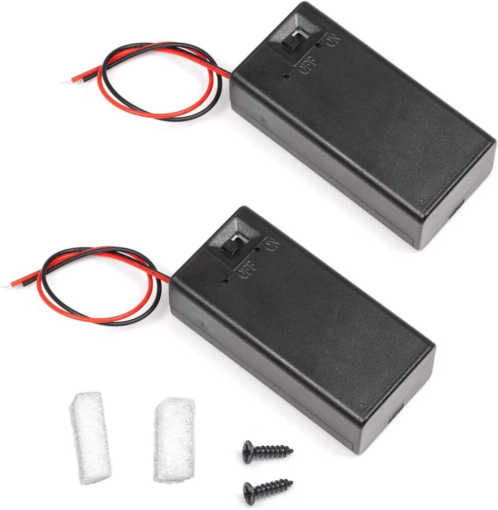 (Pack of 2) 9v Battery Holder, 9 Volt Battery Holder with Switch, 9v Battery Case with Switch Product Details Product Dimensions: 2.66 x 1.3 x 0.84 inches Item Weight: 0.673 ounces Item model number: 9V-Switch-2PC Batteries: 1 9V batteries required. Manufacturer: LAMPVPATH Number of Batteries: 1 9V batteries required. Brand: LampVPath Unit Count: 2 Count Voltage: 9 Volts Reusability: Rechargeable Battery Holder Type: 9v battery holder with switch, 9v battery holder with on off switch Battery Holder Voltage Output: 9V, 1 x 9v battery holder= 9 volt battery holder with leads; Battery Holder Switch Function: ON/OFF switch on 9 volt battery case holder 9 Volt Battery Holder Dimensions: (L*W*H)/2.657" x 1.299" x 0.835"/6.75cm x 3.30cm x 2.12cm Wire Leads: 9v battery holder with leads, tinned wire end; Wire Length: 5.8"/14.8cm; Cable Diameter(count in the PVC isolation around the wire): 0.0433"/1.1mm; Cable Color: red and black One 9v Battery Holder and One Screw Weight: 0.674oz/19.1g; Package Contents: 2Pcs battery holder 9v, 2Pcs screws for 9 volt battery holder with switch Brand Name: LAMPVPATH Specification: Battery Type: 9v battery holder with switch, 9v battery holder with on off switch Battery Holder Voltage Output: 9V, 1 x 9v battery holder= 9 volt battery holder with leads 9v Battery Holder Switch Function: ON/OFF switch on 9 volt battery case holder 9 volt Battery Holder with Leads: 9v battery holder with leads, tinned wire end Wire Length of 9v Battery Holder: 5.8"/14.8cm Cable Diameter(count in the PVC isolation around the wire): 0.0433"/1.1mm Battery Holder Cable Color: red and black Dimensions of 9 Volt Battery Holder with Switch:(L*W*H)/2.657" x 1.299" x 0.835"/6.75cm x 3.30cm x 2.12cm Weight of 9v Battery Case with Switch: 0.674oz/19.1g (one 9v battery holder and one screw weight) Box Color of 9v Battery Holder with Switch: black Material of 9 volt Battery Case Holder: Plastic ABS Screw Size: 0.303" x 0.0787"/7.7mm x 2.0mm(Length*Diameter) Package Contents: 2x 9v battery holder with on off switch 2x screw for 9 volt battery holder