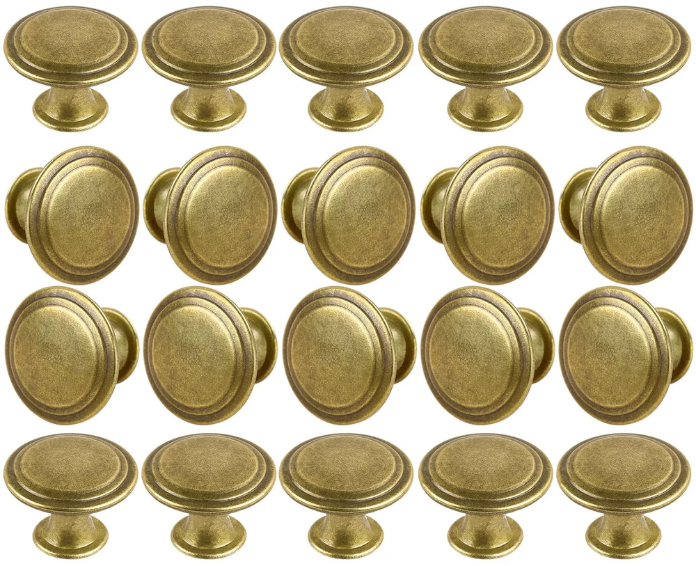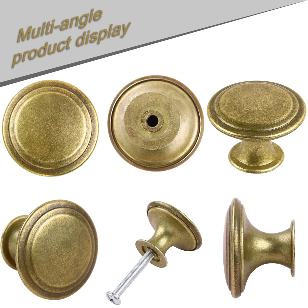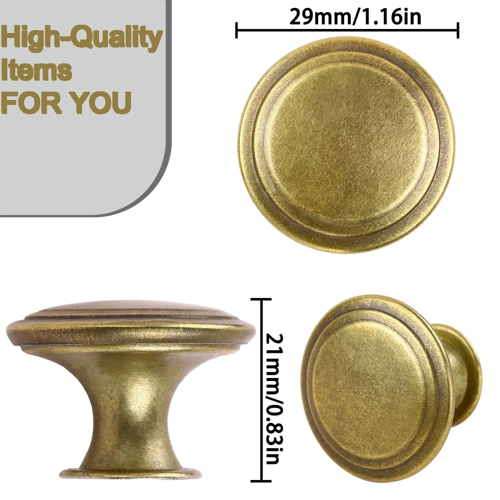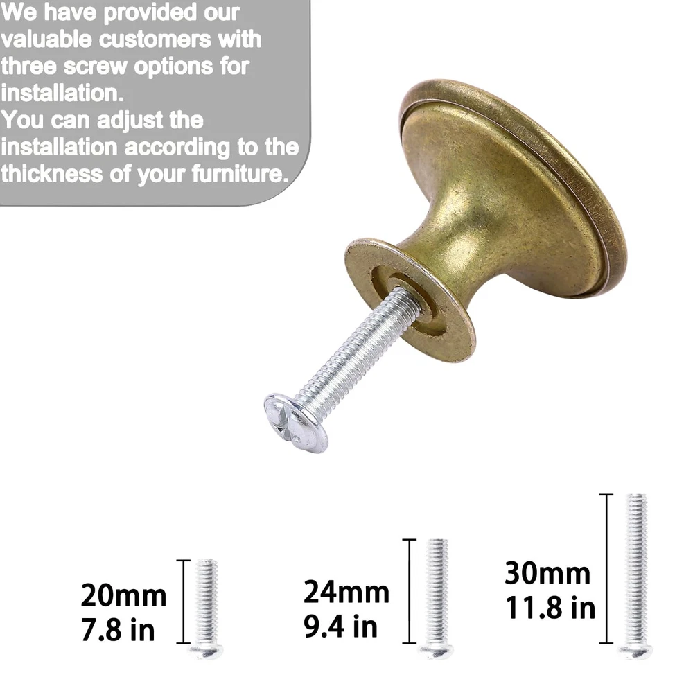 knobs Durable Material: These cabinet knobs have a durable alloy construction, combines beauty and function. Modern Design: Perfect addition to any kitchen cabinet, furniture door, cupboard, desk drawer, wardrobe drawers, shoe cabinet, chest, bookcase and more. Change out your current knobs to give a fresh, new look to your home! Dimension: 1.06 in. Diameter x 0.86 in. High x 0.51 in. Base Width. Each screw measures 0.86 in. Length x 0.15 in. Diameter. Installation: These knobs include screws, installation is quick and easy, right out of the box. What You Get: 20 pieces dresser pull knobs, 20 pieces screws, and our friendly .