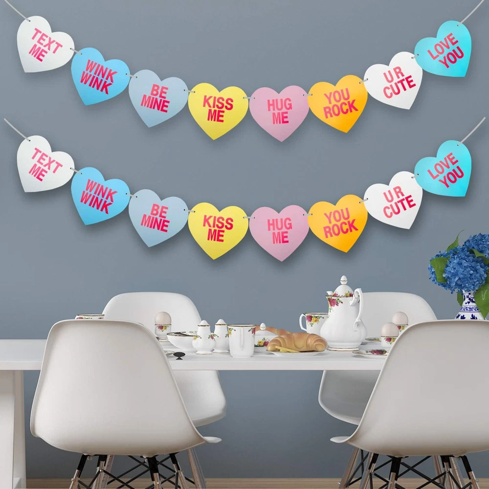[Pack of 2]Valentines Day 2] Conversation Hearts Banner, Pink, White Product Details Shape: Heart Manufacturer: Gaudiwel Product Dimensions: 8 x 8 x 0.04 inches Item Weight: 4.6 ounces Item model number: CA10-P Brand: Gaudiwel Color: Pink, White Material: Paper Item Length: 6 Feet Number of Light Sources: 1 PERFECT VALENTINE DECORATIONS - each HEARTS sayings Text Me, Wink Wink, Be Mine, Kiss Me, Hug Me, You Rock, U R Cute, and Love You VALUE PACKAGE - Come with 2 strings at fair price. NO DIY - come pre-strung, just open the package and hang these heart banners up. LARGE SIZE - Each heart is about 8x8”, and each string is about 6 feet long. Also you can adjust the distance between each heart to achieve how you want to look like.