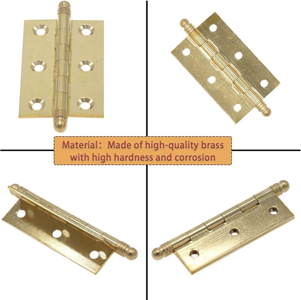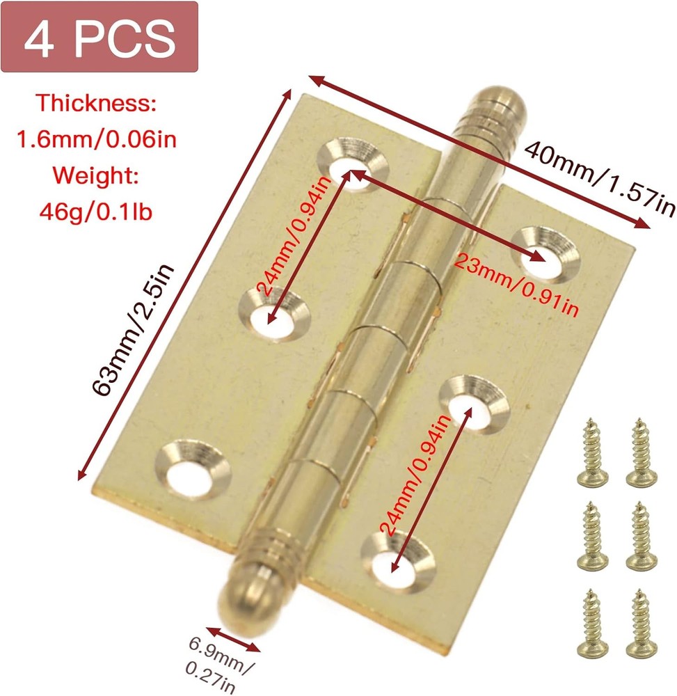 About this item What you will get: 4 x 2.5inch brass door butt hinges, with some screws. Size: 2.48"L x 1.57"W. Hole Distance: 0.94inch. Hole Diameter: 0.15inch. This door butt hinge can play a good decorative role. Good material: The small bifold door hinges are made of solid brass, with brushed surface, beautiful appearance, sturdy with good corrosion resistance, it can be used for a long time. Wide Application: The quality of mini cabinet decorative folding butt hinges is good, easy to install, ideal for use in cabinet cupboard furniture doors. Long service life: The folding butt hinges are well-made, thickened and durable, strong load-bearing, smooth opening and closing, and can be used for a long time. Size: 2.48"L x 1.57"W.