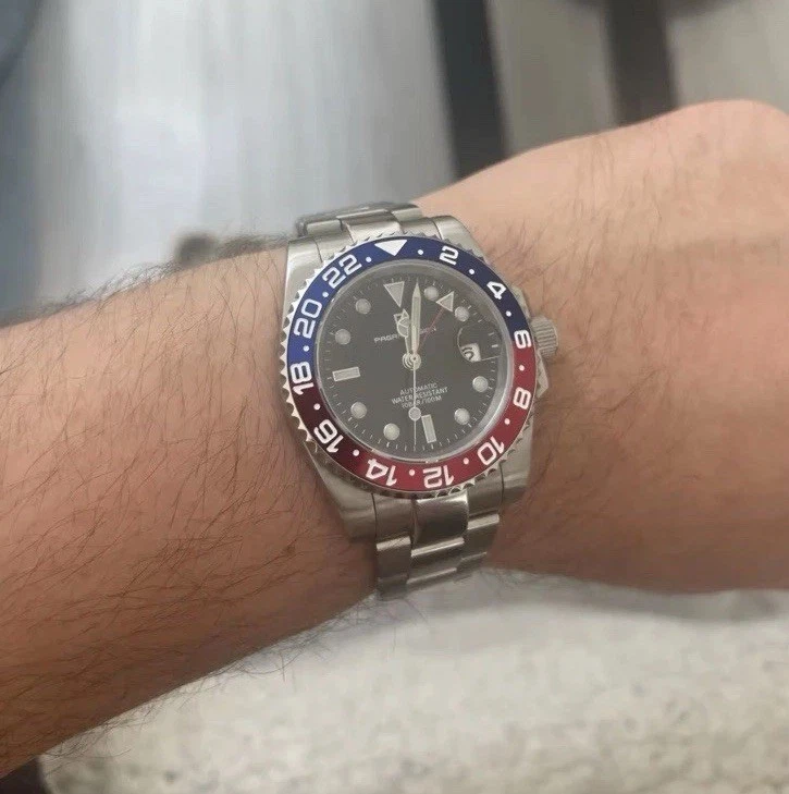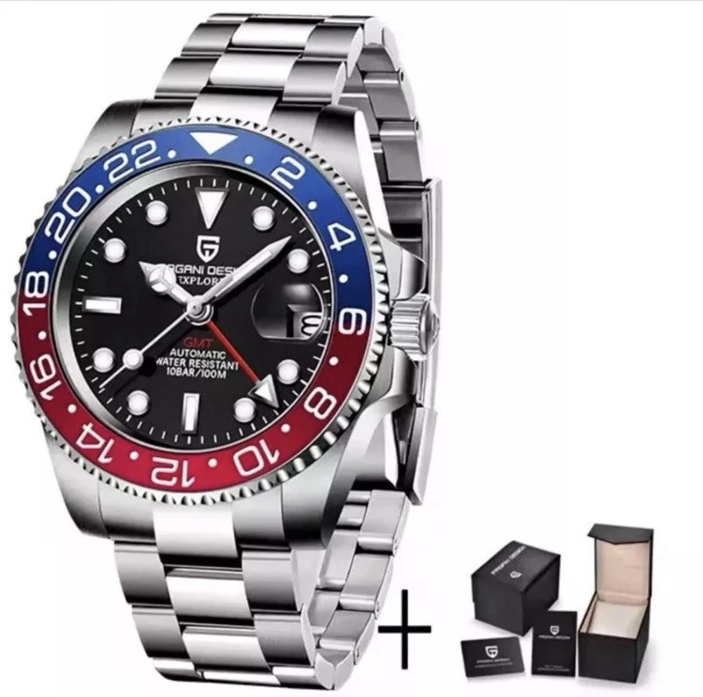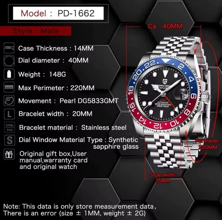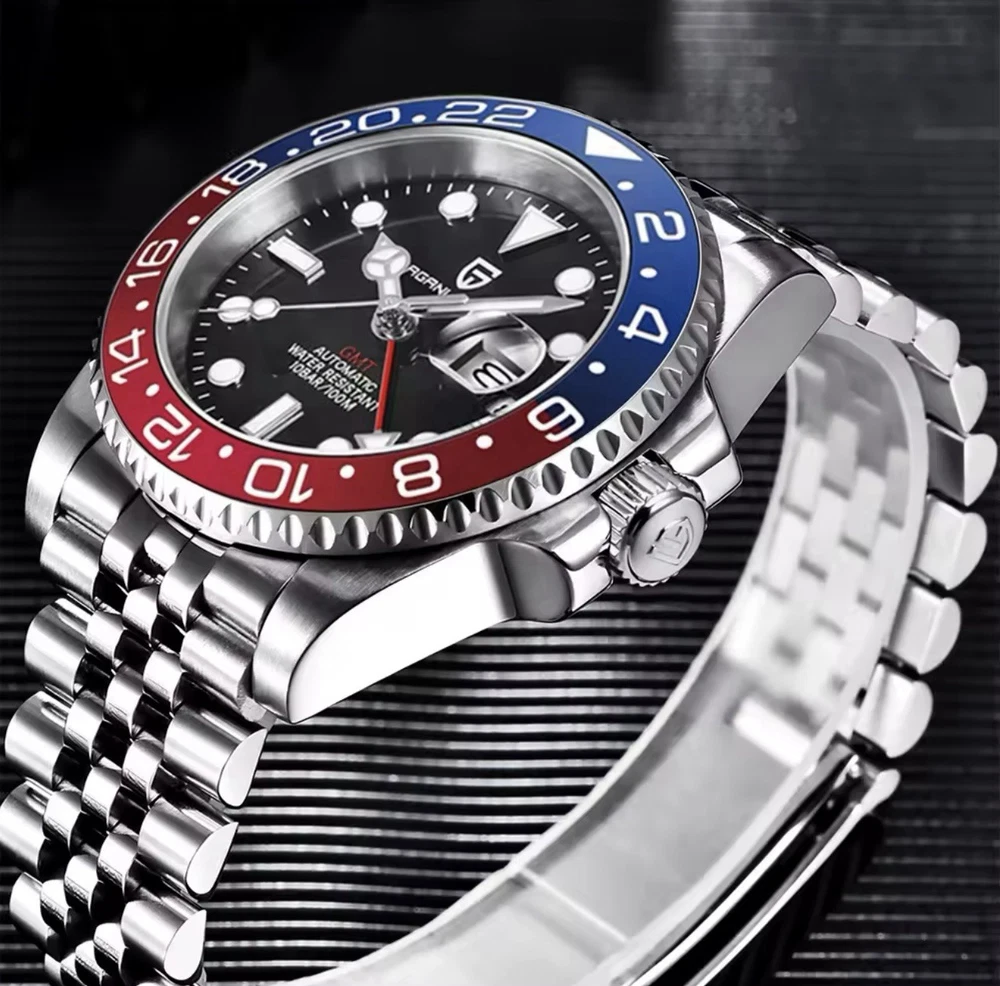 Upgrade your timepiece collection with the PAGANI DESIGN V3 GMT, a sophisticated blend of precision engineering, durability, and elegant design. This 40MM stainless steel watch features a high-performance automatic self-winding movement, eliminating the need for a battery while ensuring precise timekeeping. The GMT function allows you to effortlessly track a second time zone, making it ideal for frequent travelers. Crafted with scratch-resistant sapphire crystal glass and a rotating ceramic bezel, this timepiece is built for longevity and style. Its 316L stainless steel case and bracelet offer a polished, refined look, while the 100M water resistance ensures durability in daily wear, including resistance to splashes and short swims. Similar design to the Rolex Pepsi V2 China Pearl DG5833 Movement ATTENTION It comes with oyster bracelet as seen in the main picture. Description: Sapphire Glass The sapphire glass used in this watch provides superior durability and clarity, ensuring your timepiece remains scratch-resistant and visually appealing. Automatic Mechanical Movement Equipped with an automatic mechanical movement, this watch ensures precision timekeeping without the need for battery replacement. Luxury Design The PAGANI DESIGN V4 GMT Watch exudes luxury with its sleek stainless steel casing and sapphire glass, offering a sophisticated look for any occasion. GMT Functionality The GMT functionality allows you to keep track of time in two different time zones, ideal for travelers or those who frequently deal with international schedules. Waterproof Feature With its waterproof design, this watch is perfect for swimming or showering, making it a versatile addition to your collection. Automatic men's watch: The PAGANI DESIGN men's watch has luminous hands and a stainless steel case and bracelet. The bezel is made of ceramic and can be clicked 120 times. Synthetic sapphire crystal with extremely high light transmittance, sapphire is second only to diamond in hardness, making your watch more durable and resistant to scratches and breakage. (Note: "black-red" and "blue-red" non-ceramic bezels) • Movement: This GMT automatic watches for men. It mainly refers to a mechanical watch that delivers kinetic energy through the natural movement of the wearer's wrist. It rotates with every movement of the wearer's wrist, transferring energy to the mainspring. Keep accurate time, the clock can be wound automatically in your daily life. • Waterproof: The watch is water resistant to 10 bar. It can not only support daily hand washing, car washing, rain and other water contact sports, but also long-term water sports such as snorkeling and swimming. Note that the watch cannot operate underwater. Regardless of water resistance, you should never put your watch in a hot bath as water vapor can penetrate more easily and damage the watch. • Perfect Gift: PAGANI DESIGN watches are suitable for outdoor sports such as running, sports, fishing, dating, New Year, Christmas, Thanksgiving, Hollywood, Wedding, Anniversary, Birthday, Graduation, Father's Day, birthday parties, corporate events. This is a beautiful and valuable gift for you and your loved ones. super luminous 1662 new V4 version officially PAGANI DESIGNS first dual time zone chronograph with GMT function, 40mm stainless steel case with black-blue bezel, rotating ceramic bezel and black dial, sapphire crystal that protrudes like a magnifying glass and allows a clear view. Wearing this watch, you can not only see its softness and joy in real life, but also feel the infinite imagination of an extraordinary journey. The GMT hour hand is a thoughtful solution to jet lag problems. Its excellent function, reliable performance and unique aesthetic design make it very popular among tourists and a must-have global travel watch. Let's go straight to the topic: PD-1662 GMT Watch is a tribute to the Ils watch. period! Whether it is design, accuracy, level of detail, overall execution, and historical relevance, it has it all. When it was officially announced, we knew that PAGANI DESIGN paid tribute to a truly stunning work, a watch destined to succeed. Nevertheless, we still want to confirm all these claims by wearing the watch on the wrist for testing-and, to be honest, we also want more people to enjoy him, even for a short time. let us take a closer look. it's hard to deny that from an aesthetic point of view it is almost flawless. Any luxury watch lover will instantly recognize the GMT, and anyone who owns a GMT will understand that he complements virtually any outfit you wear. It is a real all-rounder for all occasions, it is robust but delicate; complex but simple, and professional yet relaxed at the same time. Stainless steel strap The stainless steel case and bracelet are immaculate and highly polished. to minimize wear and ensure a comfortable fit. The foldable safety buckle is easy to use and not easy to fall off. The sides of the case are beautifully patterned and the four lugs fit comfortably on the wrist. The crown on the right is a screw-down crown that must be unscrewed to set the calendar and time.