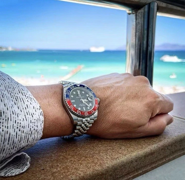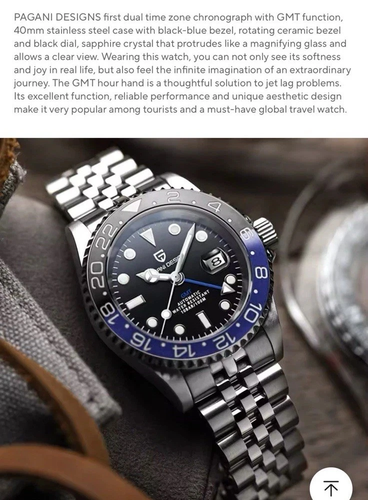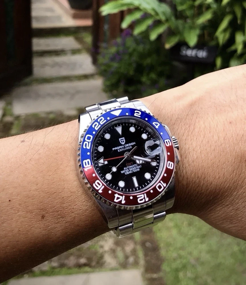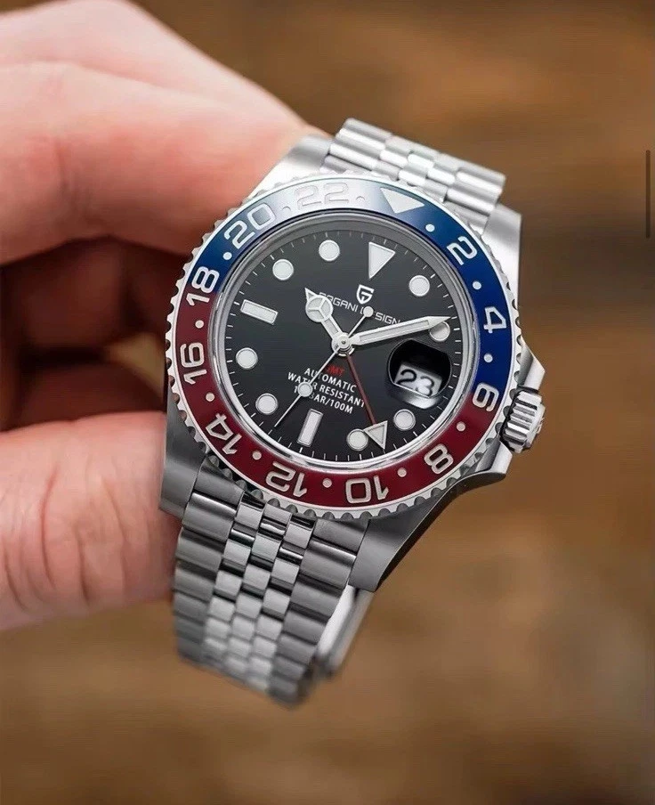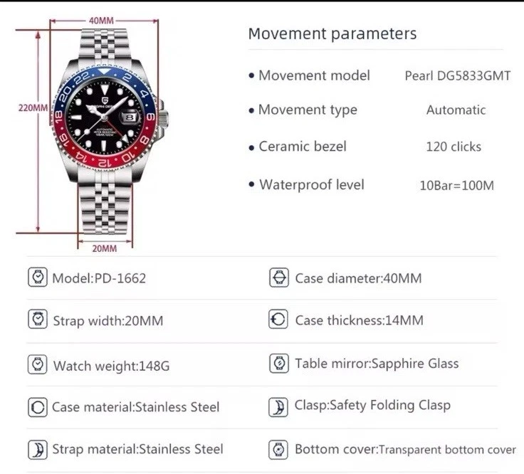 Upgrade your timepiece collection with the PAGANI DESIGN V3 GMT, a sophisticated blend of precision engineering, durability, and elegant design. This 40MM stainless steel watch features a high-performance automatic self-winding movement, eliminating the need for a battery while ensuring precise timekeeping. The GMT function allows you to effortlessly track a second time zone, making it ideal for frequent travelers. Crafted with scratch-resistant sapphire crystal glass and a rotating ceramic bezel, this timepiece is built for longevity and style. Its 316L stainless steel case and bracelet offer a polished, refined look, while the 100M water resistance ensures durability in daily wear, including resistance to splashes and short swims. Similar design to the Rolex Pepsi V2 China Pearl DG5833 Movement ATTENTION It comes with oyster bracelet as seen in the main picture. Description: Sapphire Glass The sapphire glass used in this watch provides superior durability and clarity, ensuring your timepiece remains scratch-resistant and visually appealing. Automatic Mechanical Movement Equipped with an automatic mechanical movement, this watch ensures precision timekeeping without the need for battery replacement. Luxury Design The PAGANI DESIGN V4 GMT Watch exudes luxury with its sleek stainless steel casing and sapphire glass, offering a sophisticated look for any occasion. GMT Functionality The GMT functionality allows you to keep track of time in two different time zones, ideal for travelers or those who frequently deal with international schedules. Waterproof Feature With its waterproof design, this watch is perfect for swimming or showering, making it a versatile addition to your collection. Automatic men's watch: The PAGANI DESIGN men's watch has luminous hands and a stainless steel case and bracelet. The bezel is made of ceramic and can be clicked 120 times. Synthetic sapphire crystal with extremely high light transmittance, sapphire is second only to diamond in hardness, making your watch more durable and resistant to scratches and breakage. (Note: "black-red" and "blue-red" non-ceramic bezels) • Movement: This GMT automatic watches for men. It mainly refers to a mechanical watch that delivers kinetic energy through the natural movement of the wearer's wrist. It rotates with every movement of the wearer's wrist, transferring energy to the mainspring. Keep accurate time, the clock can be wound automatically in your daily life. • Waterproof: The watch is water resistant to 10 bar. It can not only support daily hand washing, car washing, rain and other water contact sports, but also long-term water sports such as snorkeling and swimming. Note that the watch cannot operate underwater. Regardless of water resistance, you should never put your watch in a hot bath as water vapor can penetrate more easily and damage the watch. • Perfect Gift: PAGANI DESIGN watches are suitable for outdoor sports such as running, sports, fishing, dating, New Year, Christmas, Thanksgiving, Hollywood, Wedding, Anniversary, Birthday, Graduation, Father's Day, birthday parties, corporate events. This is a beautiful and valuable gift for you and your loved ones. super luminous 1662 new V4 version officially PAGANI DESIGNS first dual time zone chronograph with GMT function, 40mm stainless steel case with black-blue bezel, rotating ceramic bezel and black dial, sapphire crystal that protrudes like a magnifying glass and allows a clear view. Wearing this watch, you can not only see its softness and joy in real life, but also feel the infinite imagination of an extraordinary journey. The GMT hour hand is a thoughtful solution to jet lag problems. Its excellent function, reliable performance and unique aesthetic design make it very popular among tourists and a must-have global travel watch. Let's go straight to the topic: PD-1662 GMT Watch is a tribute to the Ils watch. period! Whether it is design, accuracy, level of detail, overall execution, and historical relevance, it has it all. When it was officially announced, we knew that PAGANI DESIGN paid tribute to a truly stunning work, a watch destined to succeed. Nevertheless, we still want to confirm all these claims by wearing the watch on the wrist for testing-and, to be honest, we also want more people to enjoy him, even for a short time. let us take a closer look. it's hard to deny that from an aesthetic point of view it is almost flawless. Any luxury watch lover will instantly recognize the GMT, and anyone who owns a GMT will understand that he complements virtually any outfit you wear. It is a real all-rounder for all occasions, it is robust but delicate; complex but simple, and professional yet relaxed at the same time. Stainless steel strap The stainless steel case and bracelet are immaculate and highly polished. to minimize wear and ensure a comfortable fit. The foldable safety buckle is easy to use and not easy to fall off. The sides of the case are beautifully patterned and the four lugs fit comfortably on the wrist. The crown on the right is a screw-down crown that must be unscrewed to set the calendar and time.