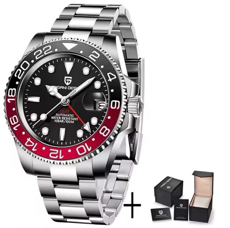 Upgrade your timepiece collection with the PAGANI DESIGN V3 GMT, a sophisticated blend of precision engineering, durability, and elegant design. This 40MM stainless steel watch features a high-performance automatic self-winding movement, eliminating the need for a battery while ensuring precise timekeeping. The GMT function allows you to effortlessly track a second time zone, making it ideal for frequent travelers. Crafted with scratch-resistant sapphire crystal glass and a rotating ceramic bezel, this timepiece is built for longevity and style. Its 316L stainless steel case and bracelet offer a polished, refined look, while the 100M water resistance ensures durability in daily wear, including resistance to splashes and short swims. Similar design to the Rolex Pepsi V2 China Pearl DG5833 Movement ATTENTION It comes with oyster bracelet as seen in the main picture. Description: Sapphire Glass The sapphire glass used in this watch provides superior durability and clarity, ensuring your timepiece remains scratch-resistant and visually appealing. Automatic Mechanical Movement Equipped with an automatic mechanical movement, this watch ensures precision timekeeping without the need for battery replacement. Luxury Design The PAGANI DESIGN V4 GMT Watch exudes luxury with its sleek stainless steel casing and sapphire glass, offering a sophisticated look for any occasion. GMT Functionality The GMT functionality allows you to keep track of time in two different time zones, ideal for travelers or those who frequently deal with international schedules. Waterproof Feature With its waterproof design, this watch is perfect for swimming or showering, making it a versatile addition to your collection. Automatic men's watch: The PAGANI DESIGN men's watch has luminous hands and a stainless steel case and bracelet. The bezel is made of ceramic and can be clicked 120 times. Synthetic sapphire crystal with extremely high light transmittance, sapphire is second only to diamond in hardness, making your watch more durable and resistant to scratches and breakage. (Note: "black-red" and "blue-red" non-ceramic bezels) • Movement: This GMT automatic watches for men. It mainly refers to a mechanical watch that delivers kinetic energy through the natural movement of the wearer's wrist. It rotates with every movement of the wearer's wrist, transferring energy to the mainspring. Keep accurate time, the clock can be wound automatically in your daily life. • Waterproof: The watch is water resistant to 10 bar. It can not only support daily hand washing, car washing, rain and other water contact sports, but also long-term water sports such as snorkeling and swimming. Note that the watch cannot operate underwater. Regardless of water resistance, you should never put your watch in a hot bath as water vapor can penetrate more easily and damage the watch. • Perfect Gift: PAGANI DESIGN watches are suitable for outdoor sports such as running, sports, fishing, dating, New Year, Christmas, Thanksgiving, Hollywood, Wedding, Anniversary, Birthday, Graduation, Father's Day, birthday parties, corporate events. This is a beautiful and valuable gift for you and your loved ones. super luminous 1662 new V4 version officially PAGANI DESIGNS first dual time zone chronograph with GMT function, 40mm stainless steel case with black-blue bezel, rotating ceramic bezel and black dial, sapphire crystal that protrudes like a magnifying glass and allows a clear view. Wearing this watch, you can not only see its softness and joy in real life, but also feel the infinite imagination of an extraordinary journey. The GMT hour hand is a thoughtful solution to jet lag problems. Its excellent function, reliable performance and unique aesthetic design make it very popular among tourists and a must-have global travel watch. Let's go straight to the topic: PD-1662 GMT Watch is a tribute to the Ils watch. period! Whether it is design, accuracy, level of detail, overall execution, and historical relevance, it has it all. When it was officially announced, we knew that PAGANI DESIGN paid tribute to a truly stunning work, a watch destined to succeed. Nevertheless, we still want to confirm all these claims by wearing the watch on the wrist for testing-and, to be honest, we also want more people to enjoy him, even for a short time. let us take a closer look. it's hard to deny that from an aesthetic point of view it is almost flawless. Any luxury watch lover will instantly recognize the GMT, and anyone who owns a GMT will understand that he complements virtually any outfit you wear. It is a real all-rounder for all occasions, it is robust but delicate; complex but simple, and professional yet relaxed at the same time. Stainless steel strap The stainless steel case and bracelet are immaculate and highly polished. to minimize wear and ensure a comfortable fit. The foldable safety buckle is easy to use and not easy to fall off. The sides of the case are beautifully patterned and the four lugs fit comfortably on the wrist. The crown on the right is a screw-down crown that must be unscrewed to set the calendar and time.