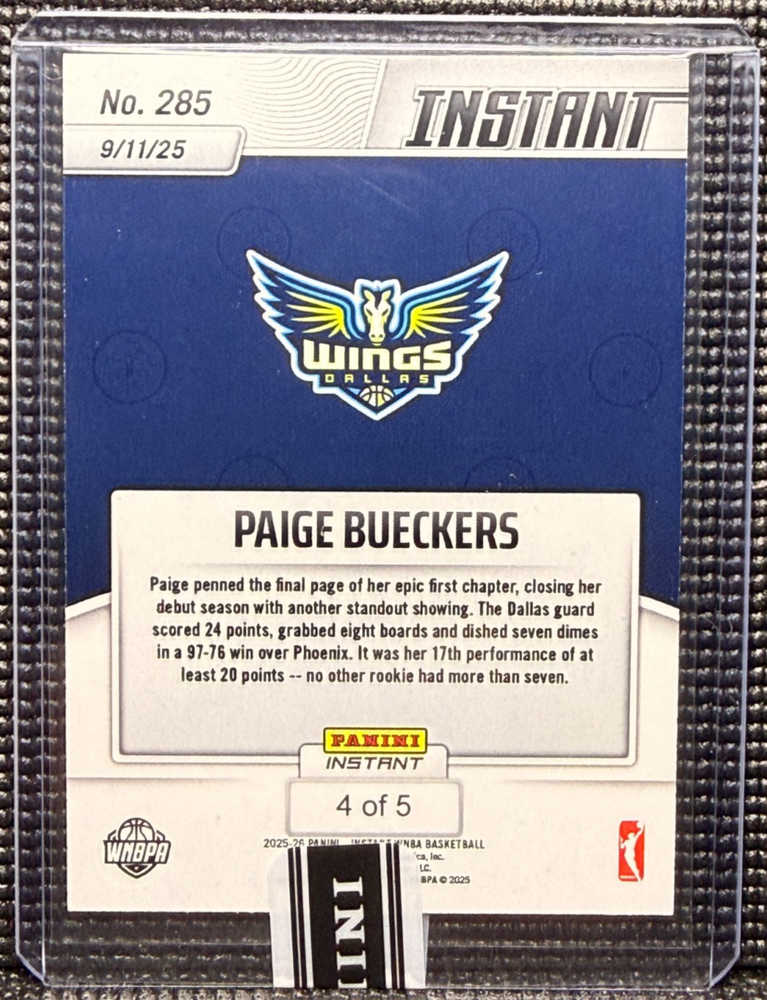 This rookie card is a rare and highly sought-after 2025 Panini Instant WNBA trading card featuring rookie player Paige Bueckers from the Dallas Wings (and UConn Huskies ). This card is a limited edition Lightning parallel variety with a print run of only 5 , making it one of the most valuable and desirable cards for basketball collectors. Manufactured by Panini in the United States, this card is part of the 2025 set and comes factory sealed , adding to its collectible appeal. With its serial number (4 of 5) and short print features (/5) , this card captures a historic moment in the career of Bueckers, who is poised to make a big impact in the Women's National Basketball Association. Stored in a smoke-free environment. This price includes fast and secure free shipping.