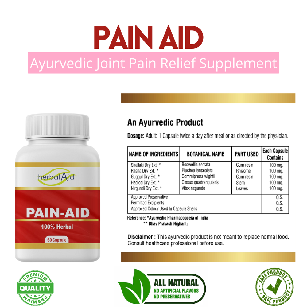 Herbal Aid Pain-Aid Join & Muscle Pain Relief Supplement - Arthritis Pain Relief HerbalAid Pain-Aid is a powerful herbal formulation crafted to support natural relief from joint stiffness, body aches, and muscular pain. Designed with 100% plant-based ingredients, it works from within to help ease inflammation, improve flexibility, and restore physical comfort—naturally and without harsh chemicals. ✨ Key Benefits Of Pain-Aid Relieves Joint & Muscular Pain: Eases stiffness and inflammation in knees, shoulders, back, and other joints. Supports Body Comfort: Ideal for those suffering from chronic aches, post-workout soreness, or age-related discomfort. Anti-Inflammatory Action: Contains herbs traditionally used to reduce swelling and promote natural mobility. Boosts Flexibility & Movement: Helps restore smooth, pain-free motion for everyday activities. Natural & Non-Habit Forming: Safe, herbal alternative with no known side effects or dependency risks. Improves Quality of Life: Enhances energy, comfort, and physical performance through daily support. ✨ Pain-Aid - Ingredients Shallaki Extract (Boswellia serrata) – Used in Ayurveda for joint and mobility support. Rasna Extract (Pluchea lanceolata) – Traditionally known to promote flexibility and comfort. Guggul Extract (Commiphora wightii) – Supports overall well-being and joint care. Hadjod Extract (Cissus quadrangularis) – Valued for its benefits in bone and joint health. Nirgundi Extract (Vitex negundo) – A well-known Ayurvedic herb for promoting comfort and relaxation. ✨ Why Choose Pain-Aid Made with clinically respected herbs and backed by Ayurvedic tradition, Pain-Aid combines nature's anti-inflammatory and pain-soothing ingredients into a convenient capsule. Whether you're dealing with arthritis, back pain, or muscle soreness, this herbal remedy provides trusted relief without synthetic additives. Manufactured in ISO-certified facilities for maximum purity and safety. 📦 How to Use Pain-Aid Please read the product label carefully or use as directed by your healthcare practitioner. ⚠️ Caution This product is intended for adults only and is not suitable for individuals under 18 years of age. Do not exceed the recommended daily dosage. If you are pregnant, breastfeeding, taking any medications, or under medical supervision, consult your healthcare professional before use. Discontinue use immediately and seek medical advice if any adverse reactions occur. Keep out of reach of children. This supplement is not a replacement for a balanced diet or healthy lifestyle. Store in a cool, dry place away from direct sunlight. 📌 General Disclaimer (As Per MHRA & eBay Guidelines) This product is marketed as a food supplement and is not intended to diagnose, treat, cure, or prevent any disease. The statements made are based on traditional herbal use and are not medical claims. Individual results may vary. Always read the label and follow directions for use. Seek professional medical advice for any health-related concerns. By purchasing this product, you acknowledge that you have read and understood this disclaimer. 🚚 Fast & Free Shipping Shipped same day when ordered before 2 PM (Mon–Sat). Sent in discreet packaging via Royal Mail. 🔄 Hassle-Free Returns We offer a 30-day return policy . Buy with complete peace of mind. 🛒 You May Also Like Cabello Hair Growth Oil Fast Hair Growth Oil £9.99 – Free Postage Buy Now Clear Scalp Shampoo 200ml Dry Scalp & Psoriasis £19.99 – Free Postage Buy Now Cell Repair Cream 75gm Dry Skin Moisturization Ointment £17.99 – Free Postage Buy Now Premium Saandhha Oil Ayurvedic Massage Oil for Men £14.99 – Free Postage Buy Now