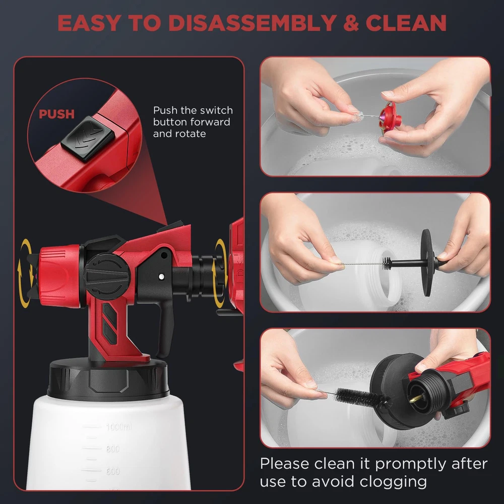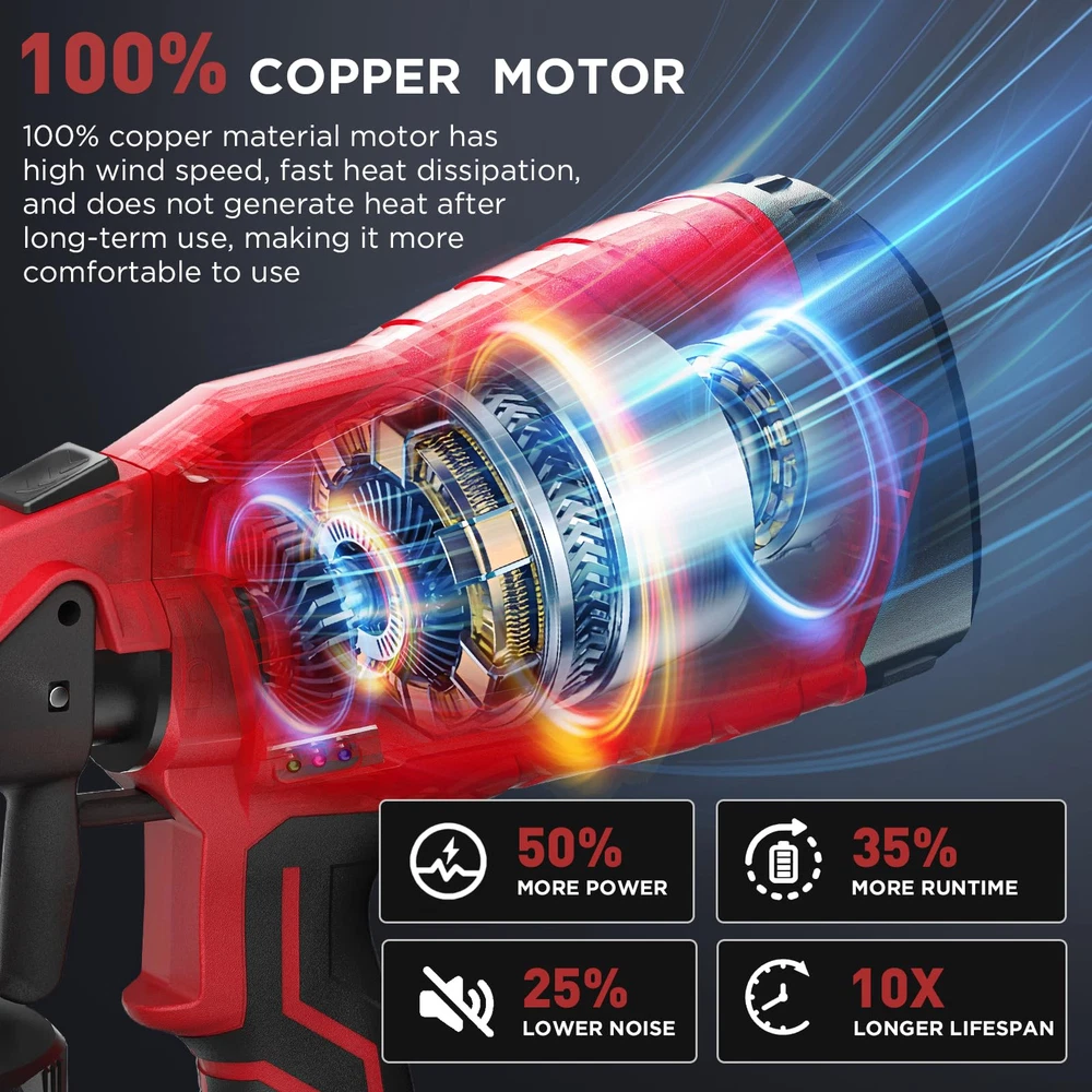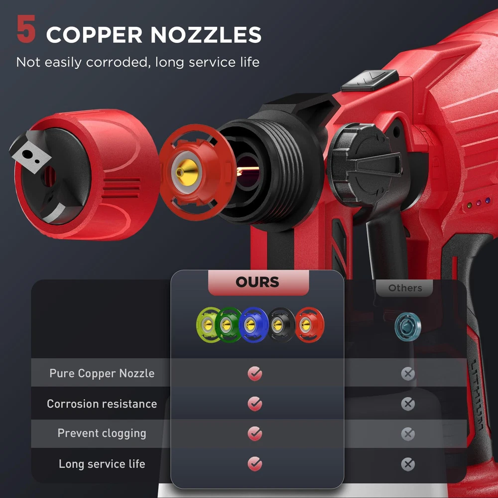 100% Copper Motor:Our spray paint sprayer Different from most aluminum clad copper motors, our motor is made of 100% copper material, with a speed of 35000 per minute, efficient spraying, uniform thermal conductivity, and during use, the machine will not overheat, it won't suddenly stop working halfway making it comfortable to use Built in 10 Pieces Batteries:Our cordless paint sprayer built in 10 Pieces battery,fully charged can be used continuously for half an hour,Overvoltage protection, automatic power-off,wireless operation, convenient and flexible Copper Nozzles:paint guns for house painting upgrade for battery paint sprayers, iteratively upgraded the plastic nozzles on the market to brass nozzles, effectively solving the problem of being blocked and corrosion damage Adapt to Various Projects : Our paint gun sprayer includes 3 spray modes + 5 nozzle options, switching between 3 different spray modes to meet your specific painting needs. 5 nozzle sizes: 1.0mm, 1.5mm, 1.8mm, 2.5mm and 3.0mm, can easily and efficiently complete various painting projects in these options After Sales Service: We provide you with video usage guidance and a 12-month product warranty period for this battery paint sprayer If you encounter any problems during use this spray paint , please contact us Within 24 hours, we will definitely give you a satisfactory reply