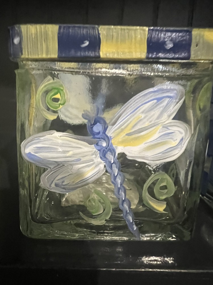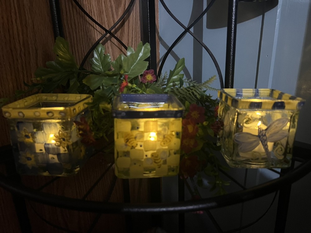 These painted glass candle votive holders feature a square shape and a floral pattern, bee and Dragon fly making them suitable for all occasions and any room decor. They come in a set of three small-sized holders, hand-painted with multicolor flowers and bees and dragon flys on a glass material. The holders can be used with votive candles to create a warm ambiance, but candles and flowers are not included with the product. Perfect for adding a touch of floral charm to your home decor. 3” X 3” x3” size Preowned Tea light candles not included.