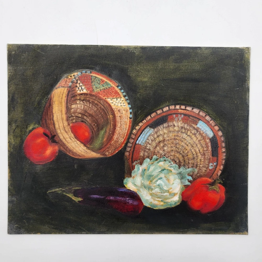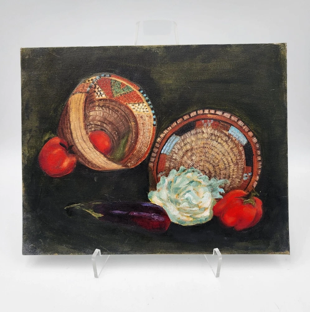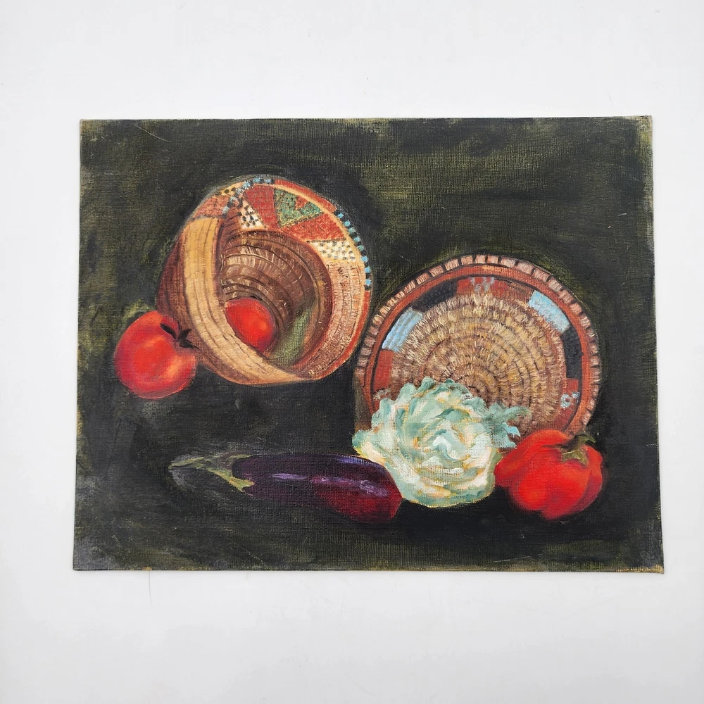 This still life painting of Native American Indian baskets is on a 14"x11" canvas hard board. The unsigned picture is an original work of art depicting two hand crafted Indian baskets and vegetables (eggplant, tomato, red pepper, and cabbage). Interestingly, these plants would not have historically been known to the southwest tribes. Regardless, this is still a good example of American folk art.