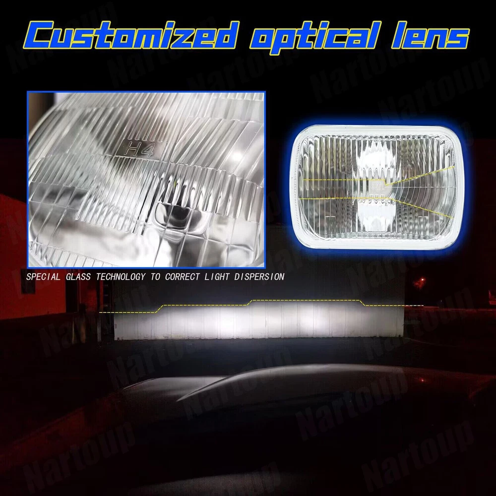 Nartoup - 7"x6" Stock Style H4 Headlights 200w/ LED Bulbs - Pair THESE ARE H4 CONVERSION HEADLIGHTS WITH A STOCK STYLE GLASS LENS AND METAL HOUSING! INCLUDES (2) HIGH INTENSITY LED H4 XENON WHITE LIGHT BULBS! 5X7 7X6 INCH SQUARE HEADLIGHT - PAIR CRYSTAL CLEAR GLASS LENS / METAL BACKSIDE FITS STOCK BUCKETS WITHOUT MODIFICATION PLUGS INTO FACTORY WIRING PLUGS LOW BEAM AND HIGH BEAM BULBS ARE REMOVABLE AND REPLACEABLE 100W LED BULBS INCLUDED PLUG AND PLAY DOT / SAE APPROVED This listing is for a new pair (2 bulbs right & left) 7x6" 5X7"diamond crystal clear semi-sealed beam glass lens / metal housing headlights. These headlights have a clean custom look but fit into the stock buckets and plug into the stock wiring without modification. ( Or some models need to be modified) These light up in a similar color as the original headlights. These have the original 3 prong plug design on the back so they will plug directly into the original wiring harness. These will fit any car or truck that has 2 rectangle glass headlights that are 7x6 inches. These are glass faced headlights with a metal backside. We will take extra care in packaging. Specifications: * Brand:Nartoup * Condition: 100% Brand New * Light Source:2 Sides COB LED * Material: Aviation Aluminum + ABS * Color Temperature: 6000K-6500K * Working Voltage: DC 9-32V ( Fit 12V,24V Vehicle ) * Output Power (Each): 100W * Number of Bulbs: 2 * Waterproof Rate: IP68 * Luminous Flux: 10000lm/Bulb * Working Temperature: -40℃ - +80℃ * Bulb Type: H4 * Beam Type: High Beam/ Low Beam * Beam Angle: 360 Degrees * Lifespan: Over 50,000 hours * Heat Dissipation Principle: Heat Pipe Technology + Aluminum Radiator * Fitment Type: Direct Replacement * Placement on Vehicle: Front, Left, Right * Color: As the picture shows Package include: 2pcs 7Inch Led headlights Housing 2pcs H4 LED Bulbs 2PCS H4 9003 to H13 9008 Connectors Cable Adapters Harness Note:No mounting bracket. New boxes and old boxes are sent randomly!!! After service Notification: If you are satisfied with our product and service please leave us a positive feedback,if there is any problem when you received the package,please feel free to contact us,we will be definitely give you a satisfying solution,when you choose the return reason .please choose the reason"i don't like it". By this option we will accept your return immediately and provide return label for full refund. the others reason to return will take both of us many troubles to handle. If you have any questions, please feel free to contact us, we are happy to answer them for you. Hope you will have a good shopping experience~