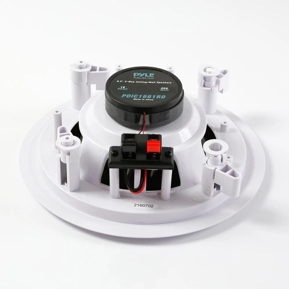 Speaker Maximum Output Power: 2E+2 Watts Is Waterproof: FALSE Item model number: PDIC1661RD Unit Count: 1.0 Count Special Feature: Stereo pairing;Radio Recommended Uses For Product: Home Theater UPC: 313111232216 Subwoofer Diameter: 6.5 Inches Woofer Diameter: 6.5 Inches Impedance: 8 Ohm Specific Uses For Product: Home Entertainment Surround Sound Channel Configuration: 2.0 Audio Output Mode: Stereo Connectivity: Does not apply gtin13: 313111232216 Color: white Brand: Does not apply Mounting Type: Ceiling Mount,Floor Mount,Wall Mount Compatible Devices: Home Theater Speaker Type: Tweeter Connectivity Protocol: Bluetooth, USB Model Name: Pair 6.5’ Flush Mount In-wall In-ceiling 2-Way Home Speaker Syste Speaker Size: 6.5 Inches Control Method: Remote Material: ABS, stain resistant speaker grills Audio Driver Size: 6.5 Inches Connectivity Technology: RCA, Bluetooth, USB Audio Driver Type: Dynamic Driver Product Dimensions: 2.4"D x 7"W x 6.2"H Type: Does not apply Is Electric: Yes Included Components: Stain resistant speaker grills, 2 speakers, and nature friendly A Tweeter Diameter: 0.5 Inches Wireless Communication Technology: Bluetooth Controller Type: Remote Control Style: Speaker + Receiver Model: Does not apply Water Resistance Level: Not Water Resistant Includes MP3 player?: No Power Source: Corded Electric