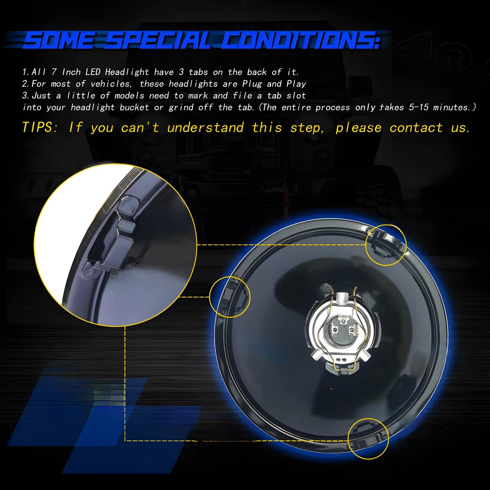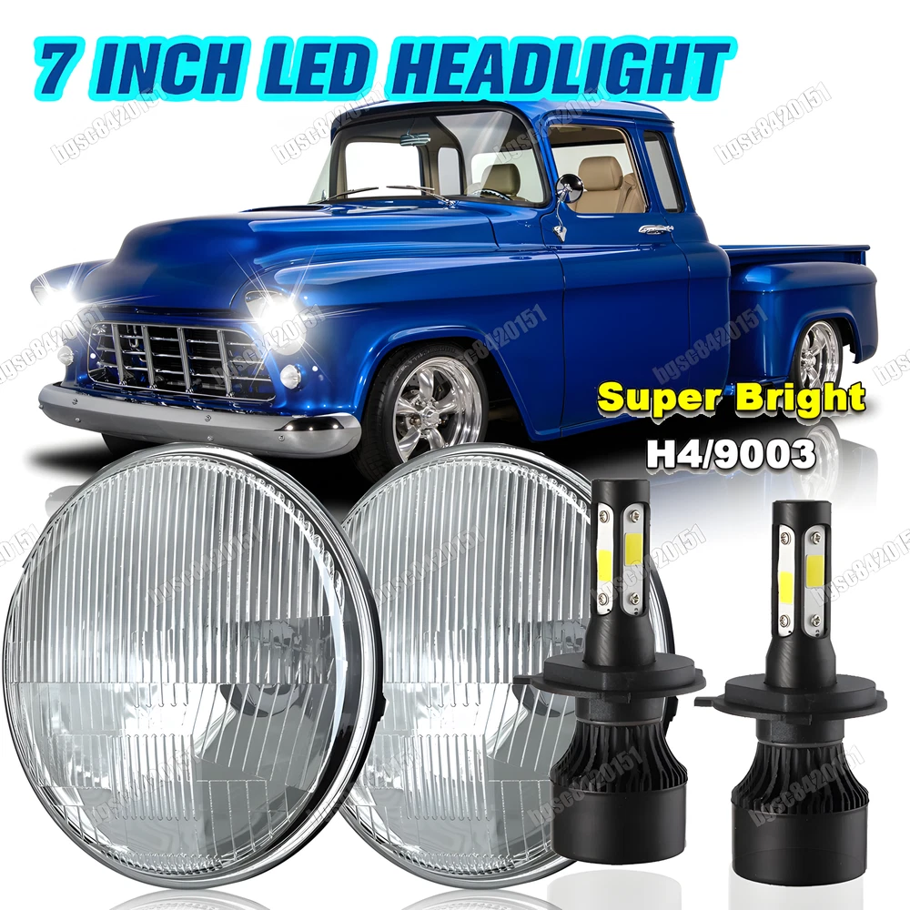 7" Inch Round Diamond Crystal Clear Glass Lens / Headlight Conversion Kit contains everything you need to upgrade your headlights to the newest LED headlight technology while keeping that classic look! -Made with High Quality Glass Lenses - NOT cheap plastic! -Housing has Removable bulb sockets for you to install the new LED bulbs! -Direct Plug & Play design (certain vehicles will require slight modification) -Professional Installation is highly recommended -Warranty 5 years Pair (2 Bulbs Right And Left) 7" Inch Diamond Crystal Clear Semi Sealed Beam Glass Lens Housing Headlights. This Pair Of Headlights Includes 70W Super White LED H4 Light Bulbs. These Headlights Have A Clean Custom Look But Fit Into The Stock Buckets And Plug Into The Stock Wiring Without Modification. These Light Up 500 Percent Brighter And Whiter Than The Standard Stock Sealed Beam Incandescent Headlight Bulbs. These Have The Original 3 Prong Plug Design On The Back So They Will Plug Directly Into The Original Wiring Harness. These Will Fit Any Car Or Truck That Has 2 Round Glass Headlights That Are 7" Inches. H4 LED Bulbs Specifications -Color: 6000K Cool White -Power Consumption: 50 Watt -Luminosity: 6000 LM -360 Degree / P2 Series CSP Chip Perfect Beam Angle -H4 - Dual Beam Function (You will have HIGH AND LOW!) -500% Brighter than Stock Halogen -Built in IC Circuit (Current Regulator)-Prevents LED Damage From Voltage Variations & Spikes. -Lifespan: 50,000 Hours -Operating Voltage: DC 12V / 24V -Amperage: 1.9A - 2.9A -Maintenance free, Waterproof IP67, Shockproof -Warranty 5 years Contents: - 2x Headlight Housings - 2x H4 LED Bulbs (Hi/Lo Dual Beam)