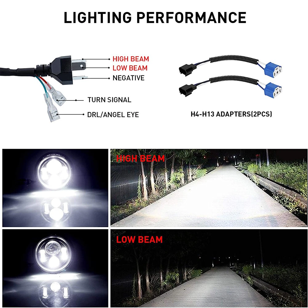 Specification: Power: 240W Quantity: 1 pair Light Type: LED LED Quantity: 4 beads Len Material: PC Housing Color: black Voltage: DC 9-36V Certification: CE, ROHS Waterproof Rate: IP68 Life Time: 50,000 hours Color Temperature: 6500K Housing Material: die-casting aluminum Lighting Pattern: high beam/low beam Angel Eyes Light Color: white (DRL) / yellow (turn light) Size (D*H): approx. 177mm (7")*100mm (4") Features: (Sold in pair) Aftermarket high strength 7” round LED headlights with white/ yellow halo angel eye High brightness & low power consumption, enhance visibility when driving at night Four modes: high beam-all LEDs on, Low beam-only three side LEDs on, DRL-white halo angel eye on, turn light-yellow halo angel eye on Dramatically improve external appearance, add an aggressive styling to your vehicle Instruction is not included, professional installation is highly recommended Play and plug, come with a H4 to H13 adapter harness Package Included: 2 x 7" LED Headlight 2 x H4 to H13 Adapter Harness (Installation instruction is NOT included) Notice: 2018-2019 JEEP Wrangler JL need the Adjustable Headlight Mounting Bracket For Installtion Application: (Including but not limit the following applications) Fit for Jeep Wrangler JK 2 Door (2007-2018) Fit for Jeep Wrangler JK 4 Door Unlimited (2007-2018) Fit for Jeep Wrangler TJ (1997-2006) Fit for Jeep Wrangler TJ Unlimited / LJ (2003-2006) Fit for Jeep Wrangler LJ Unlimited (2004-2006) Fit for Jeep CJ-7(1976-1986) Fit for Jeep CJ-8 Scrambler(1981-1985) Fit for Mazda Miata (1990-1997) Fit for Porsche 944 (1983-1991) Fit for Land Rover Defender 90 & 110 Fit for AM General Hummer (1992-2001) Fit for Freightliner Century Class (1996-2011) Fit for Freightliner Coronado (2001-2016) Fit for Hummer H1&H2 (2003~2009) (H2 needs 9007 male to H4 female adapter,not included in the package) Fit for Chevy Truck (1947-1957 and 1962-1972) Fit for Chevrolet C10 Pickup (1969-1974) Fit for Chevy C10 (1975-1980) Fit for Chevy C10 Suburban (1969-1980) Fit for Chevy C20 Pickup (1969-1974) Fit for Chevy C20 Suburban (1969-1980) Fit for Chevy C20 (1975-1980) Fit for Chevy C30 Pickup (1969-1974) Fit for Chevy C30 (1975-1980) Fit for Chevy Chevelle (1971-1973) Fit for Chevy Chevette (1976-1978) Fit for Chevy El Camino (1971-1975) Fit for Chevy G10 G20 G30 (1975-1987) Fit for Chevy K10 K20 K30 K5 Blazer (1969-1980) Fit for Chevy Lux (1980-1982) Fit for Chevrolet Chevy Nova (1963-1978) Fit for Chevrolet Camaro (1967-1981) Fit for Chevrolet Blazer (1969-1974) Fit for Chevrolet Chevy Monte Carlo (1970-1975) Fit for Chevrolet Chevy Monza (1975-1980) Fit for Chevrolet Chevy Lux (1980-1982) Fit for Chevrolet Chevy Laguna (1973-1975) Fit for Chevrolet Chevy Malibu (1973-1975) Fit for Chevrolet Pickup Truck (1967-1973) Fit for Ford Bronco (1966-1977) Fit for Ford Mustang (1965-1973) Fit for Ford F-100 Pikcup (1969-1974) Fit for Ford F-100 (1975-1979) Fit for Ford F-150 (1975-1979) Fit for Ford F-250 Pickup (1969-1974) Fit for Ford F-250 (1975-1979) Fit for Ford F-350 Pickup (1969-1974) Fit for Ford F-350 (1975-1979) Fit for Ford E-100 Econoline Club Wagon (1975-1978) Fit for Ford E-100 Econoline (1969- 1978) Fit for Ford E-150 Econoline Club Wagon (1975-1978) Fit for Ford E-150 Econoline (1969-1978.) Fit for Ford Falcon Sedan Delivery (1961-1965) Fit for Dodge B100 Van (1971-1974) Fit for Dodge B100 (1975-1978) Fit for Dodge B150 (1984-1987) Fit for Dodge B250 (1984-1987) Fit for Dodge B200 Van (1971-1974) Fit for Dodge B200 (1975-1978) Fit for Dodge B300 Van (1971-1974) Fit for Dodge B300 (1975-1978) Fit for Dodge B350 (1984-1987) Fit for Peterbilt 359 (1981-1987) Fit for Peterbilt 379 (1988-2009) Fit for International Harvester 4200 4300 4400 Fit for Kenworth T2000 (1998-2010) Fit for Mack DM RM RW RS RL CF Fit for American Motors Pacer (1975-1980) Fit for American Motors AMX (1968-1978) Fit for American Motors Matador (1974-1978) Fit for American Motors Hornet (1970-1977) Fit for American Motors Javelin (1968-1974) Fit for American Motors Gremlin (1970-1978) Fit for Bertone X 1/9 (1984-1989) Fit for Alfa Romeo Spider (1988-1994) Fit for Datsun 240Z 260Z 280Z 280ZX (1970-1978) Fit for MG Midget (1969-1979) Fit for Plymouth (1949-1955) Fit for Dodge (1949-55) Fit for DeSoto (1949-55) Fit for Chrysler (1949-55)