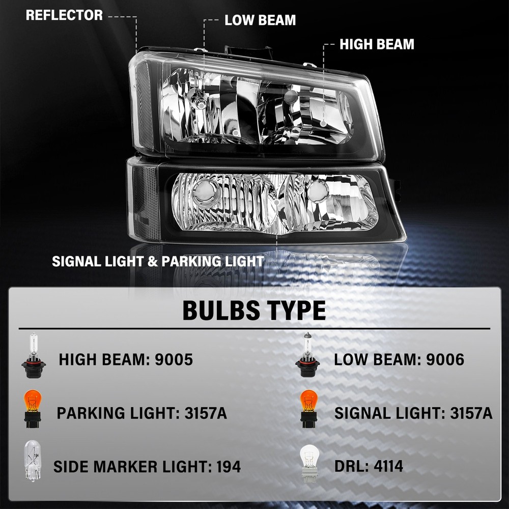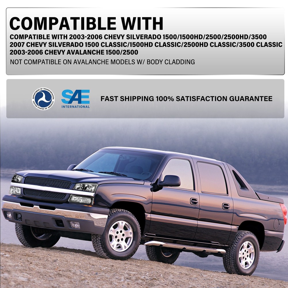For 2003 2004 2005 2006 Chevy Silverado Avalanche Black Headlights Bumper Lamps Product Description Fit For: 2003-2006 Chevrolet Avalanche 1500 2500 2003-2006 Chevrolet SIlverado 1500 2500 3500 2003-2006 Chevrolet SIlverado 1500 HD 2500 HD 2007 Chevrolet Silverado 1500 1500 HD 2500 HD 3500 Classic Features: Plug and Play Operation, Direct Bolt-On OE Fitment or Replacement for the Stock Unit Comes with a Complete Set of Headlights (Driver and Passenger Side) Brings a Different Appearance to Vehicle thats Great for Show Use or to Replace Old and Worn Headlights Requires no Modification or Drilling Notice: 1.High quality generic branded lights that are indentical to OEM lights. Safety and Durable. 2.DOT/SAE approved for street legal. Safety & Fashion. 3.High grade ABS plastic. For toughness, impact resistance, and heat resistance. 4.Condition: 100% Brand New and High Quality 5.Material: ABS Plastic Housing / Polycarbonate Lens 6.Color: Black Housing + Clear Lens 7.100% Brand New! 8.Professional Installation is Highly Recommended. 9.Installation Instruction is NOT Included. 10.Before you begin to adjust the light, make sure check the alignment of your lights first. Park the vehicle about 10 to 25 feet from the wall with the lights aimed at the wall. Pacakge Includes: Left+Right Headlights Bulbs are not included. Payment Policy Shipping Policy Returns Policy About us Payment Policy We accept PayPal and all forms of credit card. Ple ase submit your payment within 7days after your purchase. Otherwise, eBay will automatically open an Unpaid Item Dispute on our behalf if the item(s) are not paid within 7days. We DO NOT SHIP TO PO BOXES, And Customer Needs To Provide a Physical Address. Shipping Policy All Orders Will Ship Within Two Business Days.Except PR,HI,AK,GU and PO Box addresses. No local pick up All Packages Will Be Insp ect Before Shipping, We Will Provide All Packing Material Needed For Your Package For Shipping Such As Boxes, Cushioning And Tape To Improve Shipping Quality. Very Important: Double check shipping address. We are not responsible for incorrect or undeliverable addresses. Returns Policy 30 Days returns satisfaction guarantee.90 Days warranty. All of Our Items Are 100% Brand New, We Do Not Sell Anything Other Than That. If The Item Shows Up Defectiv e or Broken, Please Contact Us Within 3 Business Days By Using "Ask A Question" Link Located At The Bottom of Our Listing. Your Ques tions/Concerns Will Be Responded Within 24 Hours Monday To Friday. Buyers May Contact us On The Weekends or Pubic Holidays And We Will Respond On The Next Working Day. We Will Offer Replacements, Exchange or Full Refund. 100% Satisfaction Guaranteed. We Will File Damage Or Lost Claim For Our Buyers And Guaranteed Buyers Will Receive Products In A Timely Manner. About us Welcome to Our eBay Store. We specialize in aftermarket automotive car parts and is the #1 industry distributor for affordable and quality products. We have our warehouse in CA.Item will be shipped out within 48 hours after payment cl eared via UPS or Fedex. All emails will be answered within 1 business day during our business hours, except on weekends and major holidays. Before leaving us negative review, please contact our C ustomer Support Team first. We will do our best to offer satisfactory service to the customers. Copyright © 2023 Dianxiaomi