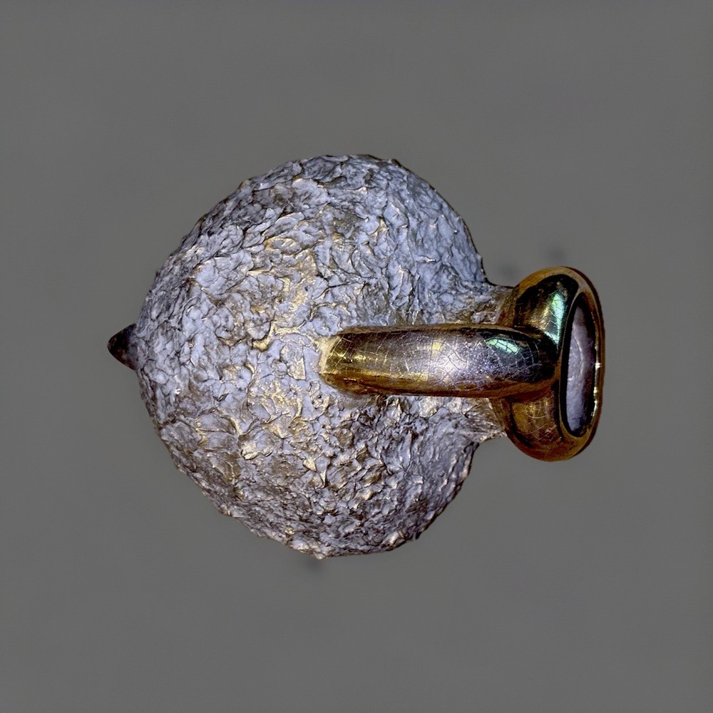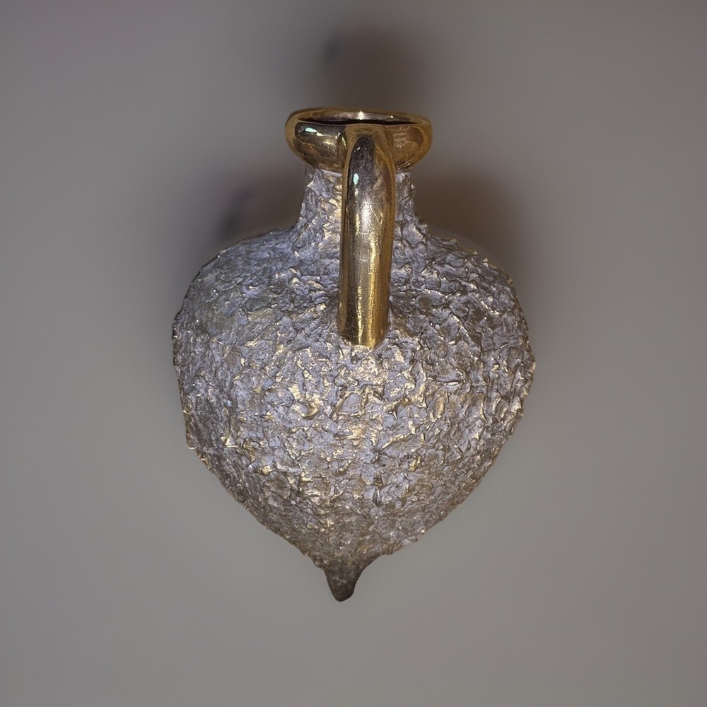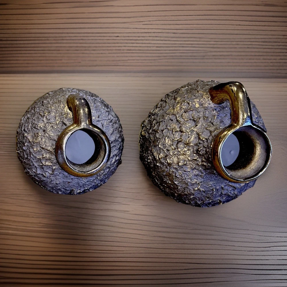 Pair of large sculptural ceramic vases featuring a striking brutalist design with heavily textured stoneware bodies and metallic gold glazed handles. Each vase is solid and substantial, with an angled neck and hollow interior, designed to rest on a diagonal for a bold, modern presentation. These pieces have wonderful presence and work beautifully as statement décor on a console, shelf, or tabletop. Both vases are in very good overall condition. Upon close inspection, there are a few extremely minor edge flecks typical of stoneware production and handling, but nothing that detracts from their appearance. They display beautifully. Approximate measurements: Larger vase: about 14” x 10” Smaller vase: about 11” x 8” ✨ Thank you for taking a look! If you think this could be your next purchase, don’t hesitate to make an offer — I truly enjoy connecting special treasures with the people meant to have them. ✨ Your item will be carefully packaged to ensure it arrives safely. Buy with confidence — I’m proud to maintain 100% positive feedback!