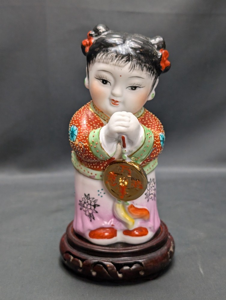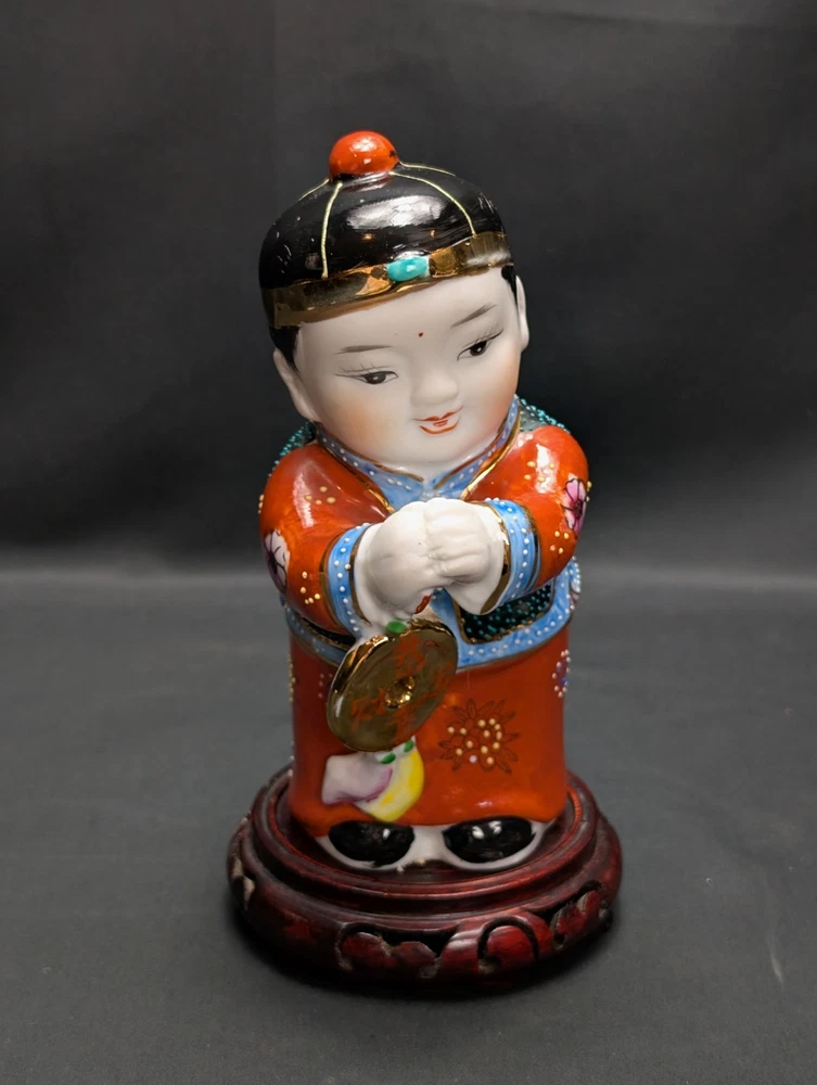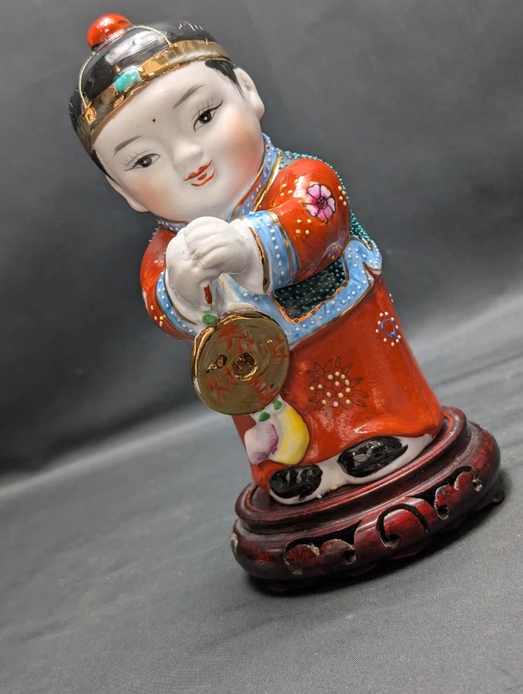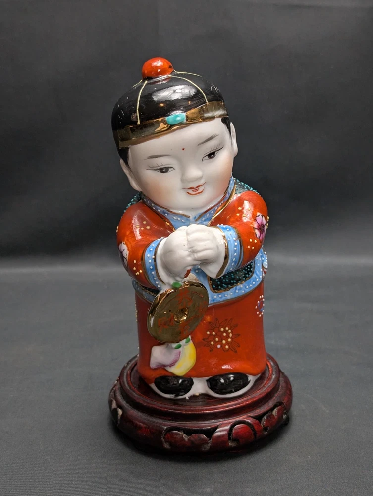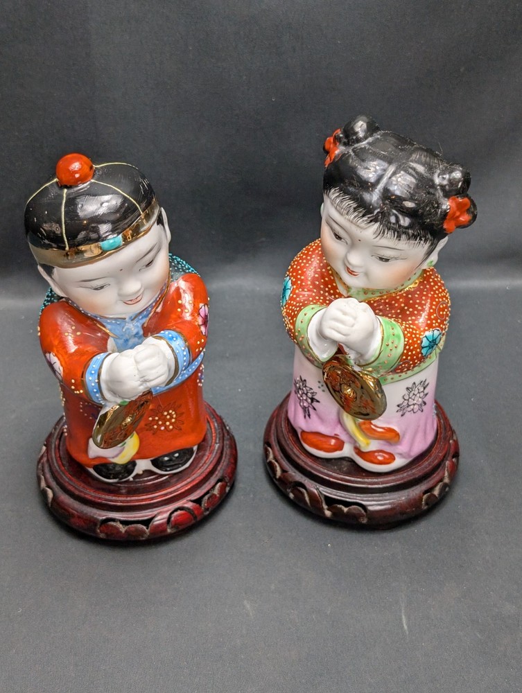 Pair of Chinese porcelain figurines depicting Jintong and Yunu (Golden Boy and Jade Girl), traditional Chinese symbols of harmony, prosperity, and good fortune. In the UK these are often described as Chinese good luck figures or boy and girl prosperity figures. The figures are decorated in bright enamel colours with gilt detail and are dressed in traditional costume, each holding a symbolic coin plaque associated with wealth and good fortune. Both figures are mounted on their original carved wooden stands. The porcelain bases feature factory vent holes typical of Chinese export porcelain. The wooden stands retain a Made In China label, indicating late 20th century manufacture. Condition is great overall with no cracks or repairs observed. Minor surface wear consistent with decorative use. A decorative and symbolic pair of Chinese export figurines, suitable for display in the home or as traditional good luck ornaments. Please inspect the photos to check the quality/condition for yourself. PLEASE READ THE BELOW CAREFULLY IN REGARDS TO ALL USED ITEMS IN OUR STORE. Most of our items are in used condition with some wear from general use and as such, they may show some marks. Please ensure you examine the pictures as we aim to capture any considerable marks/damage in images and we will only sell items we consider to be usable. The pictures allow you to inspect the finer detail and quality of the product before purchasing, zoom in for further inspection. Please ensure you're happy with measurements shown in photos as some items may appear bigger than real life due to close-up shots. Vintage electronics sold as "working" are tested and functional at time of listing, but may require future maintenance or component replacement due to their age. Items listed as "spares & repairs" are sold for parts/restoration and functionality is not guaranteed. No warranty provided on continued functionality for any vintage electronics. Some electronics may have security stickers placed over access screws to prevent tampering. If these stickers are removed or tampered with, no refund will be given. Rest assured, refunds are available under normal circumstances as outlined below. Items are sold as-is based on photos and description. We accept returns for change of mind or if the item differs from what was described or pictured - please see our returns policy for full details. From a smoke and pet free home. Some items may require cleaning before use, we clean what we reasonably can but recommend inspection upon receipt and clean if necessary. Items do not come boxed or with certificates unless stated otherwise in our descriptions. Questions are welcomed before purchase if you need any additional details or clarification. Please choose your preferred postage courier at checkout - we offer Evri & Royal Mail. Where possible we try to use recyclable materials for packaging. We may also choose a different service or courier depending on your location, item value, and package size. Feel free to contact us if you need to discuss postage options. We have many more items in our store, from pottery, glassware, cameras, vintage, antiques, clothing, trainers and much more. Feel free to check it out. Thank you from the Basement Hoarders team.