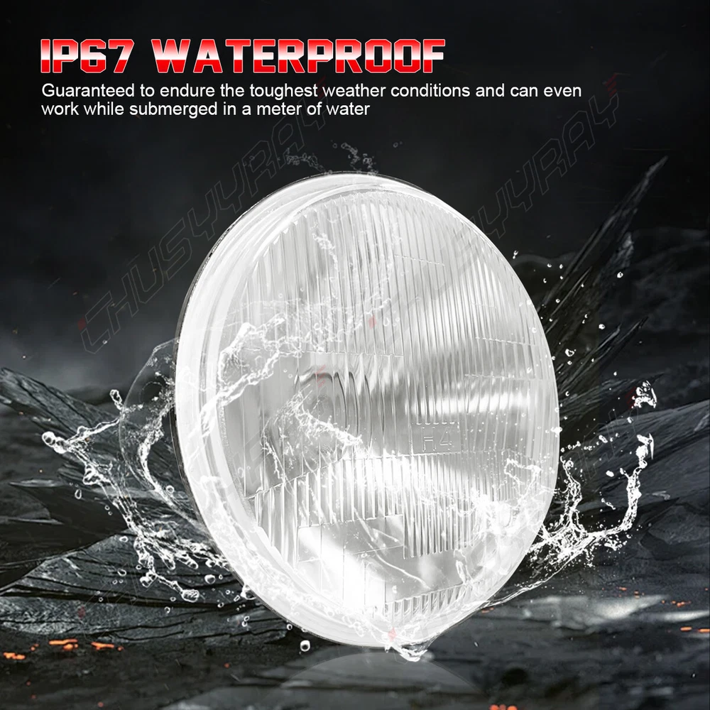 THESE ARE STOCK STYLE GLASS FACED / METAL BACKED HEADLIGHTS! INCLUDES (2) HIGH INTENSITY LED H4 6000K WHITE LIGHT BULBS! PAIR- 7" Stock Style H4 Headlights Glass Lens / Metal Backside High Intensity LED Bulbs Low And High Beam Functions (2) Low Beam / High Beam Headlights No Modifications Needed - Plug And Play Part Number Interchange: H6006 / 6006 For 12-Volt Systems Only DOT SAE Approved This listing is for a pair of new 7" stock style glass lens - metal back headlight bulbs. This set includes (2) low / high beam headlights with high intensity 6v LED light bulbs (no wiring or bucket modification needed). These have the original shaped prongs on the back so they will plug right into your original wiring harness plugs. These will fit any car or truck that has 2 round glass headlights & will fit into stock buckets. Each bulb is 7 inches in diameter. These are glass and we will take extra care in packaging. DOT SAE Approved INTERCHANGE: H6006 / 6006 All-In-One H4 6v LED Headlight Bulbs: 4,000 Lumen Bulbs - PAIR 4,000 LUMENS PER BULB! The LED conversion kit to rival HID power is finally here! The LED 12V conversion kits come in all different headlight and fog light bulb styles. Not only are the new LED conversion kits as bright as an HID system, but the new design from chusyyray, does not require a relay or harness or special drivers. The LED conversion kits from have the driver built in to the bulb, which means there are no external parts to mount or plug in, just replace your old halogen bulbs with the new ones and plug them in like the originals. The new u6s LED conversion kits from are the brightest on the market! Each dual beam 12v LED bulb produces 2,600 Lumens of light and draws 26 watts of energy on the low beam setting; but produces 4,000 Lumens of light and draws 40 watts of energy on the high beam setting. LED LIGHT BULB Specifications and Features: 2,600 Lumens Low Beam / 4,000 Lumens High Beam Light Output Per Bulb 360 Degree Light Beam Angle 26 Watts Low Beam / 40 Watts High Beam Energy Usage Per Bulb LED Light Color: 6,000K Weatherproof Rating: IP67 Waterproof Ball-Bearing Fan for Cooling Newest Technology All-In-One Design: No Ballast or Driver Required LED Protection Circuit to Protect from Reverse Polarity, Low Voltage or High Voltage Spikes Smart & Efficient Cooling System Uses Built-In Cooling Fan Greater Visibility - 3x Brighter than Factory Halogen Bulbs Voltage: 12-Volt High Quality Aluminum Heat Sink Ensures Proper Temperature Regulation Lower Power Consumption than Halogen Bulbs Vibration Proof Design 50,000 Hour Lifespan Easy Plug & Play Installation - No Modification Required No Splicing of Harnesses Required for LED Bulbs Uses 75% LESS Power than Halogen or HID Bulbs 3x Brighter than Stock Halogen Bulbs Dramatically Improves Visibility at Nigh