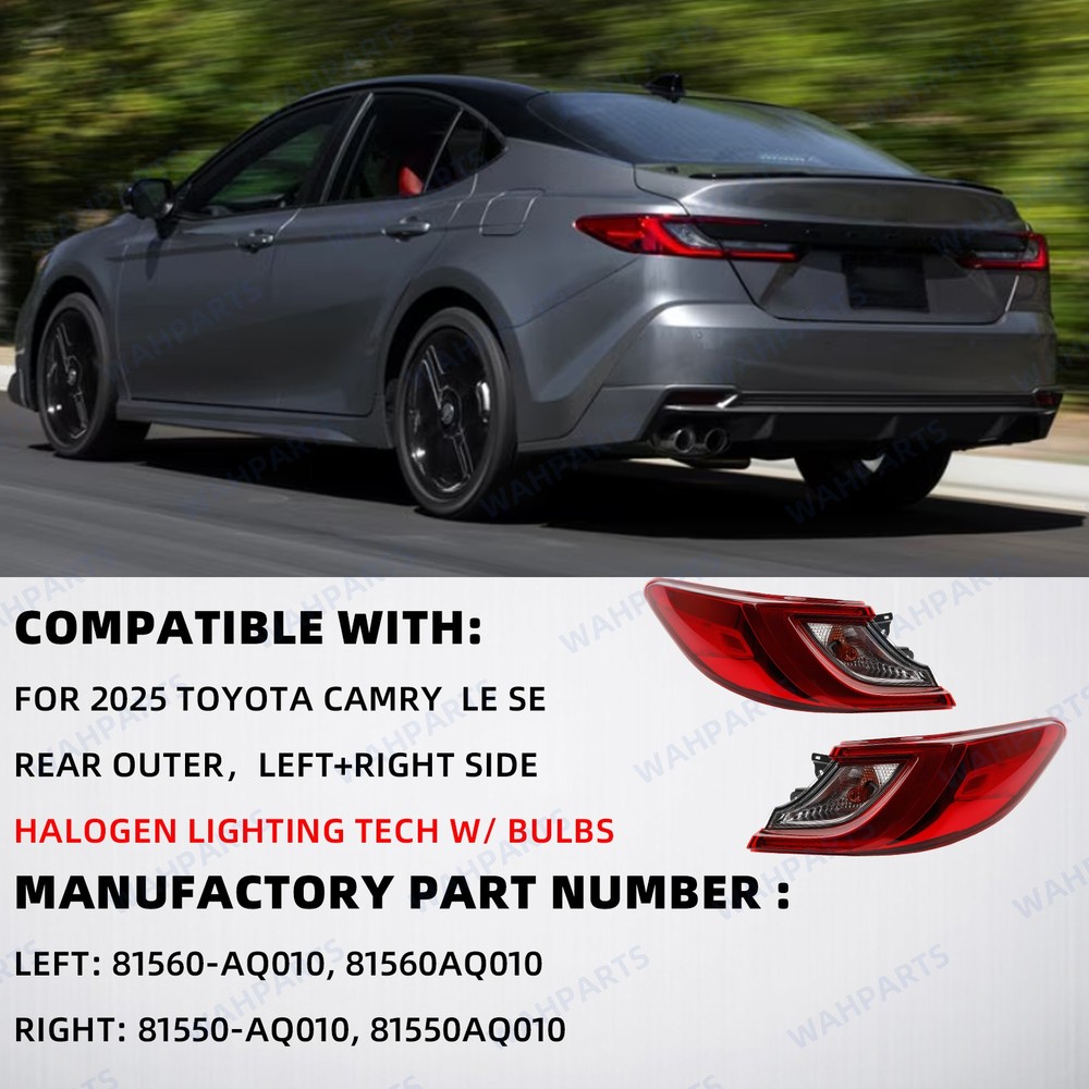 Features & details 【 Compatible With 】2025 Toyota Camry LE SE Please check if the picture and part number in the link are the same as your original part. 【Replace OE Number】 81560-AQ010, 81560AQ010 ( Left Side ) 81550-AQ010, 81550AQ010 ( Right Side ) 【 Description 】 Condition: 100% Brand New Fitment Type: Direct Replacement Placement on Vehicle: Rear, Left & Right Side Type: Halogen Tail Light Assembly Light Technology: Halogen Items Included: With bulb (s) Housing Color: Black Lens Color: Red 【 Features 】 Easy to Install. The tail lights are made according to the original specifications and can be perfectly matched with your car. They are directly mounted without modification, which is convenient. Sealed Design. Due to the fully sealed structure and one-way ventilation holes, our tail lights are waterproof to keep out moisture and work well in any bad weather such as heavy rain, snow, sand, etc. Reliability & Durability. Our tail lights are strictly tested and inspected to ensure better compatibility with the excellent performance of the car during driving. 【 Package Included 】 1 Pair Rear Left & Right Tail Light Assembly This item doesn't come with manual installation. 【 Note 】 Please allow the slight color difference caused by the shooting light and 1-3cm error due to manual measurement, and make sure you do not mind before you place the order. No installation instruction included, professional installation is highly recommended. 【Service & Warranty】 Purchase from WAHPARTS, enjoy 1 year no worries-warranty, whenever you met issue when installing or using, please contact us via eBay Message, and we will reply within 24 hours and help solve the problem. Customer Question & Answers Q1: Will This Part Fit My Vehicle? We list all the compatiblity, if your vehicle does not show up on the compatibility table at the top of our listings, welcome you to contact us for free consulation before purchasing a product. Q2: Does they come with warranty? All of our product comes with 1-year warranty, but some times you need to pay the shipping fee. Q3: How to use it? If you don't know how to install this accessory, welcome to contact us, we will provide you with a video guide. Payment Shipping Warranty & Service Returns/Exchanges Contact us Payment Most of the payment methods are available, such as Paypal, Payoneer, Credit Card. Within 1 day of receiving your payment, we will start processing your order. Shipping All Items Will Be Ship Within 1working Days, and We Will Ship out All Orders As Soon As Possible After Payment Verified, Please Allow up to 1-6 Business Days for Delivery. Why Choose the Us Stock? 1. Us Local Shipping, No Extra Customs Cost. 2. Fast Delivery: 1-6 Working Days Delivery. Warranty & Service All the product in our store come with a 1-year-warranty. If there is a problem with the product you purchased within 1 year, please contact us, we will provide you with after-sale protection. Our job is not complete until each customer is satisfied! Receiving positive feedback is extremely important to us. We give all our buyers positive feedback as soon as payment is received Negative feedback and bad ratings do not solve the problem! If you contact us via eBay, we will be more than happy to work with you! Returns/Exchanges If you received an incorrect, damaged, defective, or item not as described , contact us for a partial/full refund or replacement on our costs. If we shipped you the wrong part, we pay for the return shipment and send you the correct part. If you ordered the wrong part, contact us for a return address and simply return it,give us a tracking number. We will send you the new item as soon as the returned package is received; If you simply don't want the part, ship it back and give us a tracking number. After we receive the item, we will refund the item price minus shipping costs. All returns must be done within 30 days after receiving the package. Parts must be new and unused in the original condition: including box, packaging and all other accessories,or we will charge you a partial costs. Contact us If you encounter any problems during purchase or use, please contact us via eBay message directly. On Feb 26, 2026 at 22:00:56 PST, seller added the following information: