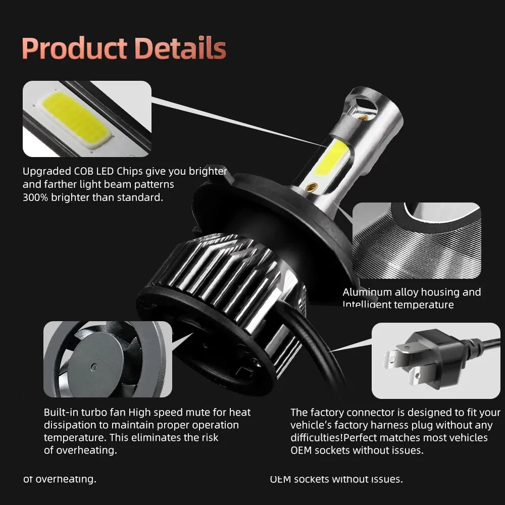 7" Inch Universal Round Cut Chrome Front Clear Glass Lens Diamond Headlights Kit 7" Inch Round Headlight Housing *Black Chrome housing with clear lens design , Lens is made out of clear glass. *Enhance visibility during night time, heavy rain, snow, or dense fog. Precision optics offers a highly controlled concentration of light to enhance visibility. *Direct replacement, easy installation. *High quality O.E grade materials to withstand the most rigorous weather *Compatible For Manufacturer Headlight Part Numbers # H6014 / H6015 / H6024 *These headlights are set up for high and low beams, just simply plug them into your original wiring. *This design is perfect replacement for old sealed-beam round headlight on any vehicle that uses standard 7” bucket. H4 HB2 9003 LED Headlight Bulbs Specifics -Color: 6000K Cool White -Power Consumption: 50 Watt -Luminosity: 10,000 LM -360 Degree / U6S Series CSP Chip Perfect Beam Angle -H4 - Dual Beam Function (You will have HIGH AND LOW!) -500% Brighter than Stock Halogen -Built in IC Circuit (Current Regulator)-Prevents LED Damage From Voltage Variations & Spikes. -Lifespan: 50,000 Hours -Operating Voltage: DC 12V / 24V -Amperage: 1.9A - 2.9A -Maintenance free, Waterproof IP67, Shockproof -Warranty 5 years Top Features 300% Brighter than Halogen: 50W 6000K cool white, 1w=100lm, with clear visibility and perfect beam pattern, so you can enjoy good vision while driving at night. Super Focused Beam Pattern: U6Splus led bulbs with 1.0mm ultra-thin centered light emitting. No dark spots or foggy light, do not blind oncoming traffic. 10mins Easy Installation: The LED bulb’s almost 1:1 design as halogen. Plug and play. No other tools are needed 360° Adjustable Beam Pattern: Adopts 360° adjustable locker ring to ensure the best beam pattern. except H1, H3, 880, PSX26W 50,000 hours Lifespan: U6S plus comes with a copper base board, cold pressed aluminum heat sink and 12,000rmp cooling fan. Better solve the dimming or over heated of led bulbs. Parcel Content: - 2 * 2-side H4 Headlight Bulbs - 2 * 7" inch headlight housing