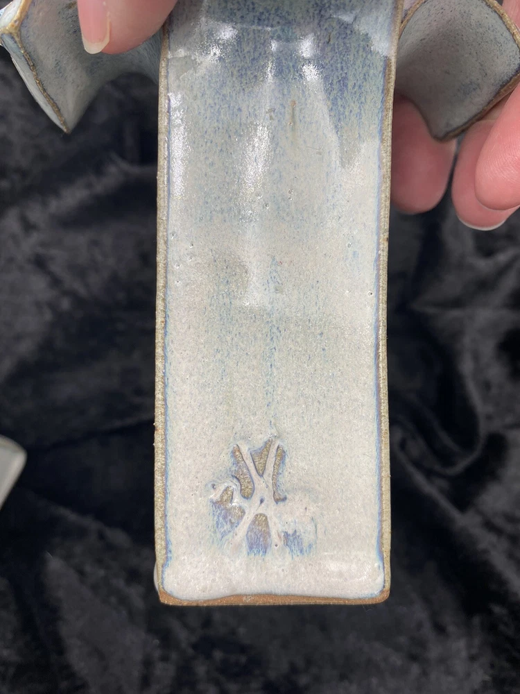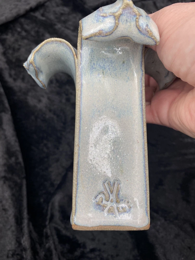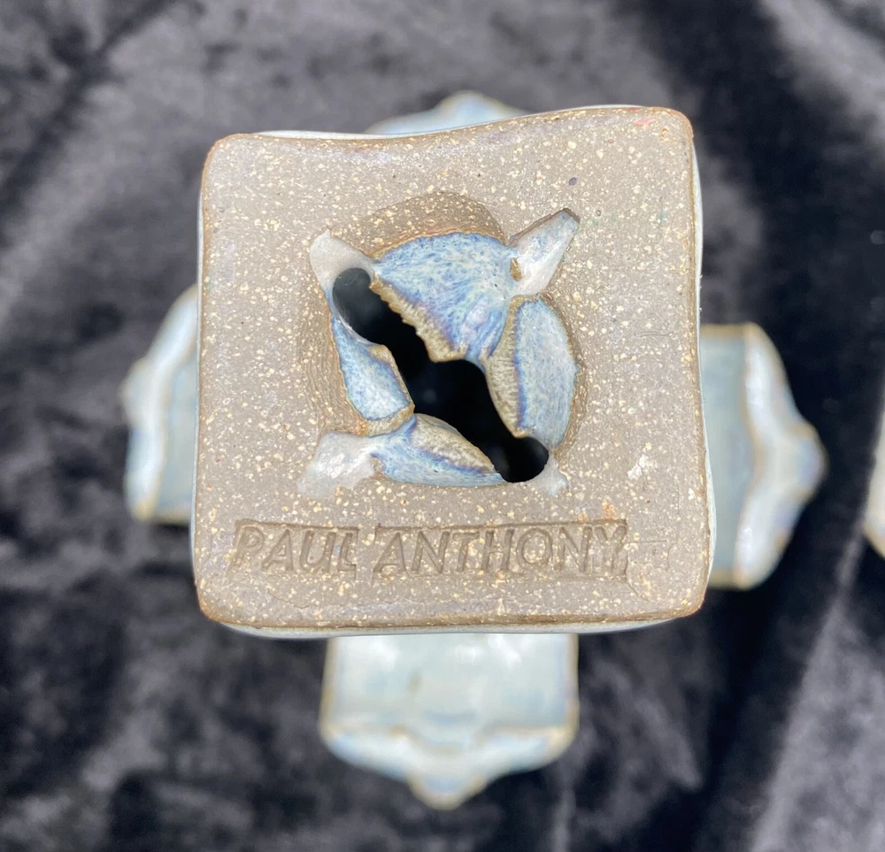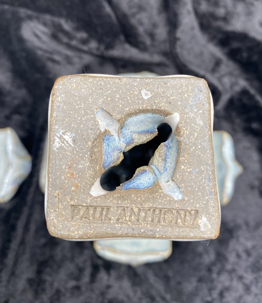 Add a touch of elegance to your home decor with this stunning pair of handmade Paul Anthony stoneware pottery lavender blue candlestick holders. These candle holders are perfect for standard taper or dinner candles, and are sure to create a warm and inviting atmosphere in any room. The glossy finish and abstract art design make them a beautiful addition to any studio theme. Crafted with care in North Carolina, these candlestick holders are a original pottery. They are signed by the artist, Paul Anthony, and come with an impressed backstamp. The pair weighs 1 pound, 11.6 ounces for the set, and measures 4.5 inches in length, 4.5 inches in height, and 4.4 inches in width. From the artist's website, "Like a flower’s calyx this candlestick holds the standard taper simply and elegantly. It’s style works well in both traditional & contemporary settings." The candlestick holders are in excellent (Mint) condition. There are no chips, cracks or signs of wear.