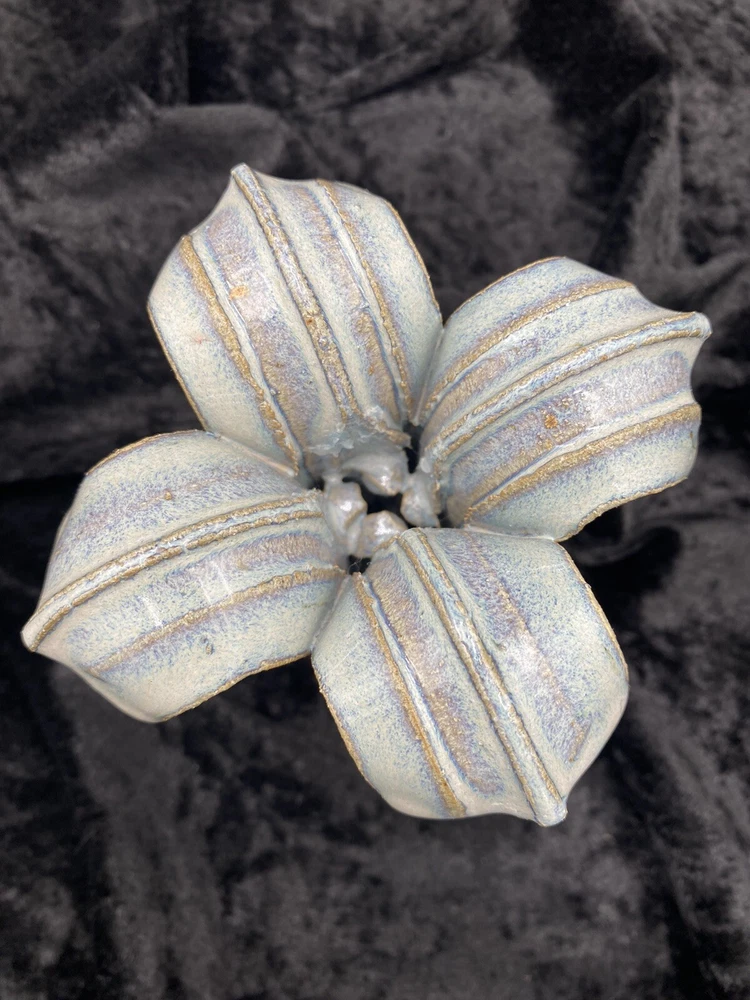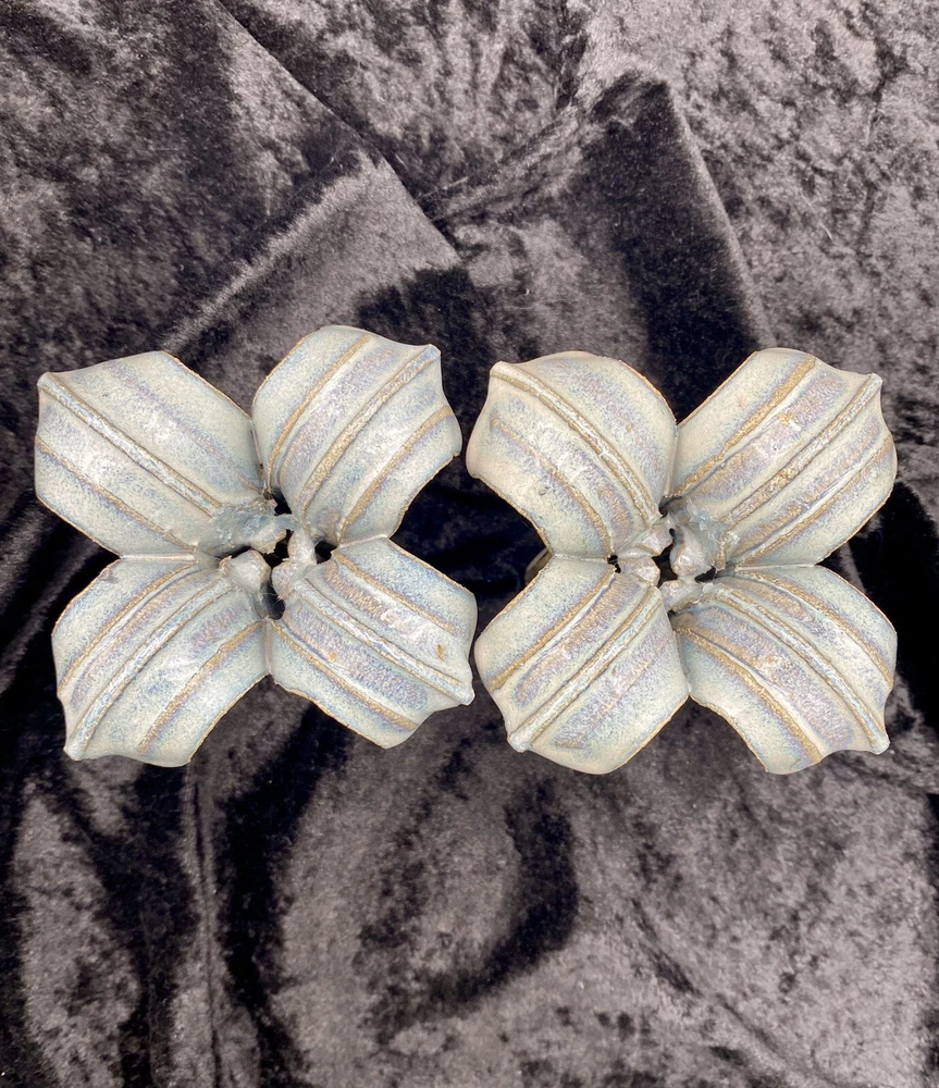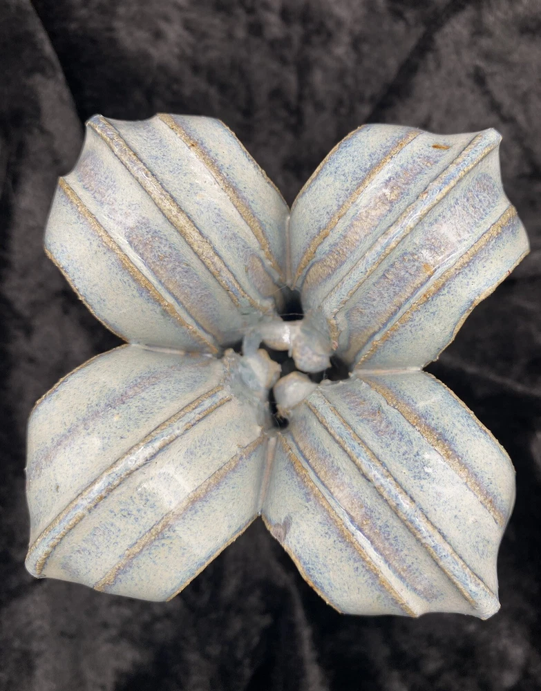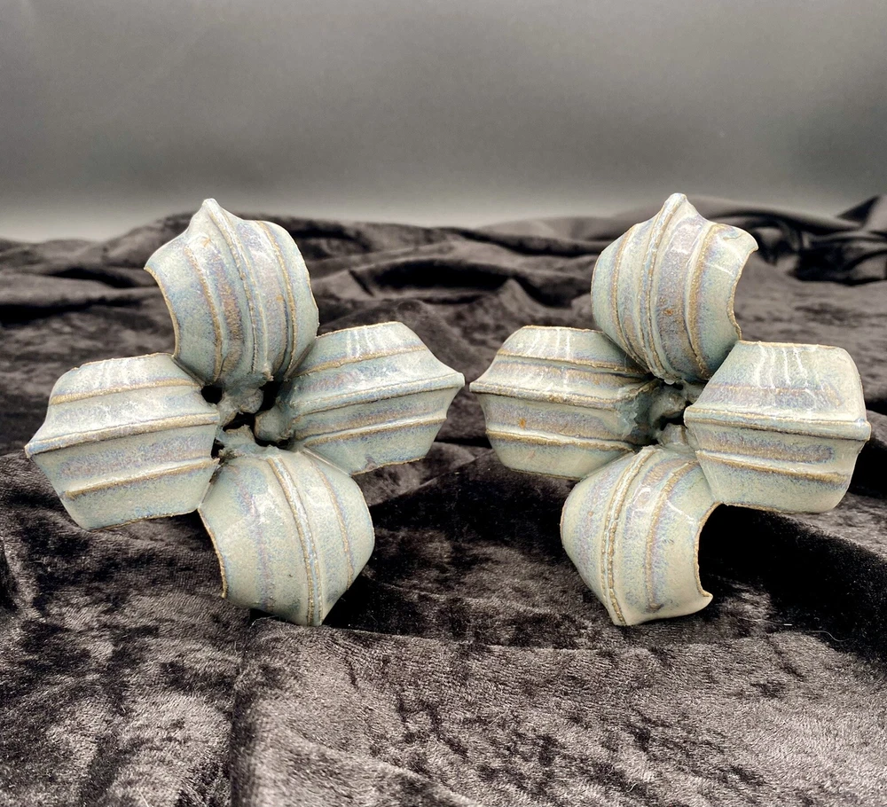 Add a touch of elegance to your home decor with this stunning pair of handmade Paul Anthony stoneware pottery lavender blue candlestick holders. These candle holders are perfect for standard taper or dinner candles, and are sure to create a warm and inviting atmosphere in any room. The glossy finish and abstract art design make them a beautiful addition to any studio theme. Crafted with care in North Carolina, these candlestick holders are a original pottery. They are signed by the artist, Paul Anthony, and come with an impressed backstamp. The pair weighs 1 pound, 11.6 ounces for the set, and measures 4.5 inches in length, 4.5 inches in height, and 4.4 inches in width. From the artist's website, "Like a flower’s calyx this candlestick holds the standard taper simply and elegantly. It’s style works well in both traditional & contemporary settings." The candlestick holders are in excellent (Mint) condition. There are no chips, cracks or signs of wear.