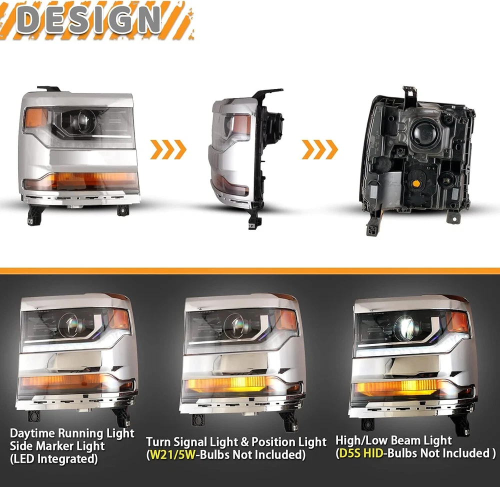Home Payment Shipping Return Policy About Us Contact Us Feedback Title Other Car Refrigerator Front Bumper Rear Bumper Fender Flares Inner Fenders Side Steps Running Board A-Pillar Light Mount Brackets Headlights For Ford For Dodge For Chevrolet For Toyota For Mitsubishi Taillights For Chevrolet For Toyota For Ford For Jeep For Dodge For Honda For Nissan For Cadillac Fog Lights For Jeep For Dodge For Chrysler For Ford For Toyota For Chevrolet For Nissan For Lexus For GMC For Cadillac For BMW For Mercedes Benz LED Headlights For Ford For Dodge For Chevrolet For Toyota LED Taillights For Toyota For Chevrolet For Ford For Jeep For GMC For Honda For Cadillac LED Fog Lights For Toyota For Ford For Chevrolet For Mercedes Benz Jeep Headlights Tail Lights Fog Lights Refrigerator Bumper Fender Flares Inner Fenders A Pillar Light Mount Brackets Side Step More Chevrolet Headlights Tail Lights Fog Lights Refrigerator Bumper Ford Headlights Tail Lights Fog Lights Refrigerator Bumper Toyota Headlights Tail Lights Fog Lights Refrigerator Bumper Dodge Headlights Tail Lights Fog Lights Refrigerator Bumper GMC Headlights Tail Lights Fog Lights Refrigerator Bumper Black Housing+Clear lens: https://www.ebay.com/itm/404542597786 Passenger Side Headlights: https://www.ebay.com/itm/405177174843 Driver Side Headlights: https://www.ebay.com/itm/405177174849 About this item ✅【Perfect fitment】Our headlights assembly perfectly compatible with 2016 2017 2018 Chevrolet silverado 1500 Xenon/HID (High Intensity Discharge). Headlights are sold in a pair: include left side (driver side) and right side (passenger side). Please confirm your vehicle’s year and model before purchase. (NOTE: For HID headlight models ONLY, NOT for LED headlight models) ✅【High Performance Headlight Bulbs】High Performance Headlight Bulbs increase forward disstance visibility as well as peripheral width. Projetor Lens give you the maximum light output and increase visiblity at night. The DRL cluster dual functions as a turn signal as illustrated above. Lasting longer and use less energy than typical incandescent bulbs making them ideal for automotive applications. ✅【Ip67 Weatherproof】Full sealed beam and housings which can reach up to IP67 weatherproof , designed with one-way vents to prevent moisture from being trapped inside the housing,ensuring pretty durability in heavy rain or terrible weather. The headlight brings a different appearance to your vehicle that's great for show use or to replace old and worn headlights.Maintaining your vehicle’s headlights increases visibility of road markings and traffic signs for reducing traffic accident. ✅【Perfect Beam Pattern】 The Super bright and Uniform Light make us better than other headlights. No Blind Area and dim spots, never blind oncoming drivers. Turn signal lights, high beam, low beam, position light and daytime running light are included as a combination, increasing safety of the driver. DOT and SAE Approved. Moreover, our headlights are designed for quick and easy installation in several minutes without any drillings or modifications. ✅【Premium Quality】This headlights are made of Special Materials which are Resistant to Water, The Dustproof and Shockproof Clear PC Lens are not easy to yellow and crack. Otherwise, the back shell is with strong impact strength and good thermostability. 100% Advanced chips add visibility crucial in Navigation Poor Weather Conditions, Including Rain And Snow, as Well as Dense Fog. Last more than 50,000 Hours. ✅【Guarantee & 24hrs Reply】We Support return for undamaged, full non-defective headlights within 60 days after receipt of goods. If any questions, please contact us directly, we will solve for you within 24hours. Our aim is to make you satisfy the parts and the service we provide for you. Perfect Fitment ✅ For 2016 Chevrolet silverado 1500 ✅ For 2017 Chevrolet silverado 1500 ✅ For 2018 Chevrolet silverado 1500 For HID headlight models ONLY, NOT for LED headlight models. Main Specification ✅ Package: 1 Pair Headlights (Left Side & Right Side) ✅ High/Low Beam Bulb: D5S HID Bulb (Not Included) ✅ Turn Signal: 7443 (Not Included) ✅ Daytime Running Light: LED (Included) ✅ Housing / Lens Material: ABS / PC ✅ Color Finish: Chrome Trim / Clear Lens ✅ Certification: DOT/SAE Compliance ✅ Wiring Harness: Not Included ✅ Replaces Original (OEM) Part: L:84388723, 84181562; R:84356947, 84181563 ; ✅ ABPA Partslink: L: GM2502445; R: GM2503445 ; Package Included ✅ 1 Pair Headlights (Left Side & Right Side) Payment Delivery details Terms of sales About us Contact us Payment We accept PayPal, credit card , Apple Pay & Google Pay etc. Delivery details All items will be shipped within 1-3 business days after payment received, we will try our best to ship out as soon as we can, hope for your understanding. Please double confirm your address and contact information, which will help the delivery faster and more accurately. Note :buyers who purchase international products need to pay import tariffs!!! Terms of sales Professional installation is highly recommended. Any problem of the item please feel free to contact us first , please D o Not leave negative feedback before that, or simply return it within 60 Days in original condition. We will resolve it for you ASAP. About us Any questions please do not hesitate to contact us directly by eBay message . We will reply you within 24 hours asap, thanks for your understanding. Contact us Should you have any problem or require any further information please feel free to contact us . If you are satisfied with our product and service, please kindly leave us a positive feedback. On Dec 9, 2024 at 21:41:37 PST, seller added the following information: