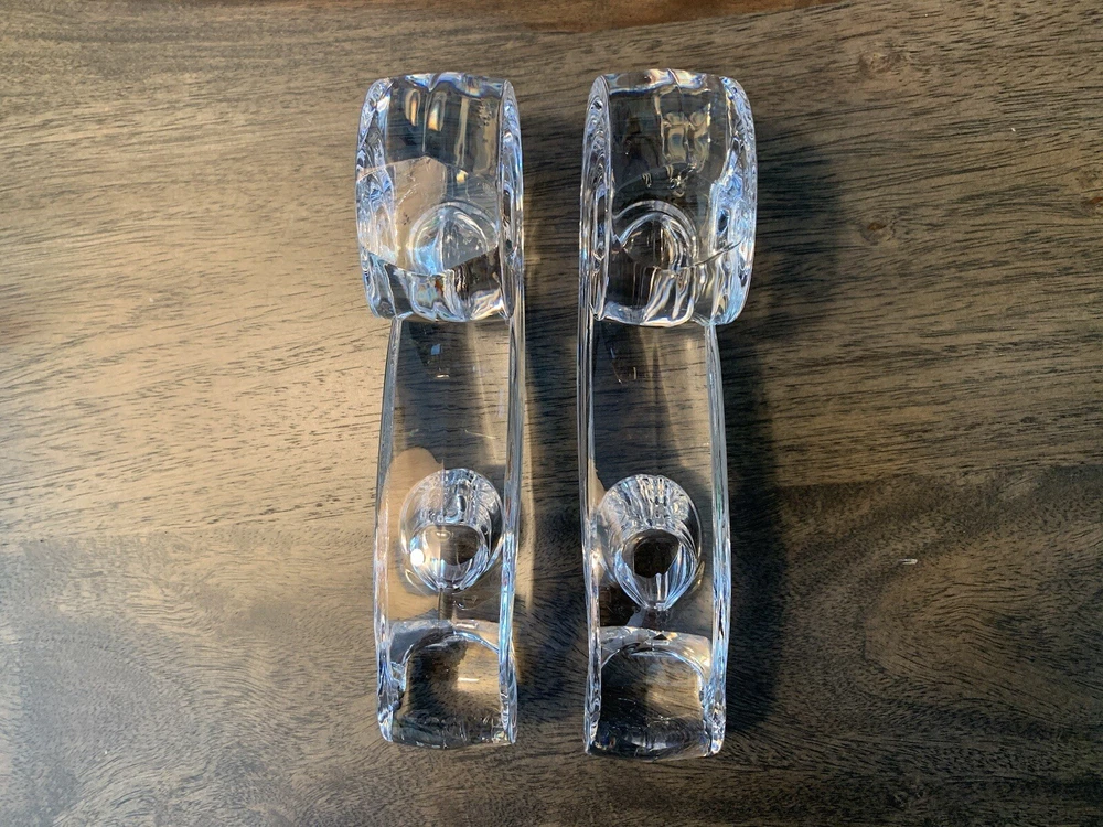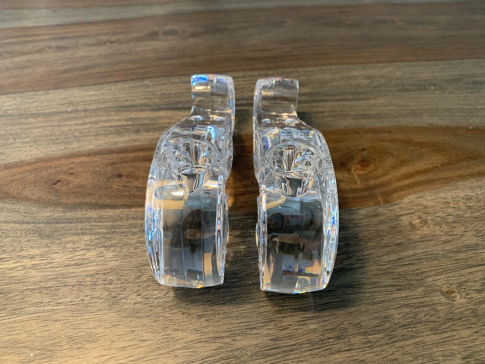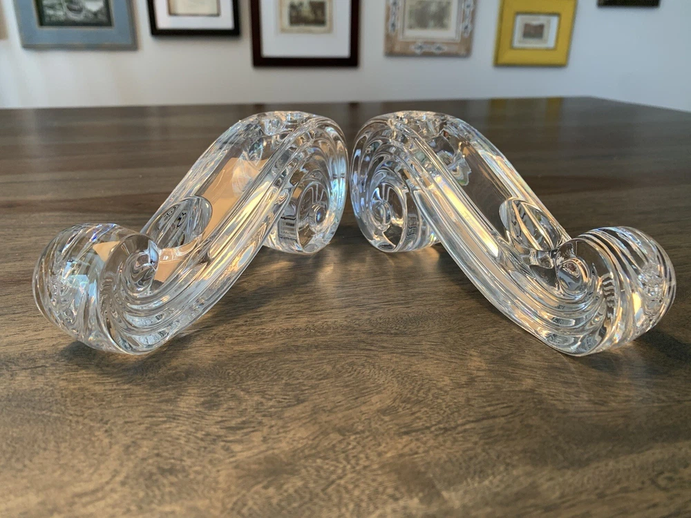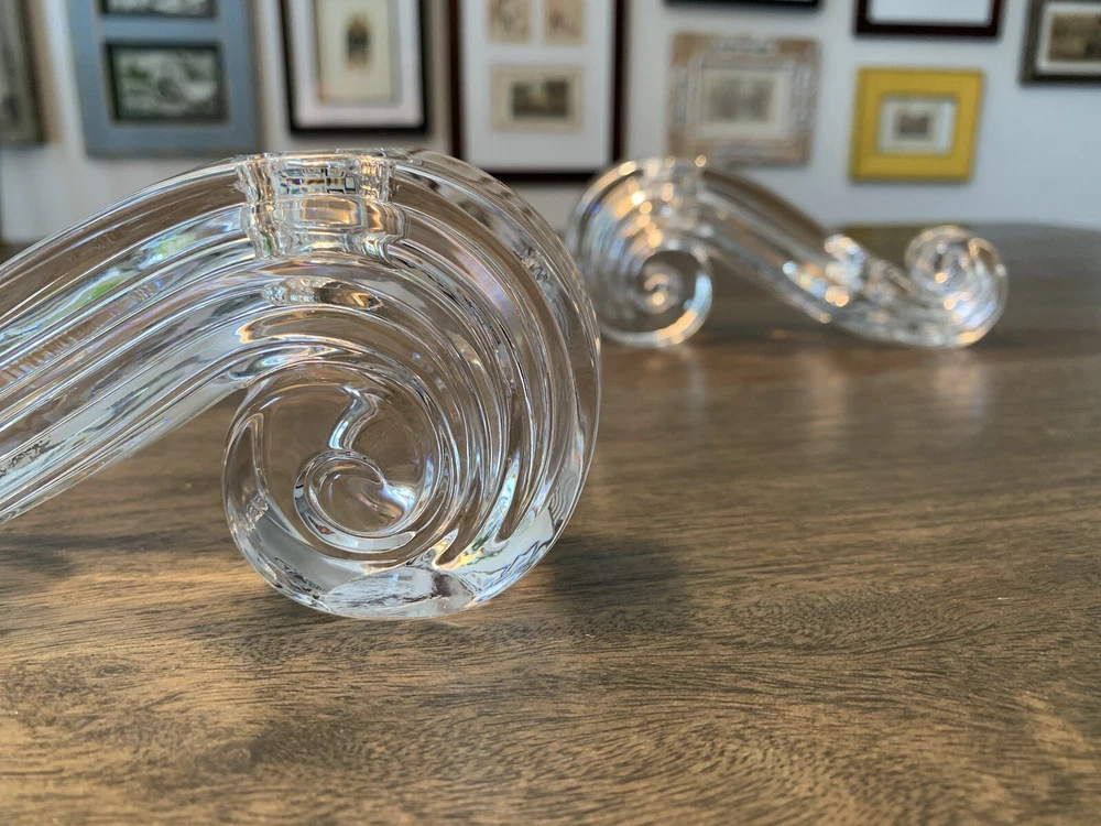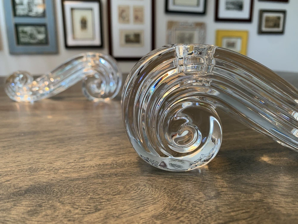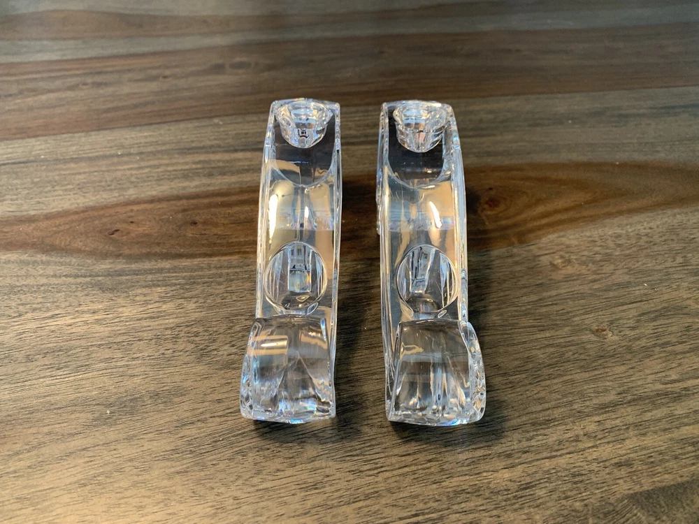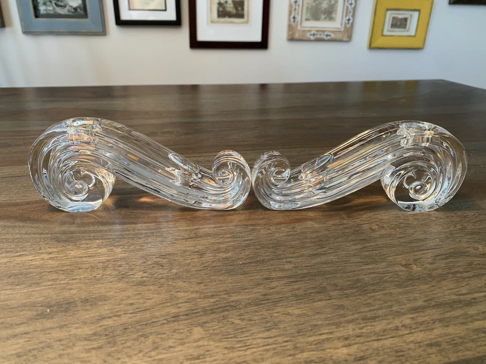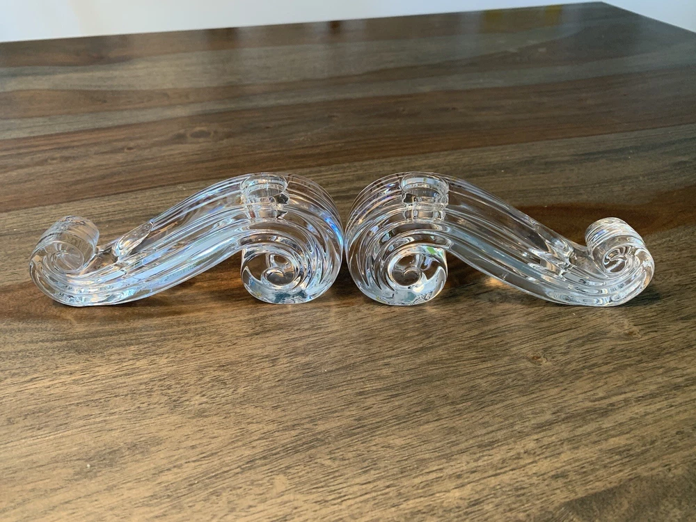 Beautiful pair of Lenox candle holders in a swirl design. These clear crystal with a classic shape will look amazing in most decors. Can fit 4 candles in total. It is in good condition with wear consistent with its age and normal use like minor scratches and one small nick . Please look carefully at the pictures, they’re part of the description. Measurements: - Length: 17 cm - height: 7 cm - width: 3 cm - weight total: 1.17 kg