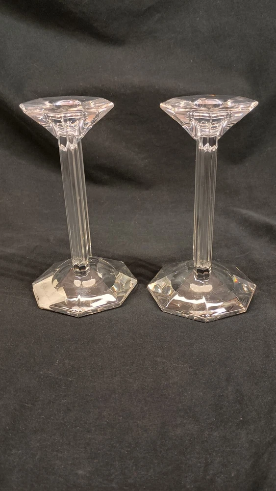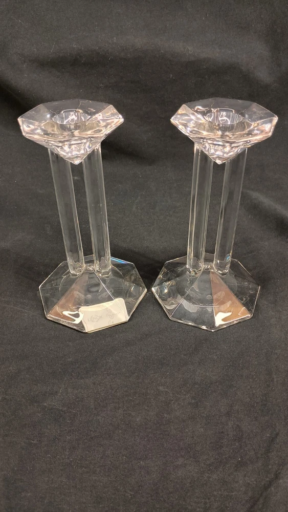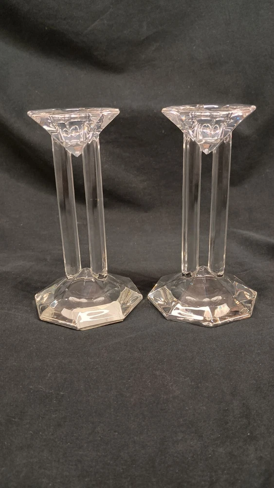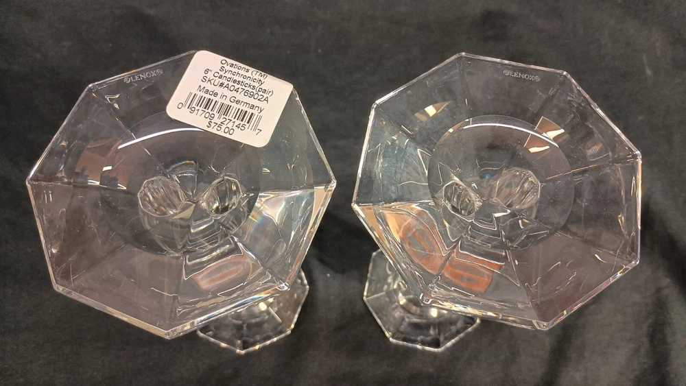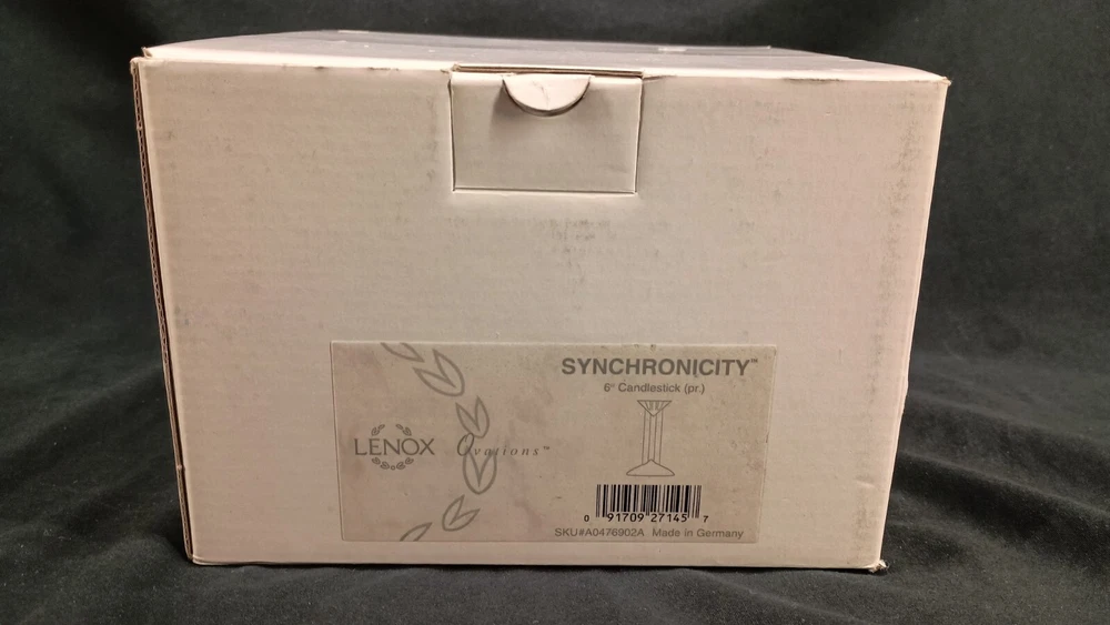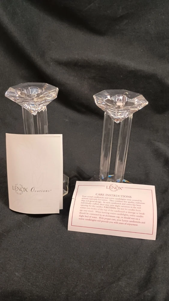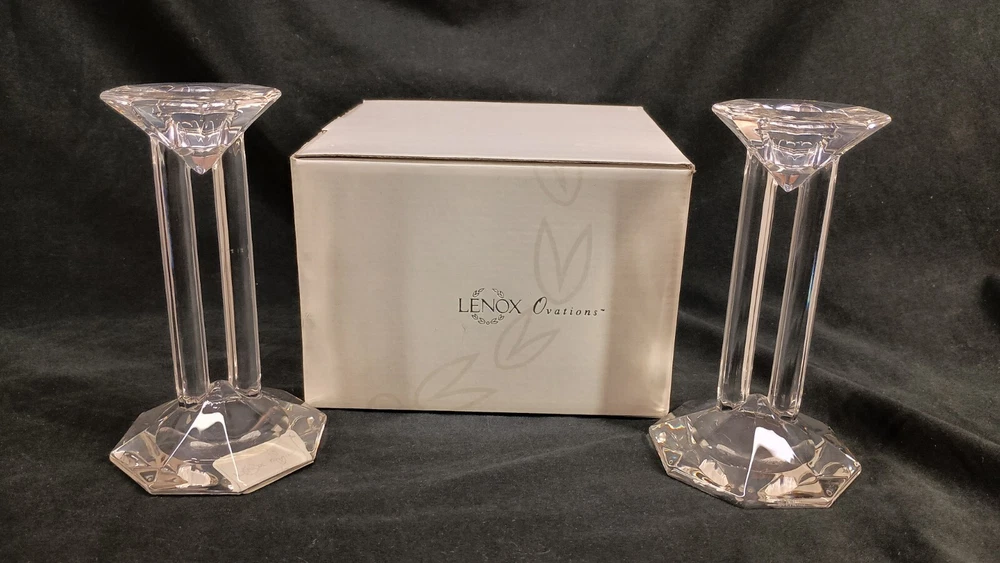 This is a pair of Lenox Crystal Ovations Synchronicity candlestick holders designed for taper or dinner candles. Made of fine crystal in Germany, they feature a contemporary geometric pattern in clear glass. These signed candle holders are 6 inches tall and come in their original packaging, making them a stylish and elegant addition to any home decor. Thank you for visiting my listing today and thank you for your interest in this item! My goal is to have a pleasant transaction resulting in a satisfied customer. I hope any transaction between us leaves you with a feeling of confidence knowing you can trust me and the items I offer here. *Most if not all my listings are set to accept offers. Feel free to send an offer and I will be happy to consider it!! *Please contact me with any questions or concerns and I will be happy to help. *Always examine the photos carefully, and if in doubt, email me with any questions you may have. *Please note that condition statements are offered as a guide only. They will always be somewhat subjective and reflect our opinion, which may not necessarily agree with someone else's opinion. PLEASE READ: I aim to please and I want my buyers to have a positive transaction with me. If you have questions, concerns, or special requests related to any of my items I hope you will contact me so we can work them out to your satisfaction. I sell my items to give you a great item at a decent price while making a little profit at the same time. If you feel the item you are interested in is too pricey do not hesitate to send me a fair offer and I will consider it. My goal is to satisfy your needs and mine so both parties can benefit. SHIPPING: If you prefer a different shipping method or company please contact me and I will do all I can to make that happen. If you have concerns or requests about the packaging of your item contact me and I will do all I can to accommodate them. Shipping costs are based on location in each state or country, the costs always differ. After I have received your payment I will ship your item out within 3 business days or less excluding weekends and holidays. BEFORE PURCHASING & BIDDING: **Please see all the pictures. I do not have great photography skills but I try to get the most accurate photos I can. If you are unsure about something you see in a photo contact me so I can do what I am able to answer your concern about the item. **I cannot stress enough that if you have any questions or concerns please contact me before purchasing and bidding. Communication can solve so much. **As a customer myself, I understand the meaning of customer satisfaction and my goal is to have nothing but satisfied customers. If you are not unsatisfied with your purchase I ask that you please contact me so I can take care of your issue. My goal is for you to be 100% satisfied. INTERNATIONAL BUYERS WELCOMED - PLEASE NOTE: I welcome International buyers! Please be aware that any custom/duties/taxes that the parcel might incur once it is out of the USA are the responsibility of the buyer. Please check with your country's customs office to determine what these additional costs will be prior to bidding or buying. Please refer to the eBay Site Map for more information if needed.