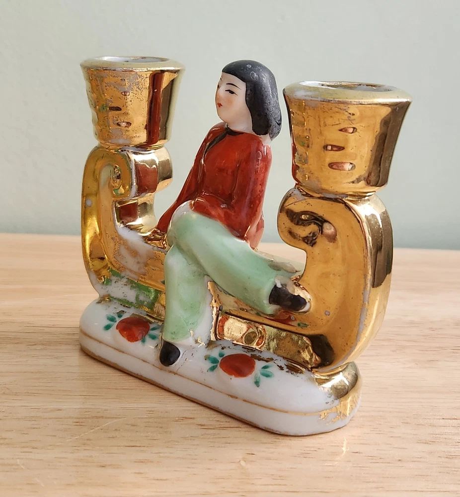 Both measure 4 in wide and a little under 4 in tall. The part that the candle goes in measures about 1 in across and a little under 1 in deep. There is a lot of paint loss as shown in photos. The bottoms are marked "22 k gold' and appears to have "made in japan", but someone has crossed this out.