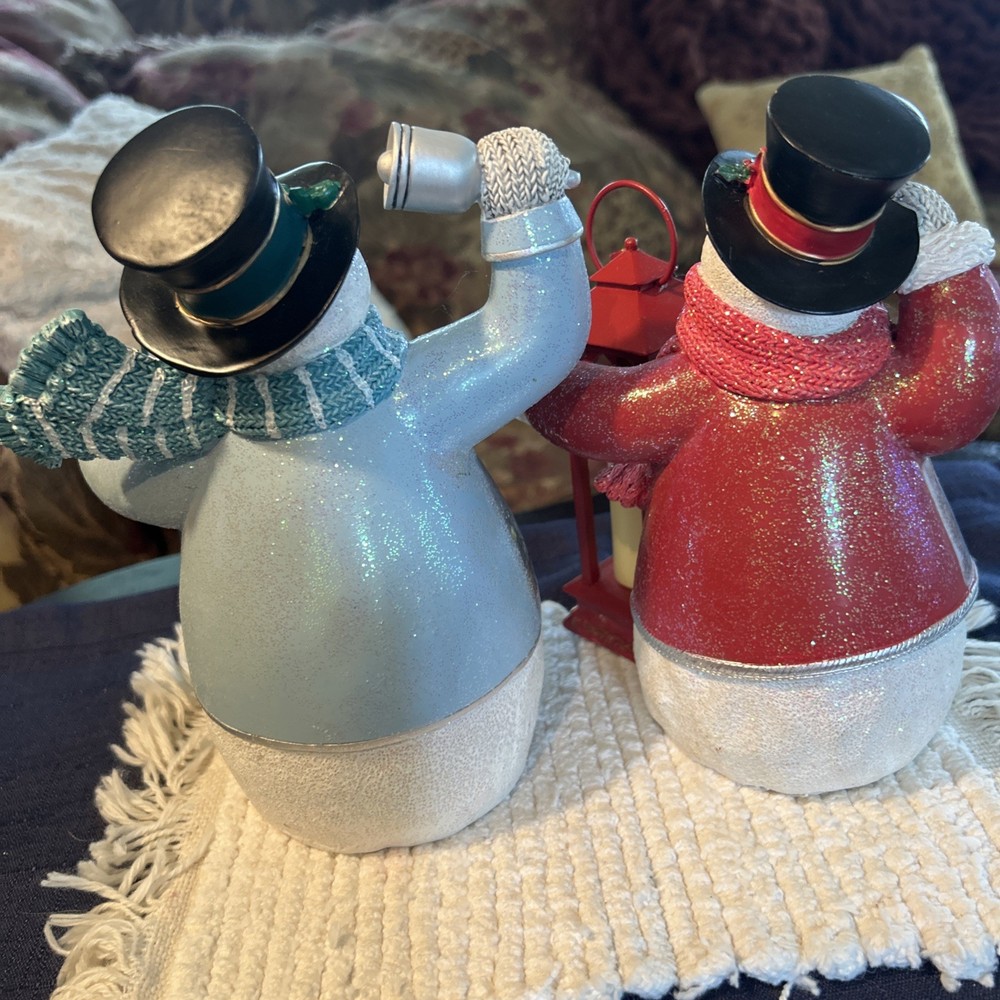 Beautifully charming pair of flameless snowmen. Both hand crafted and painted Thomas Kinkade (The Bradford Exchange) Limited Edition numbered 1- ringing bell in ice blue coat with a green lantern. “Ringing in the Holidays” “Warm Wishes” snowman 0403, 2- tipping hat in bright red coat holding a red lantern “Winter Welcome” “Warm Wishes” 1185. Both are illuminating with black top hats and coordinating knit scarves and mittens that look very realistic. New but no box. Each approx 7 1/2” H x 5” L x 3 1/4” W. Questions welcome.