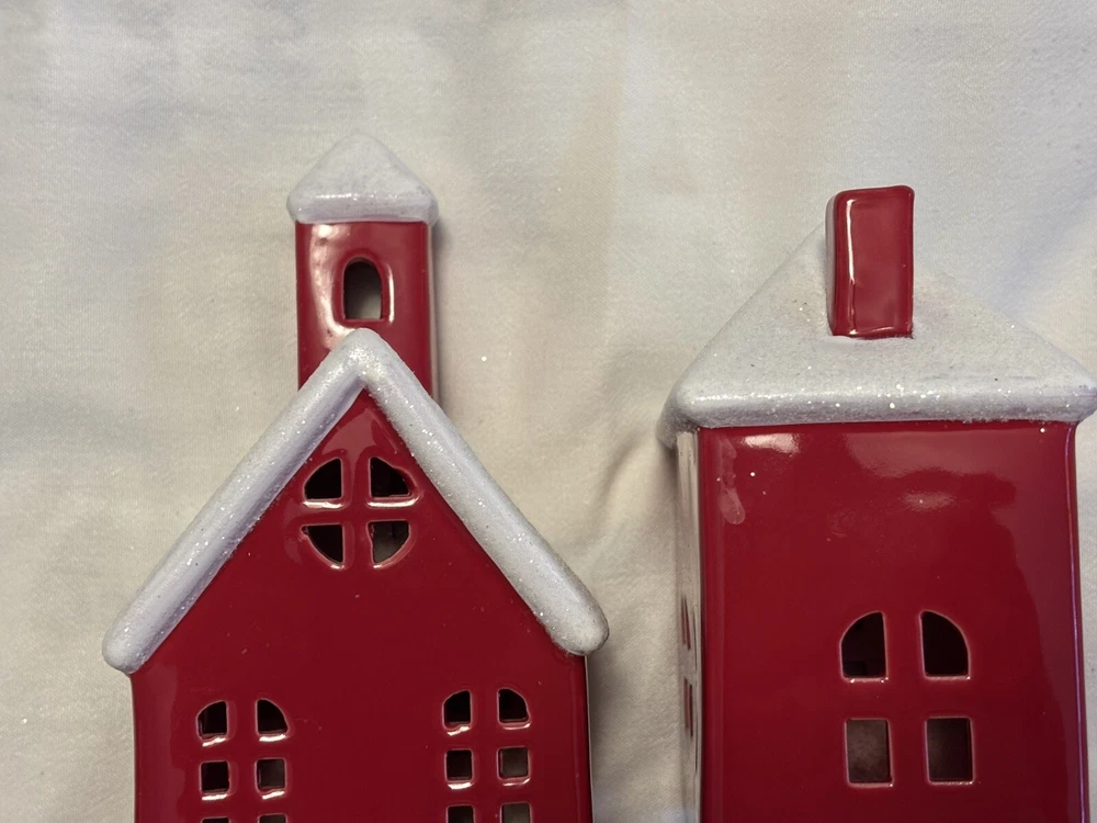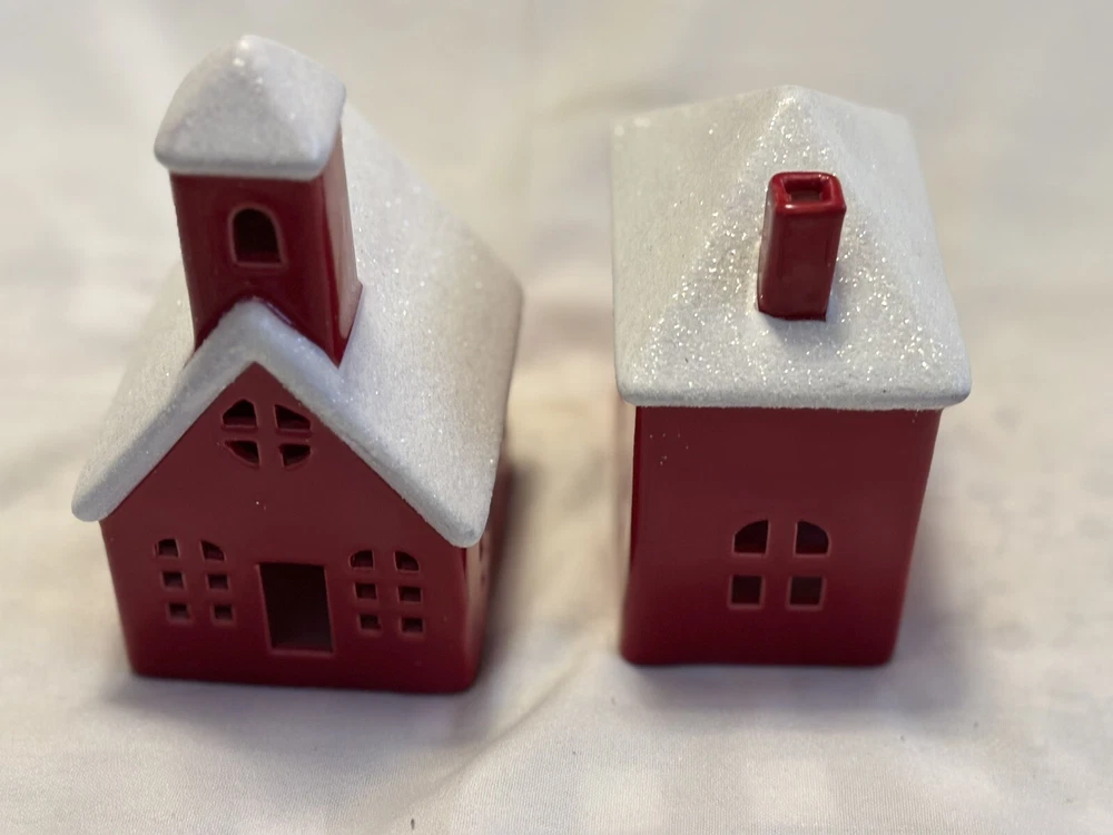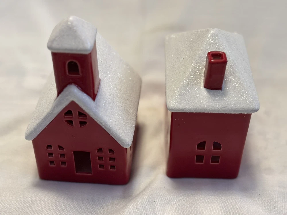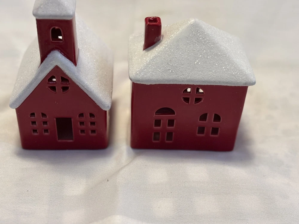 The "Red Houses Ceramic Snow Roofs" is a set of two small ceramic houses ( one house/ one church) figurines featuring red houses with snow-covered roofs. These American-style houses have a 3D effect and a high gloss finish, making them suitable for displaying on windows or furniture in any room. The design features a snowy village theme, perfect for the holiday season, or all winter long. The a glossy red and white color scheme adding a festive touch. Each house measures 4.5 inches in length and 6 inches in height, and they weigh a total of 2 pounds. Sold as set. Made in China in 2020, these houses are part of the Snow Village collection. The houses are for decor and are NOT a toys! Returns accepted within 30 days; buyer pays return shipping