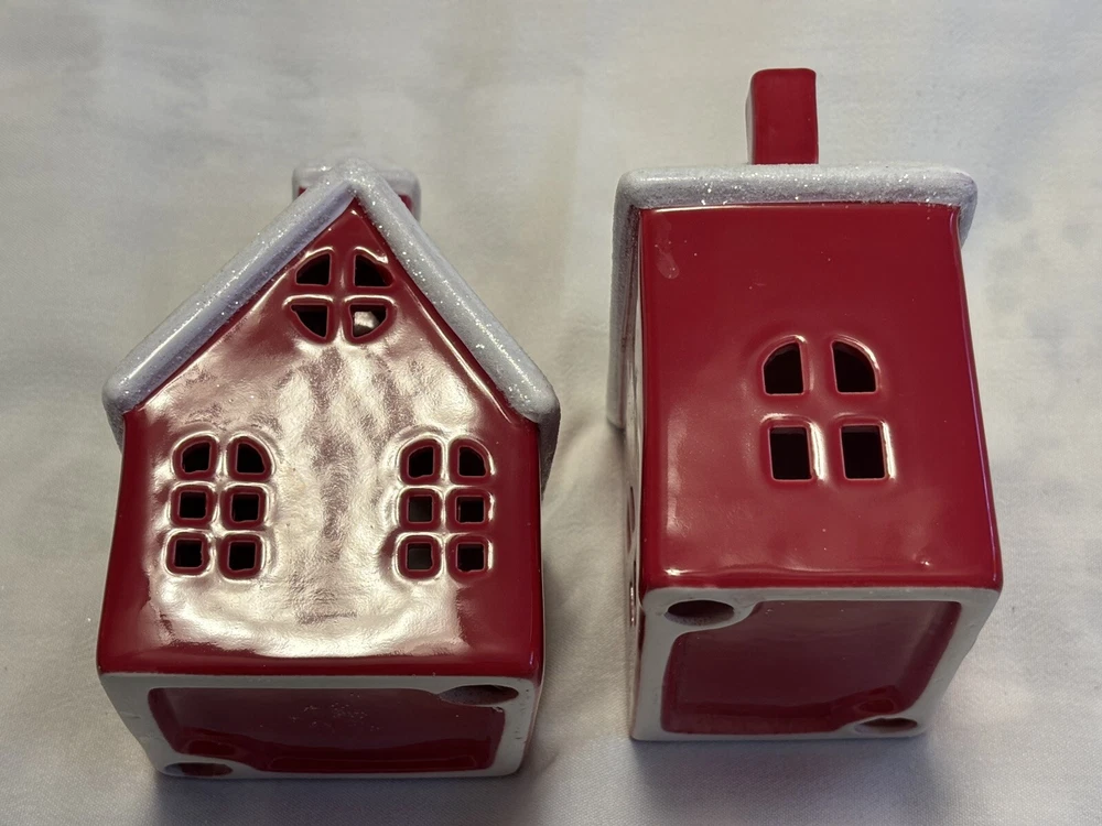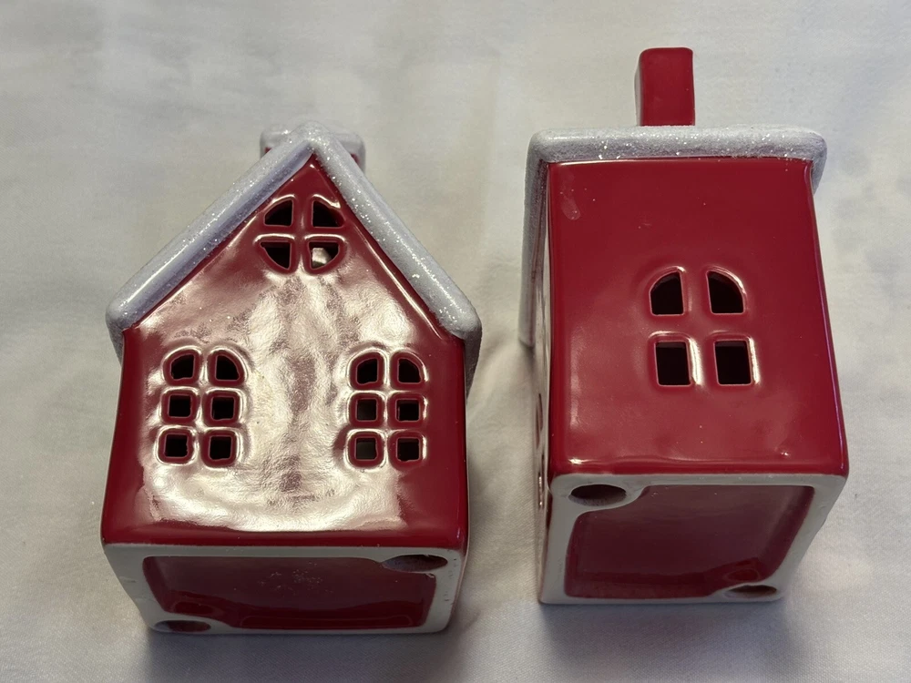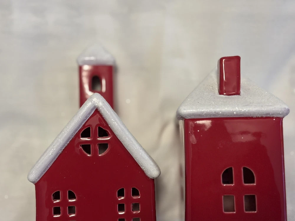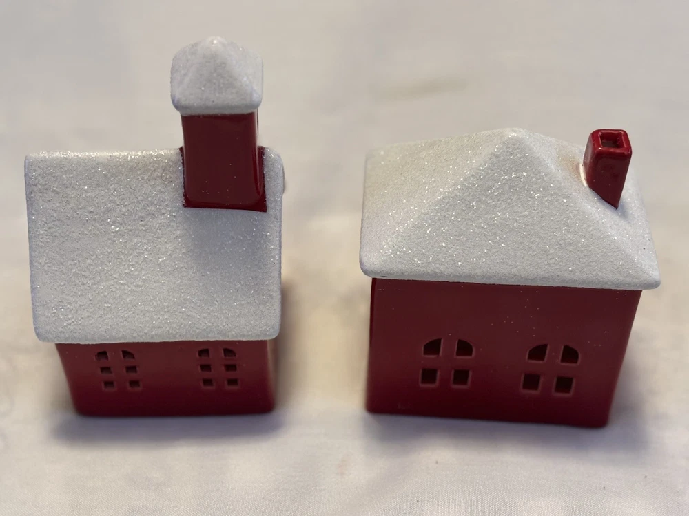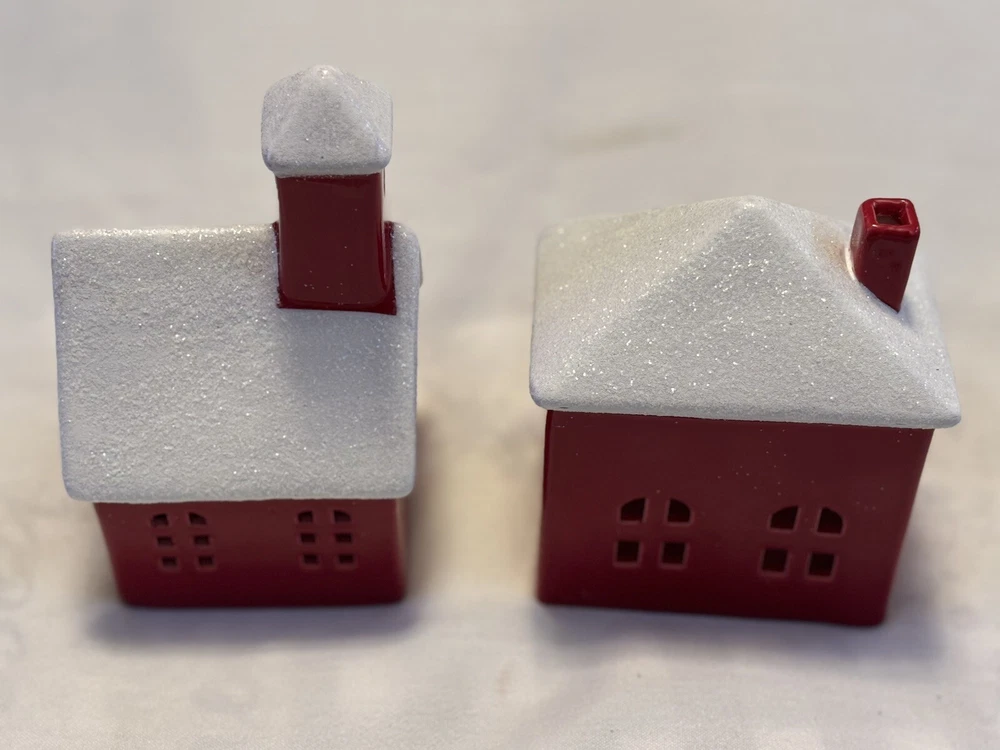 The "Red Houses Ceramic Snow Roofs" is a set of two small ceramic houses ( one house/ one church) figurines featuring red houses with snow-covered roofs. These American-style houses have a 3D effect and a high gloss finish, making them suitable for displaying on windows or furniture in any room. The design features a snowy village theme, perfect for the holiday season, or all winter long. The a glossy red and white color scheme adding a festive touch. Each house measures 4.5 inches in length and 6 inches in height, and they weigh a total of 2 pounds. Sold as set. Made in China in 2020, these houses are part of the Snow Village collection. The houses are for decor and are NOT a toys! Returns accepted within 30 days; buyer pays return shipping