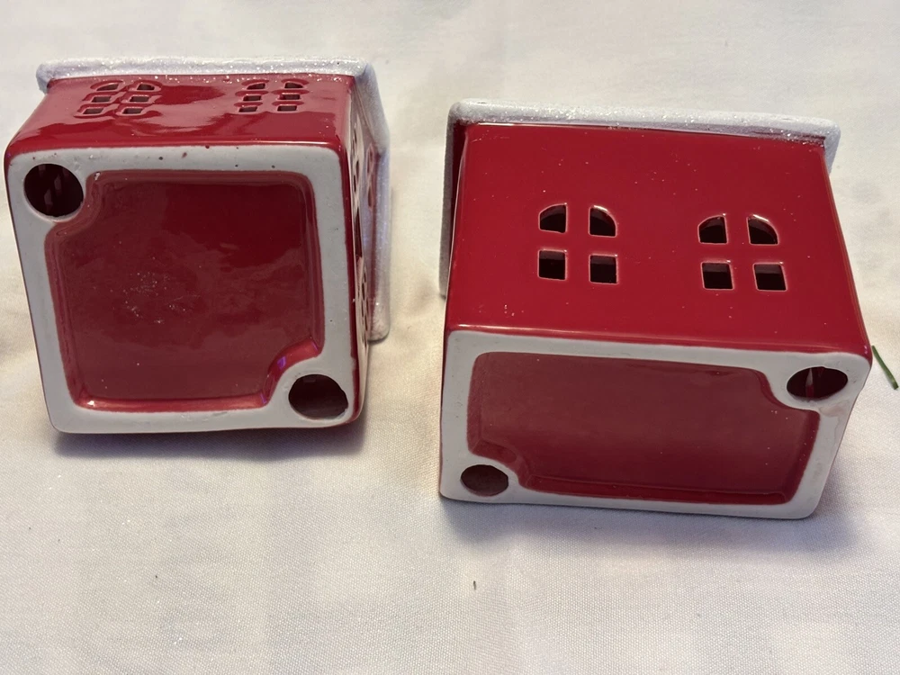 Pair Of Red Ceramic Houses With Solid Snow White Roofs 1 House 1 Church Preowned
