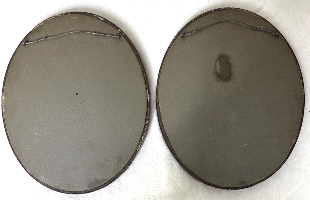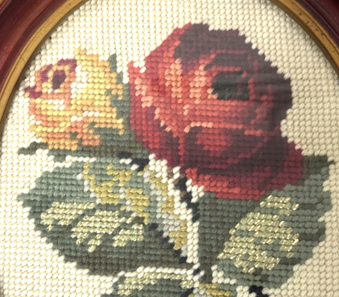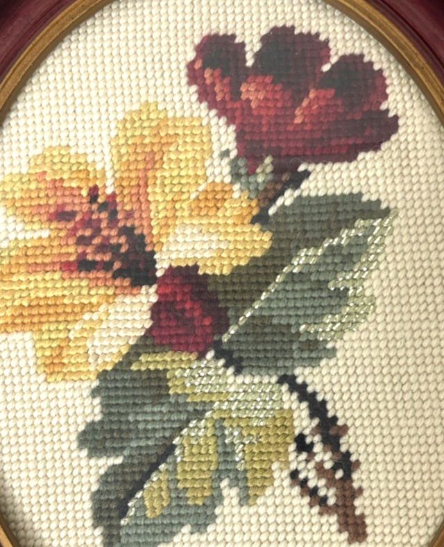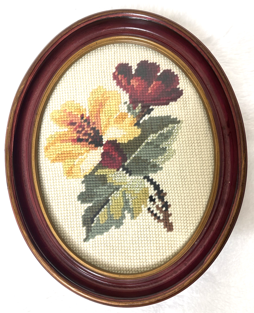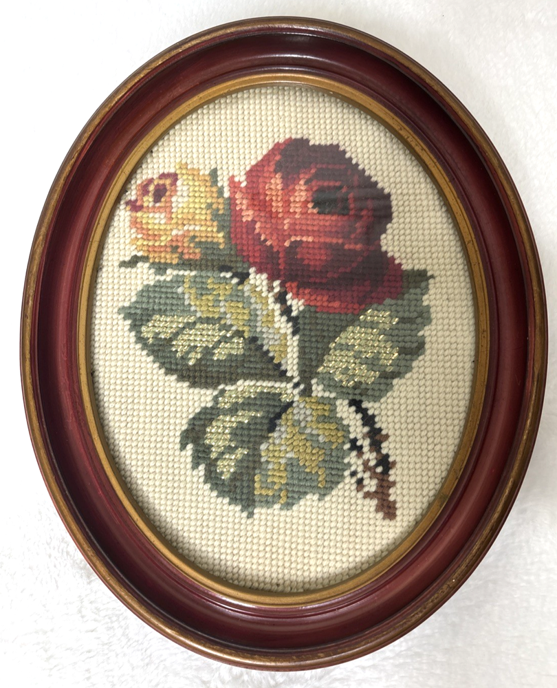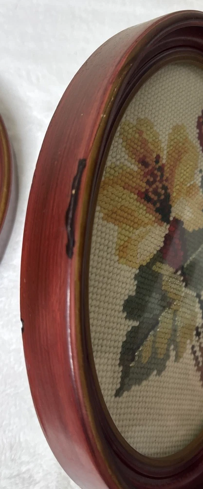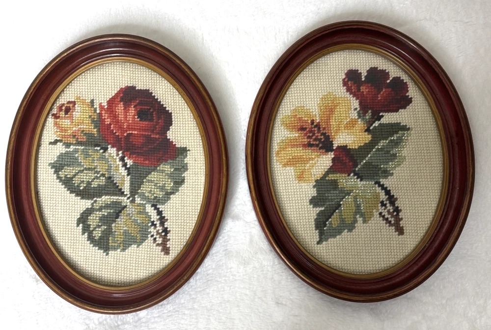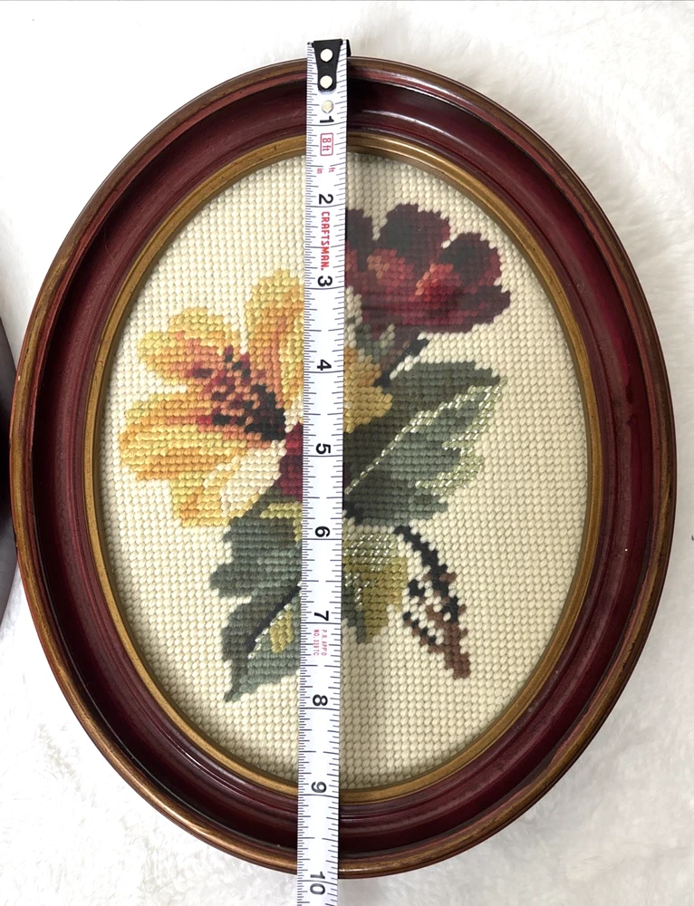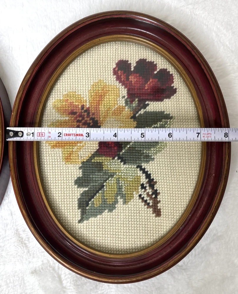 This product is a pair of vintage floral needlepoint pieces in oval frames with a glass front, measuring 8 x 10 inches and featuring roses in reds and yellows, and a silver thread running through them. The brand is handmade in the United States, making each piece unique and crafted with attention to detail. These framed needlepoint pieces are a beautiful addition to any home decor, bringing a touch of classic charm and sophistication with their intricate designs and high-quality craftsmanship. These are pre-owned; please look at all pics as they are part of description. I have shown a couple of small issues with the SIDE of the frames.