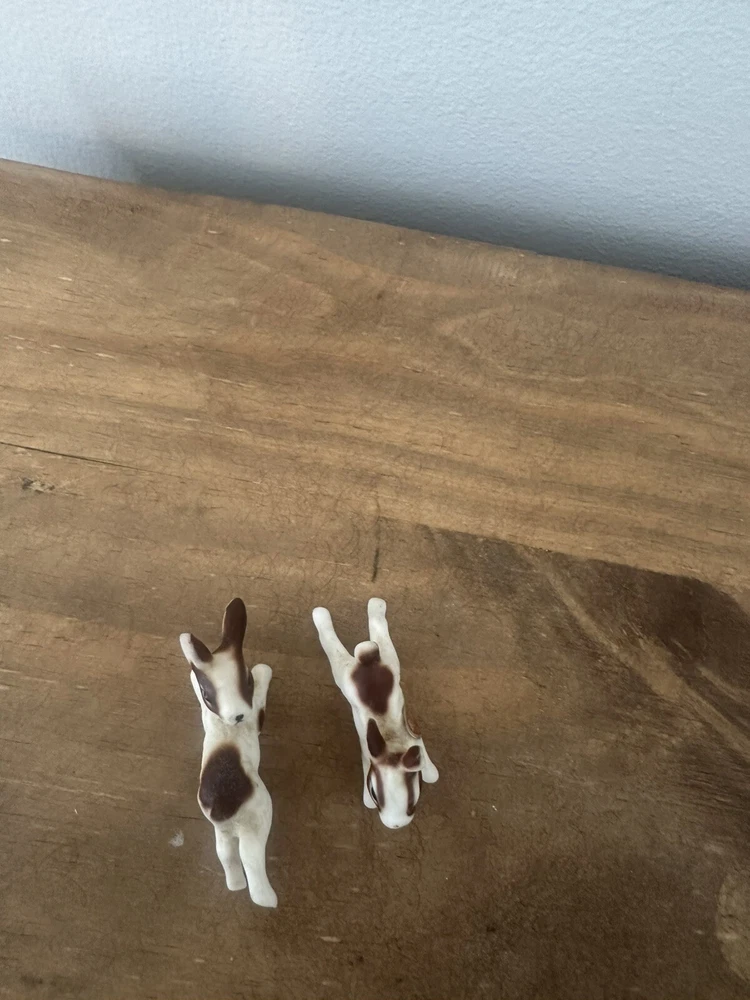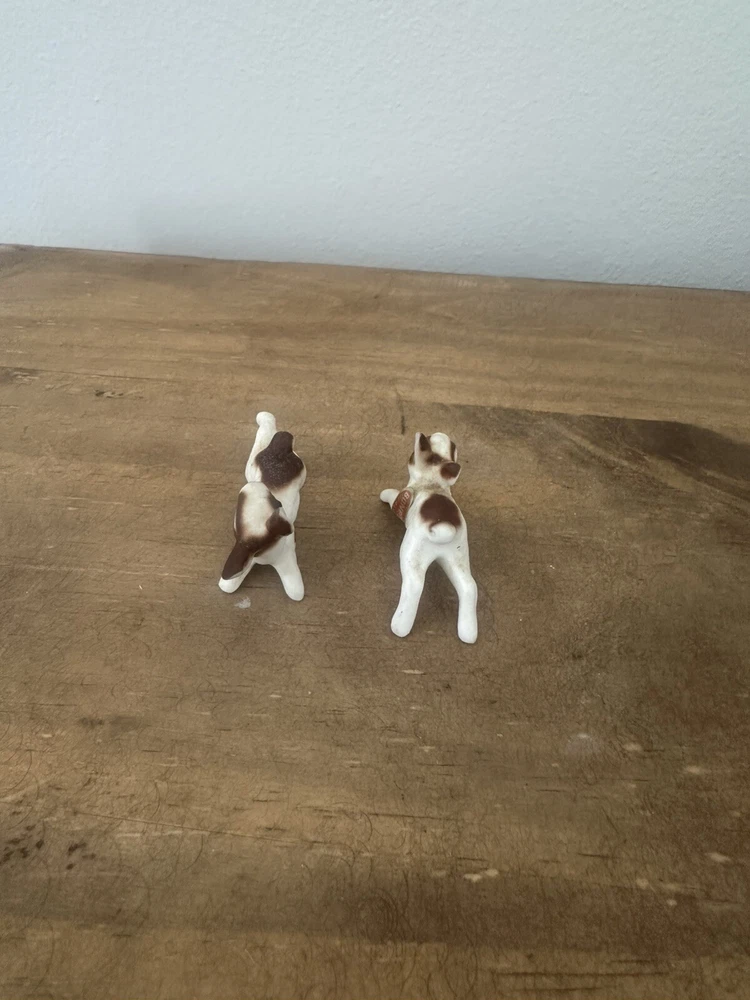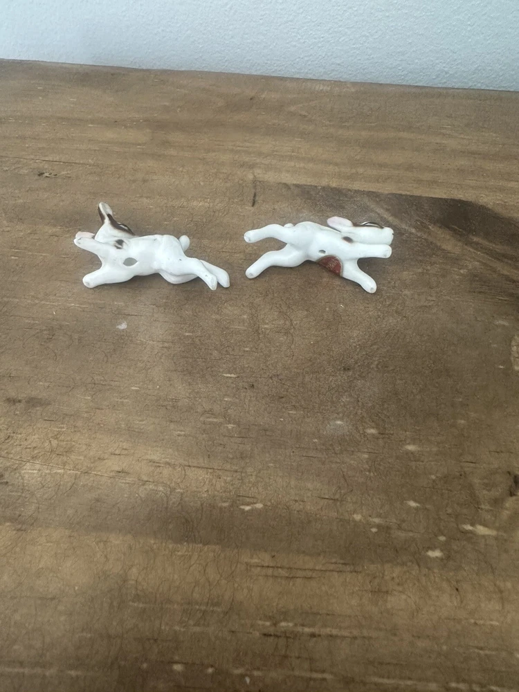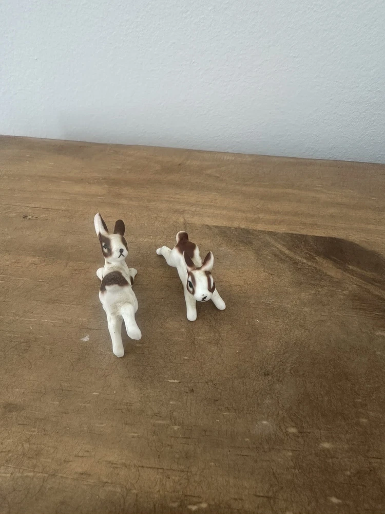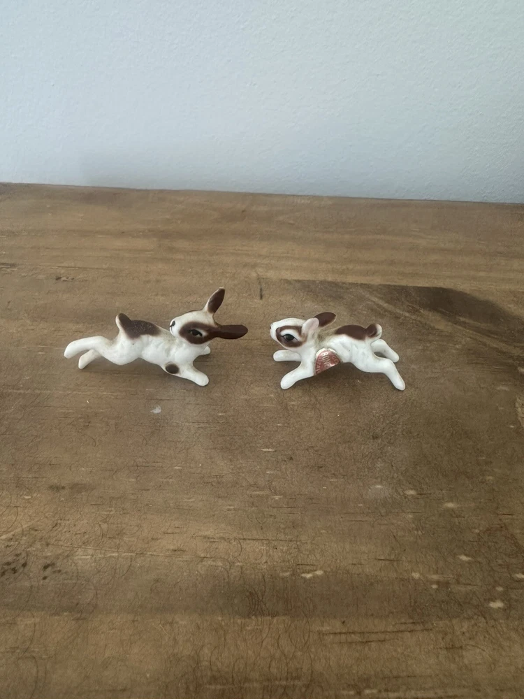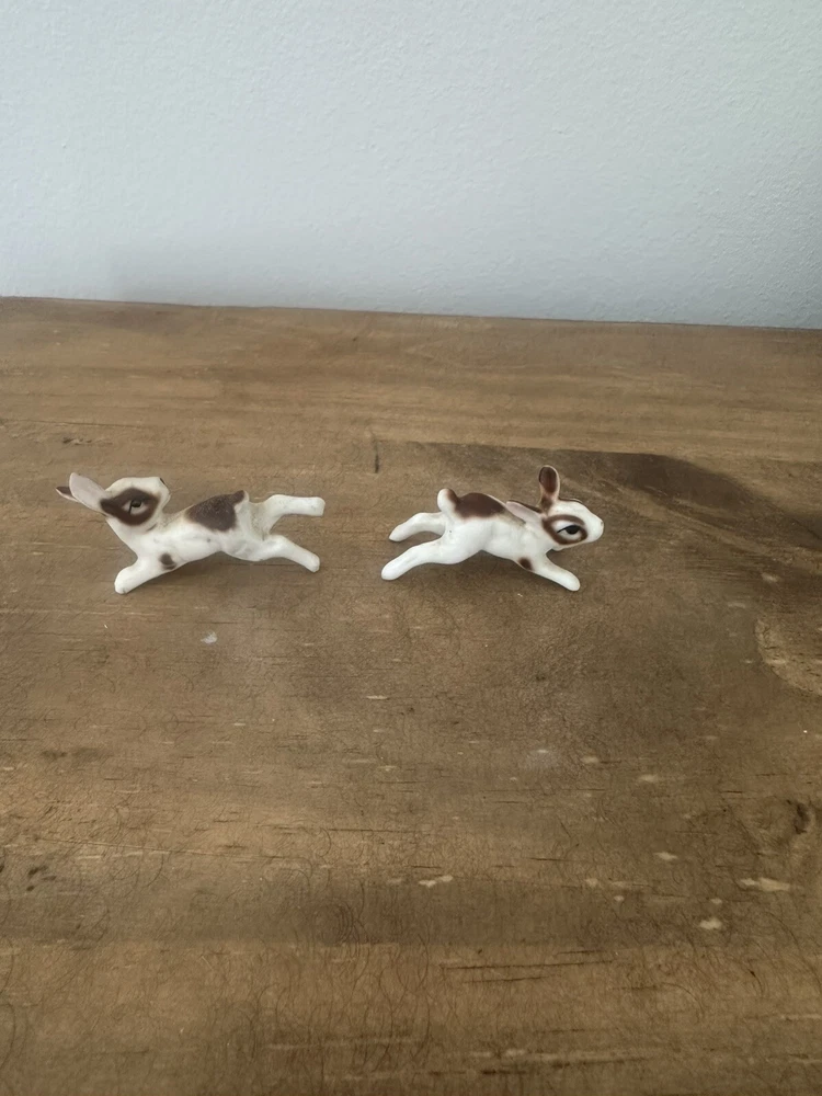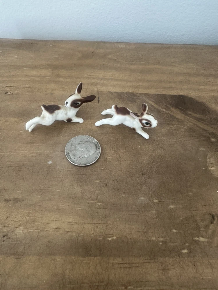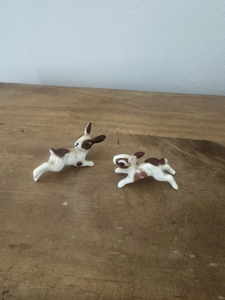 This product is a pair of vintage miniature figurines made of bone china. The rabbits are brown and white in color and were made in Taiwan. They are not handmade and are not associated with any specific brand. The figurines are small in size and would make a great addition to any collection of animal figurines. No chips or cracks