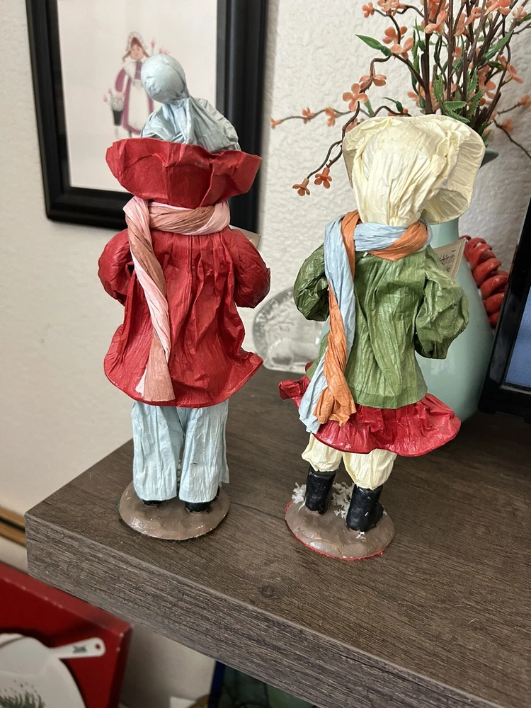Add some vintage charm to your Christmas decor with this pair of paper mache figurines. These carolers are perfect for the holiday season and will bring a touch of festive cheer to your home. Crafted from high-quality materials, these figurines are sure to last for years to come. Measuring at 9.5 inches, these medium-sized figurines are ideal for display on a shelf or tabletop. The multicolor design and intricate details make them a great addition to any collection. Whether you're a collector or just looking for a unique Christmas decoration, this pair of vintage paper mache figurines is sure to impress.