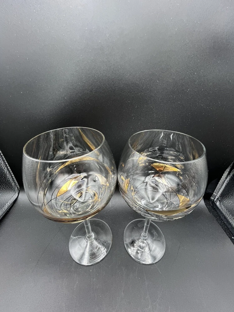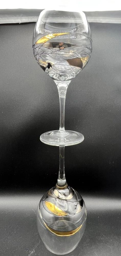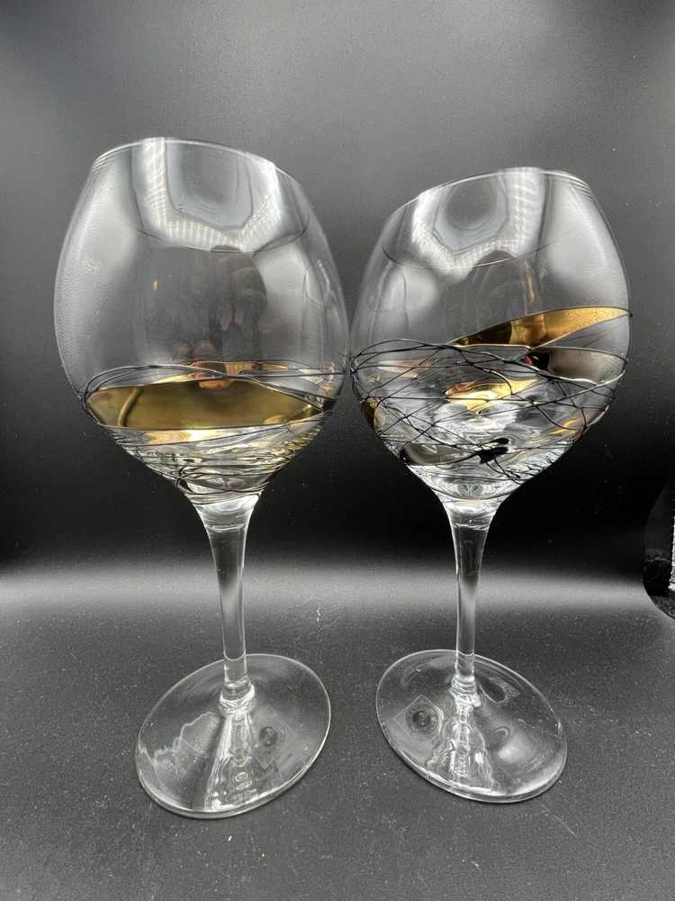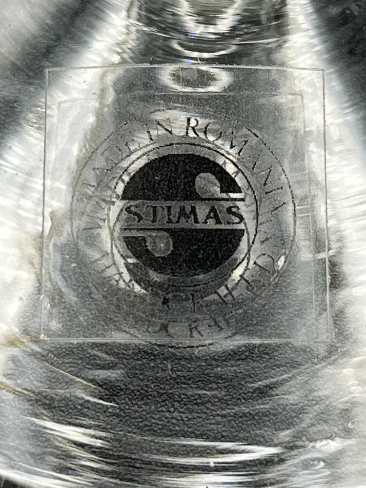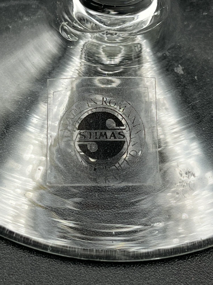 Pair of Stimas Romania 8” Tall Stemware Stained Glass Red Wine Glasses, hand-blown and decorated with an abstract design. The set includes two red wine glasses, perfect for all occasions. Made of glass, the contemporary style glasses feature a round shape and stand 8 inches tall and 8.25” tall. Each glass is adorned with a unique abstract pattern, adding a touch of elegance to your dining experience. Original sticker.