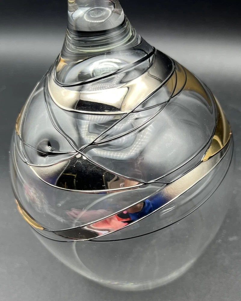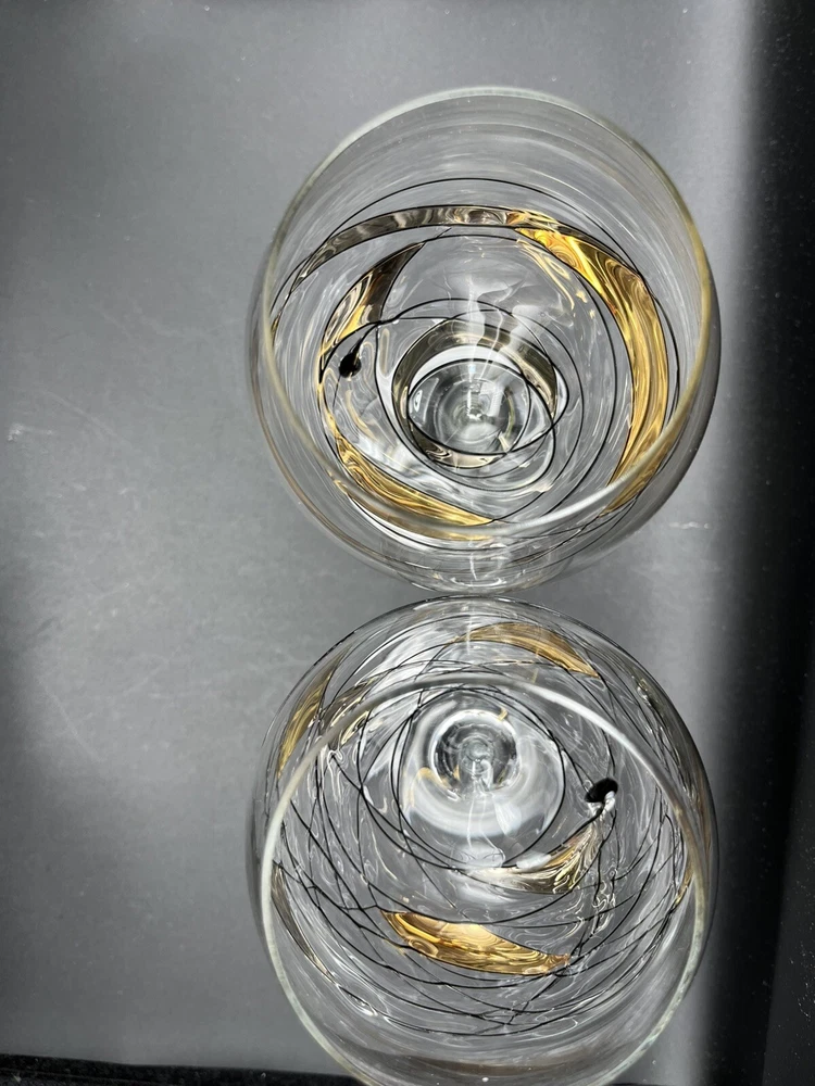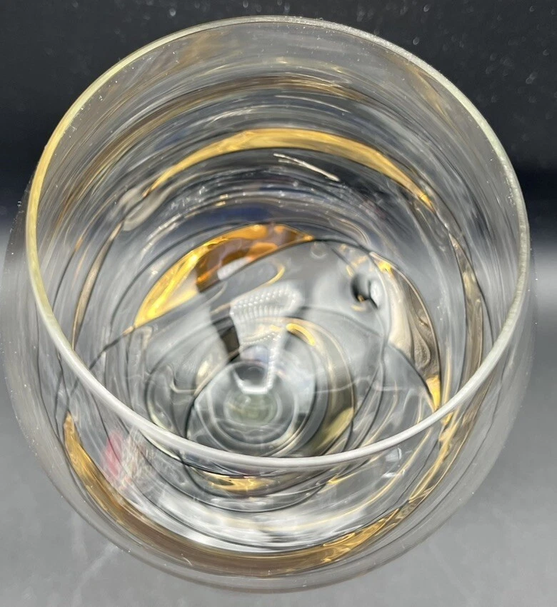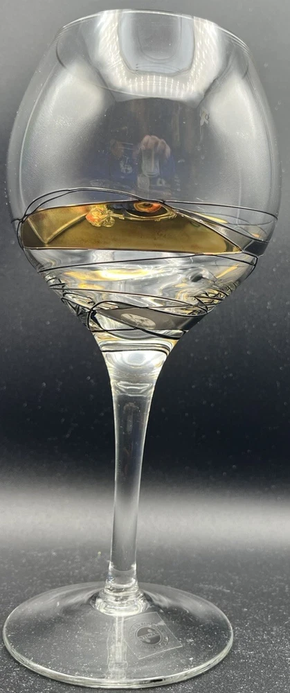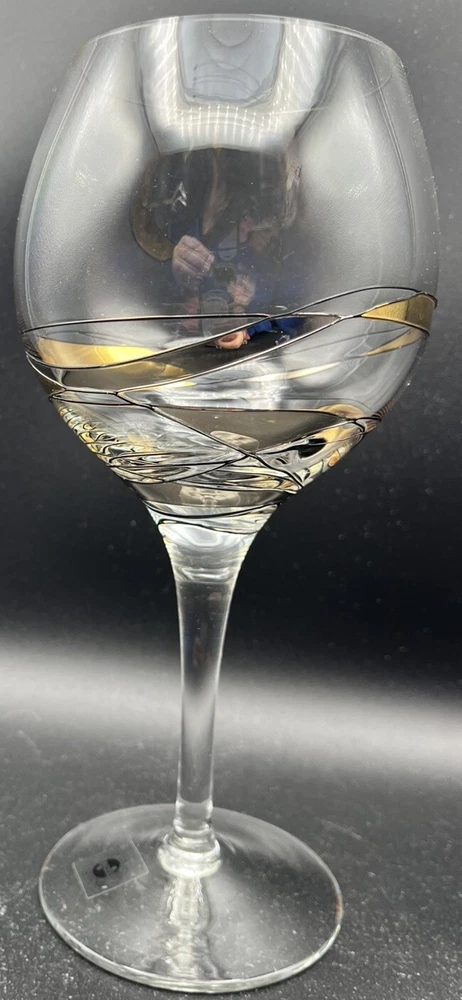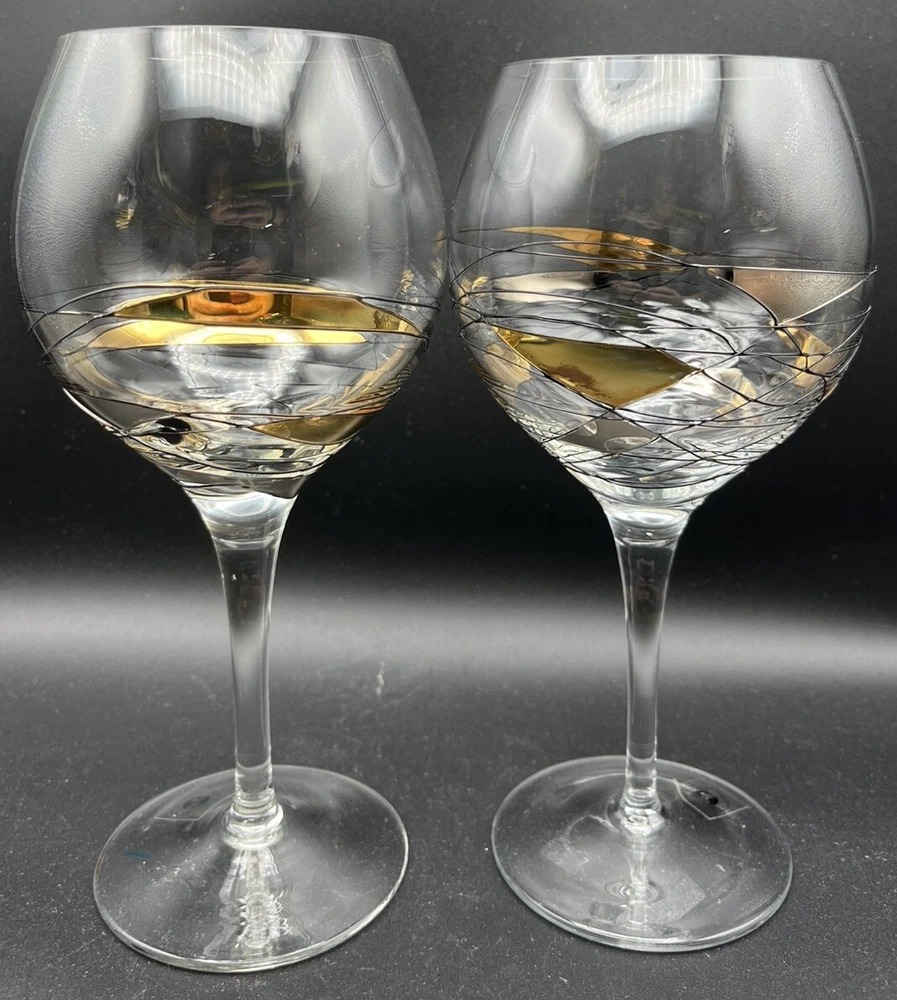 Pair of Stimas Romania 8” Tall Stemware Stained Glass Red Wine Glasses, hand-blown and decorated with an abstract design. The set includes two red wine glasses, perfect for all occasions. Made of glass, the contemporary style glasses feature a round shape and stand 8 inches tall and 8.25” tall. Each glass is adorned with a unique abstract pattern, adding a touch of elegance to your dining experience. Original sticker.
