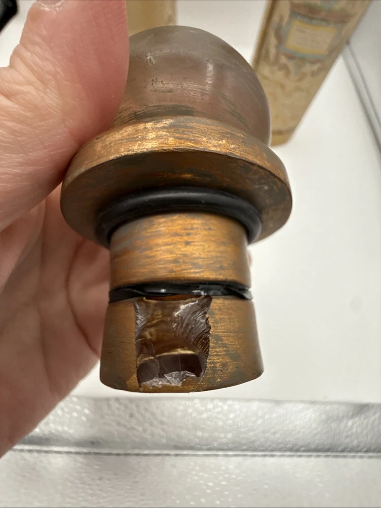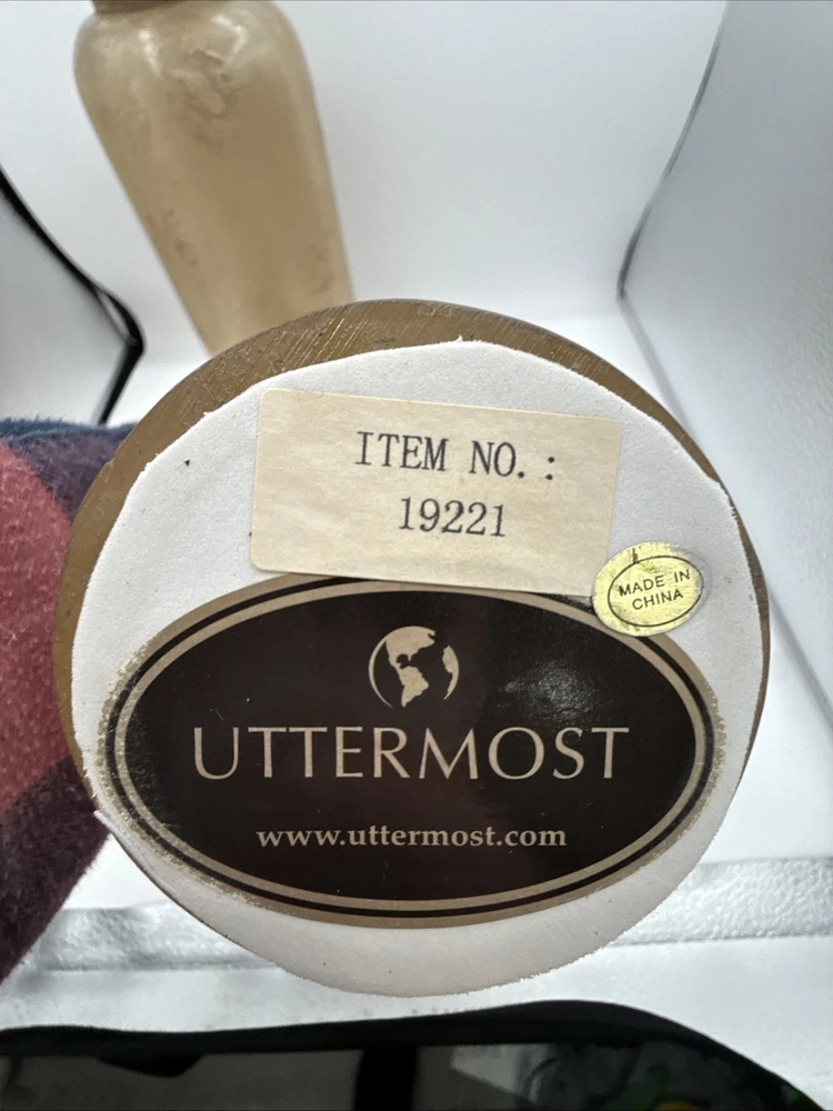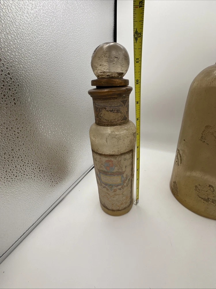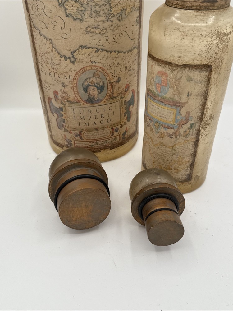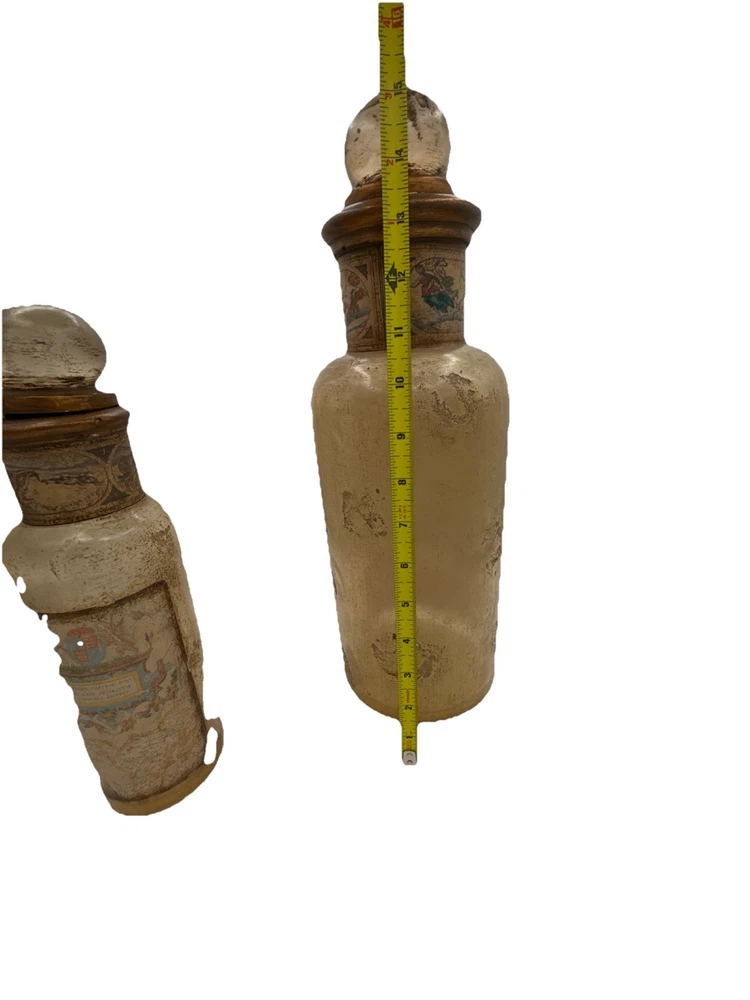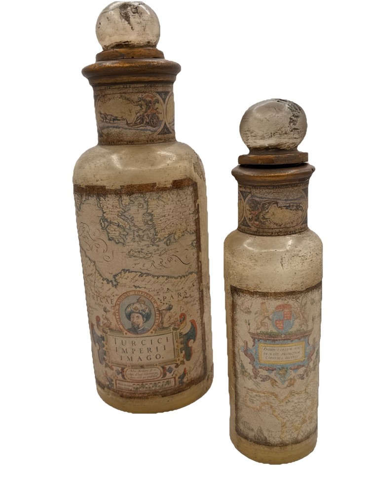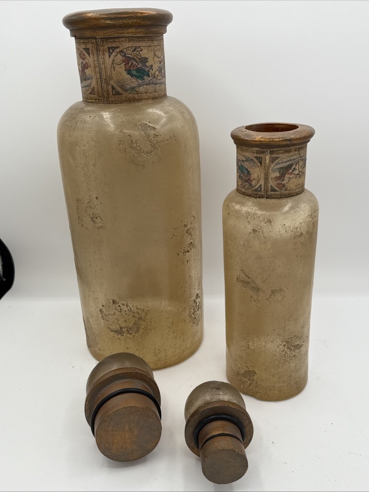 The Pair Uttermost Turkish Empire Bottles with Stoppers are decorative resin bottles with a unique Turkish theme. The multicolor bottles feature an antique finish, adding a touch of elegance to any home decor. These discontinued items from the Uttermost brand are perfect for adding a vintage flair to a space with their distinctive design. See photos for measurements. Chip on inside of small bottle stopper. See photos.