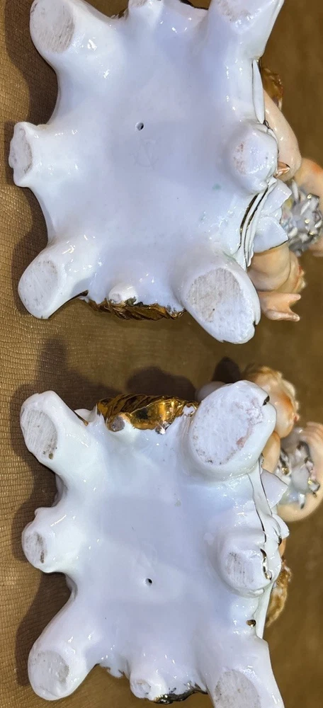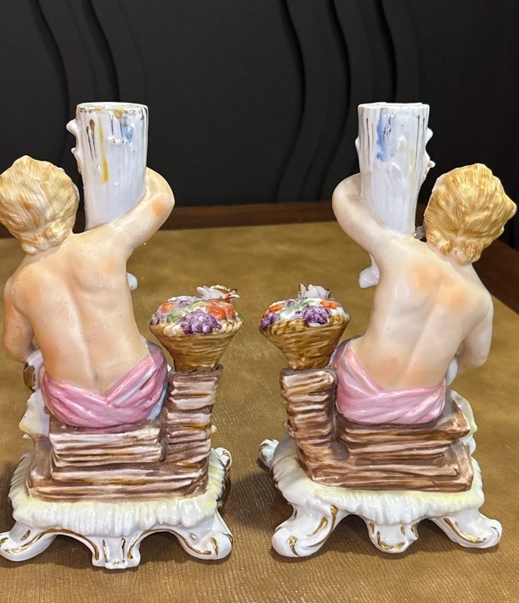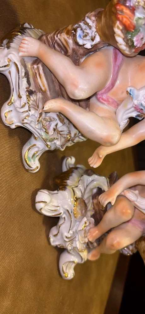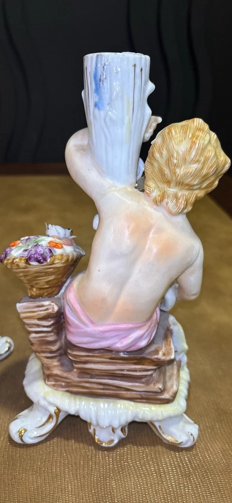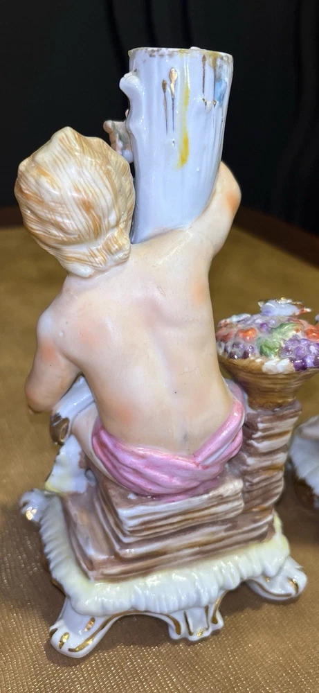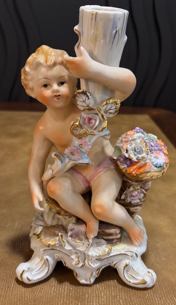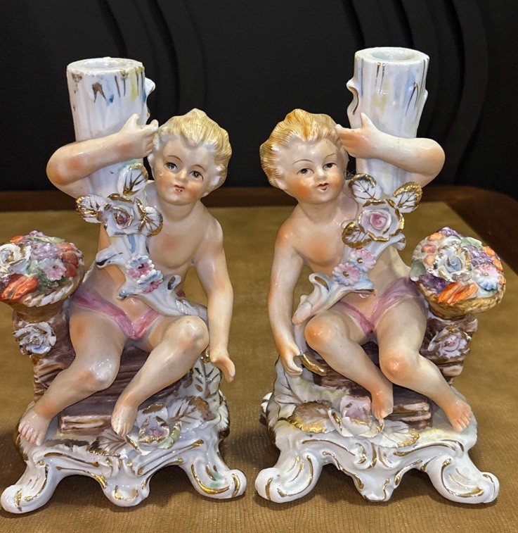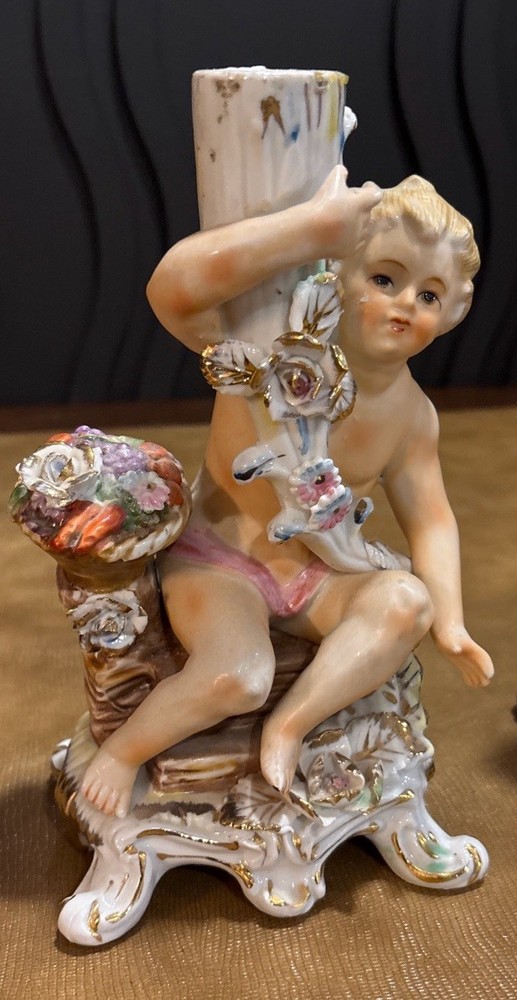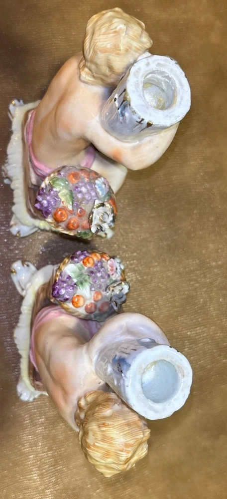 Matched pair of vintage porcelain putti cherub candlesticks in a Rococo-style design. Seated cherub figures with floral details, baskets of flowers, and gilt accents. Designed as a left and right companion pair. Maker is unknown. An impressed mark is present on the underside. Possibly CN. Each candlestick measures approximately 8 inches tall. Please review all photos carefully for condition and details. 🏠Helping special treasures find their new homes. Reasonable offers always welcome! ✨ I take pride in careful packaging to ensure your item arrives safely. Please buy with confidence – I maintain 100% positive feedback.