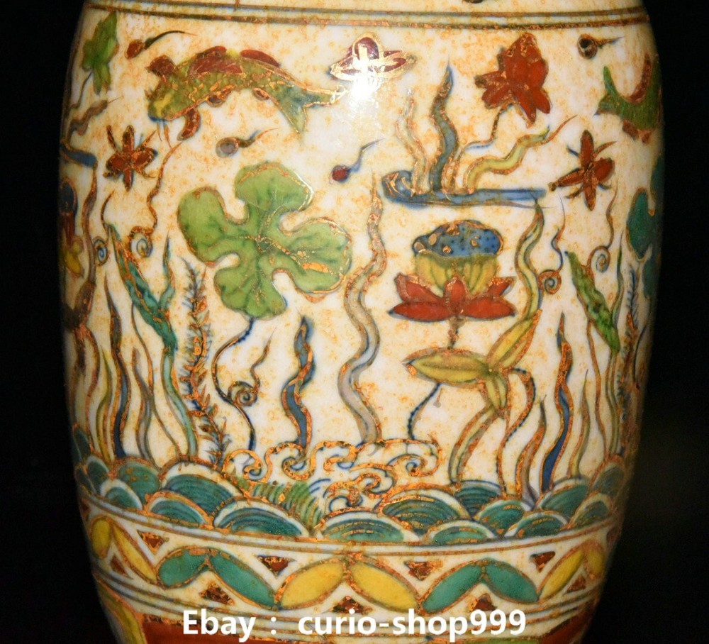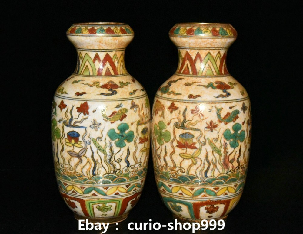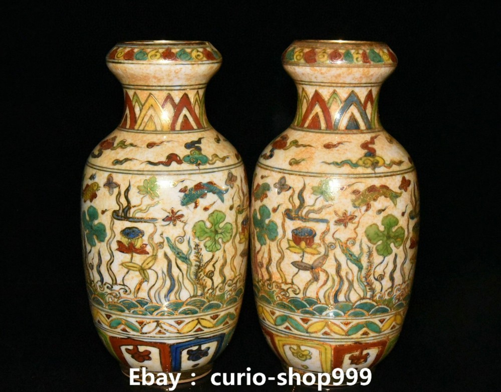 **** Welcome to our antique & Collectable Shop : Porcelain**** Description: Here is 9.5"Ming Chenghua Wucai Porcelain Gilt Lotus Flower Fish Animal Bottle Vase Pair. It is in good condition, and was created by skilled craftsmen in traditional style with fine handcrafts.This is a great piece of valuable collection, a valuable personal alter or a very good present. the handwork is very fine with incredible detailling. Don't miss out this chance to get it.Wish you good luck! . Material : Wucai Porcelain Gilt Size : Heigh t 9.5 Long 5.3 B readth 5.3 (inch) Condition Perfect Condition. Perfect, with no scratches, flaws or repairs. Weight: 3.1 KG----included the weight of packing materials Shipping cost to all over the world countries in Free Honored Customers: We are selling the collectibles products and crafts in Beijing ,China since 1993 and collected them all over the world all the time . In our shop the bronze sculpture, animal, vase, urn, flowerpot,Incense Burner.Table chair sets. Militaria goods. buddha statues, Bodhisattva Statues, Buddhist Ritual Items etc is our speciality .Many of the items we sell come from our own personal collection and have been in our family for a very long time .My great-grandfather was the first in this family to start collecting art & antiques when he still lived in San Xi and Tibet around 1922 ,some of the paintings he once collected can now be seen in museums around the globe.We won't make money from t he shipping cost, if you dislike the item when you receive it,we can refund all of your money to you within thirty days. Please confidence for bidding . We recommend the combine shipping and offer you an big price discount if you order more items together ! 2025.02.09 四 号